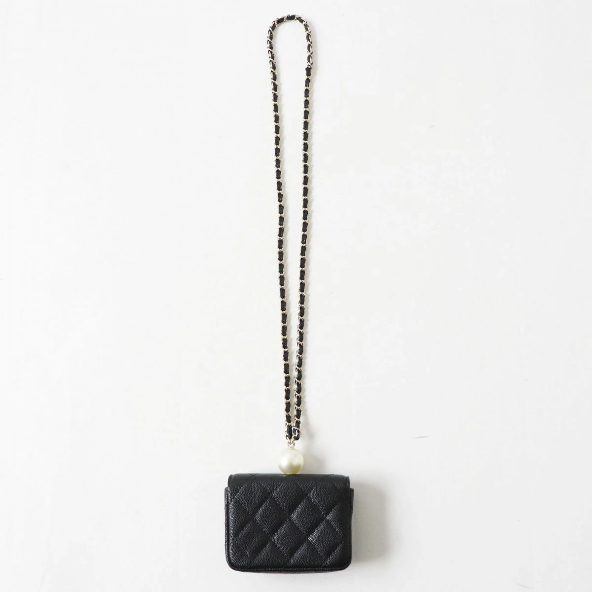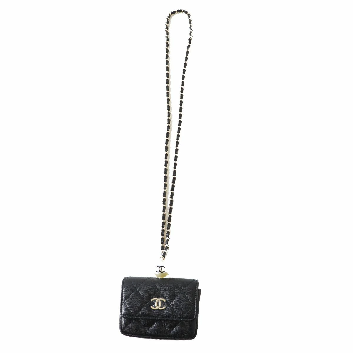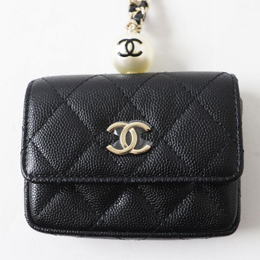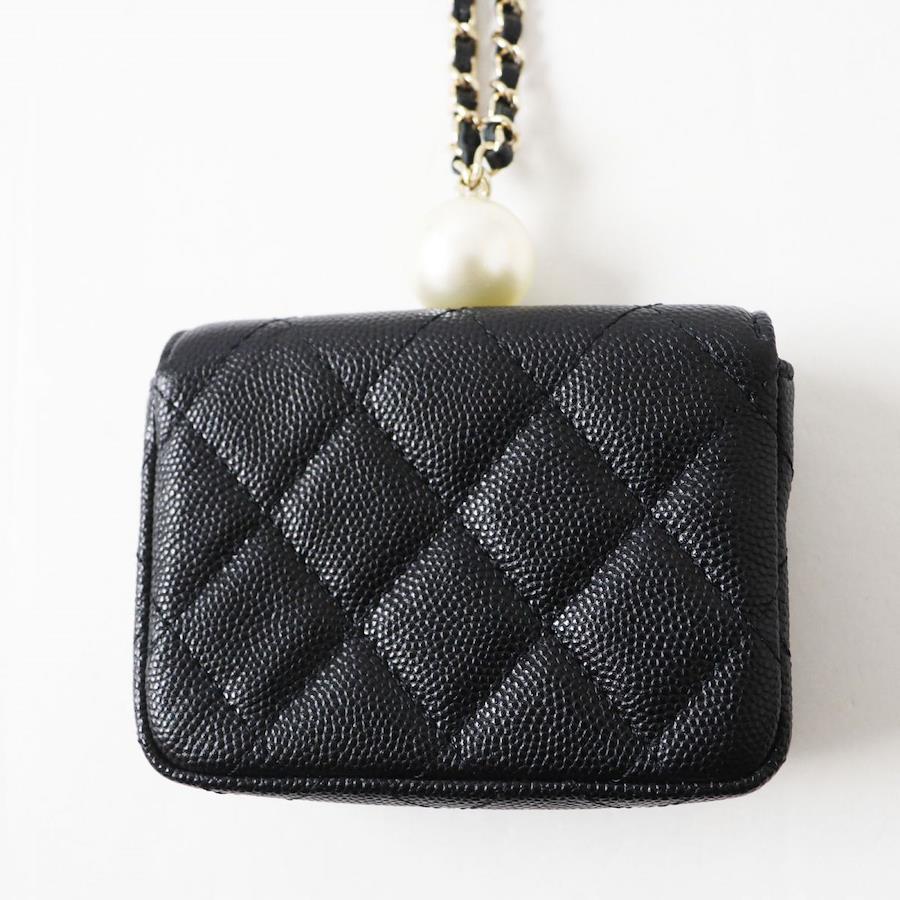 Unused Italian-made Chanel AP2119 Caviar Leather Matelasse Coco Mark Flap Coin Purse with Pearl and Chain Strap, Black, Box and Bag Included [Pre-owned]