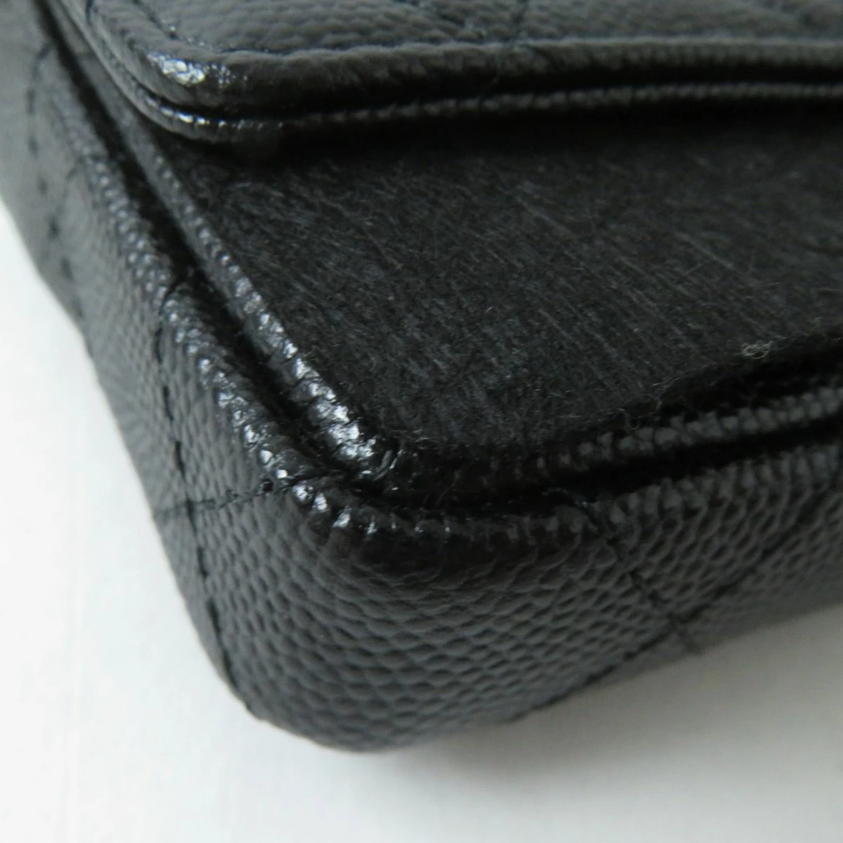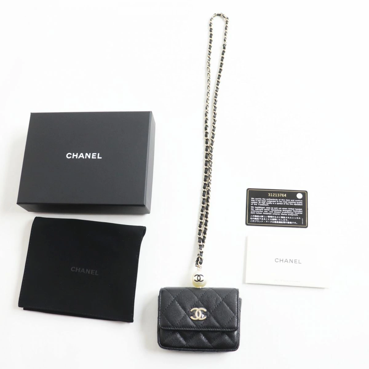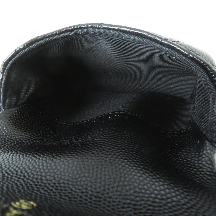 Unused Italian-made Chanel AP2119 Caviar Leather Matelasse Coco Mark Flap Coin Purse with Pearl and Chain Strap, Black, Box and Bag Included [Pre-owned]