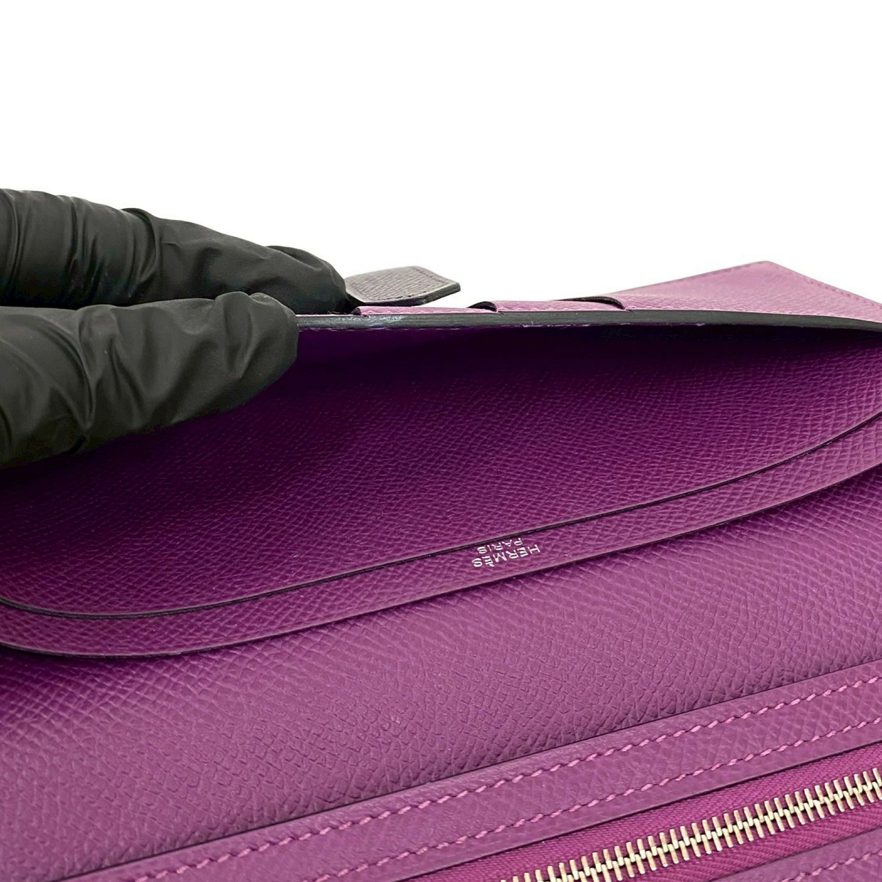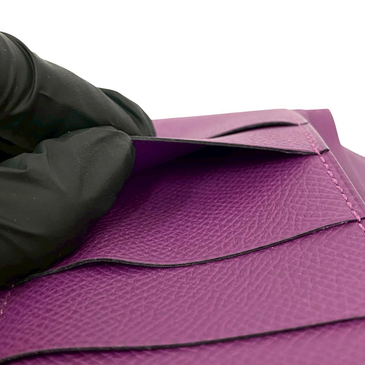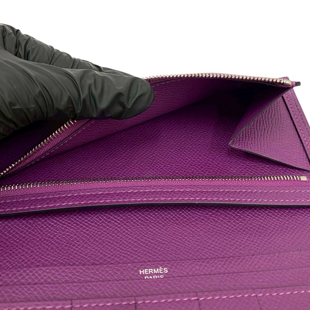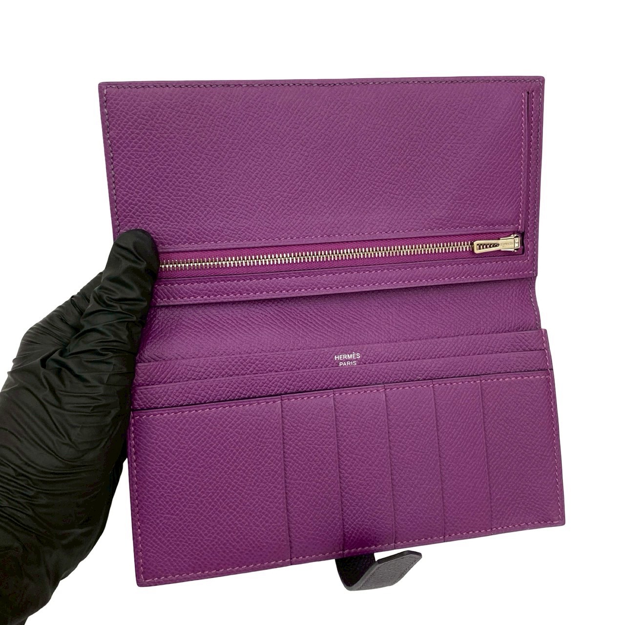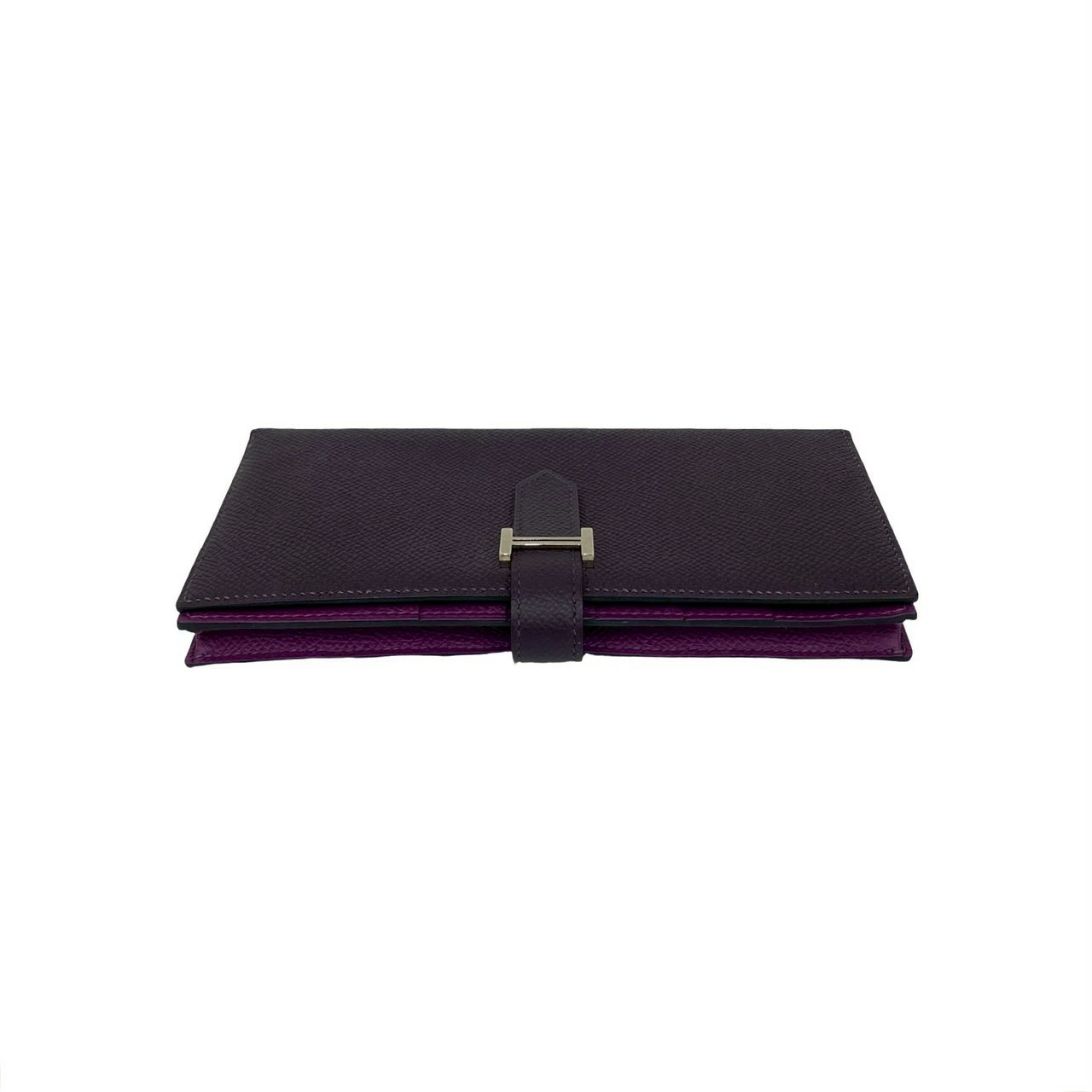 Pre-owned, unused, boxed, with "T" stamp. HERMES Bearn Soufflet Leather Bifold Long Wallet in Epsom Leather, Purple, Item No. 33892.