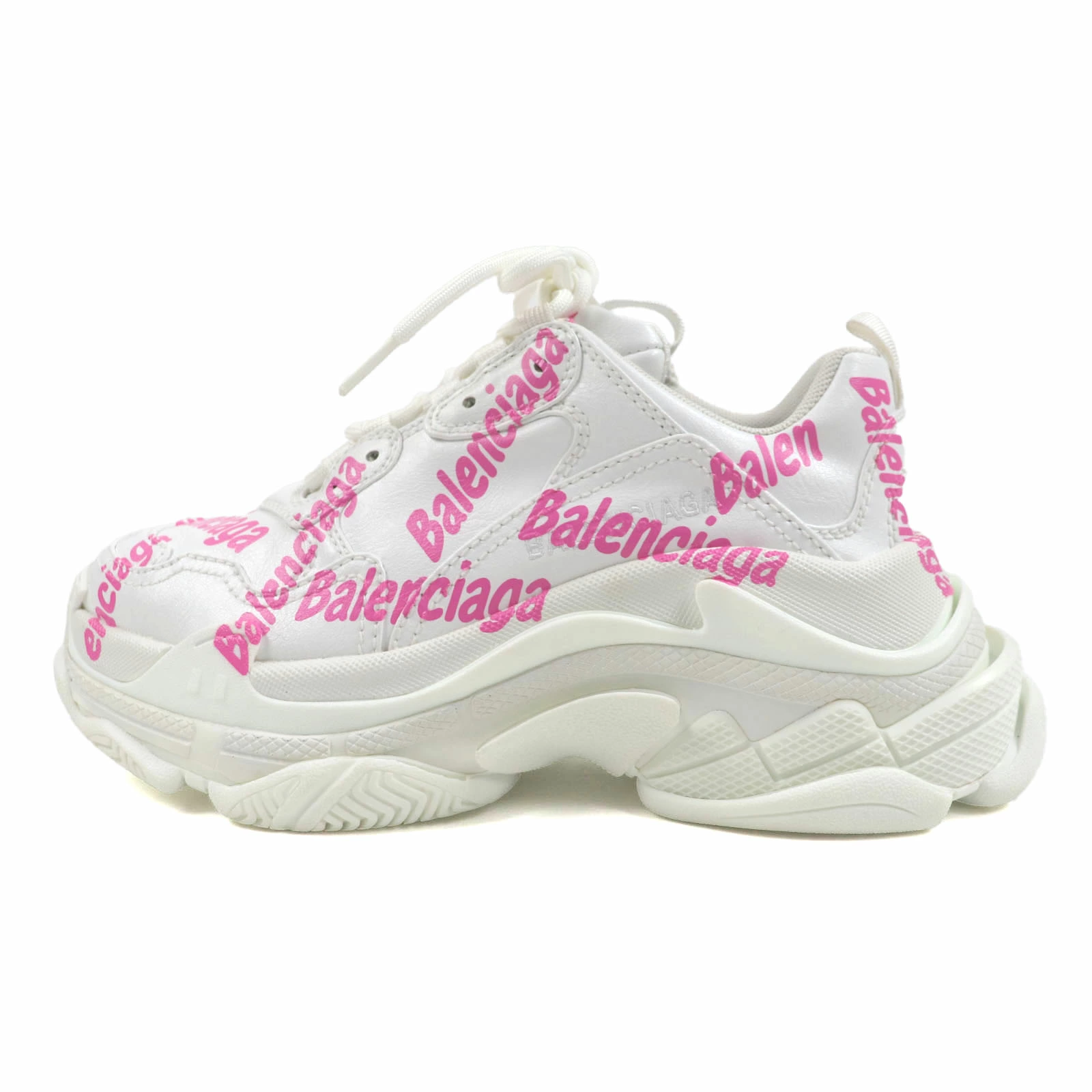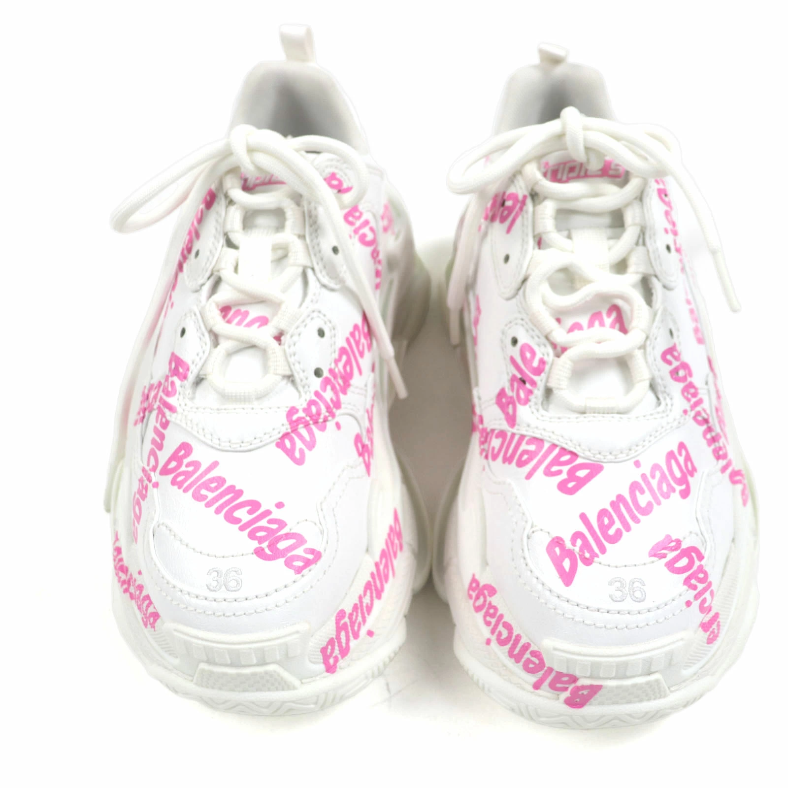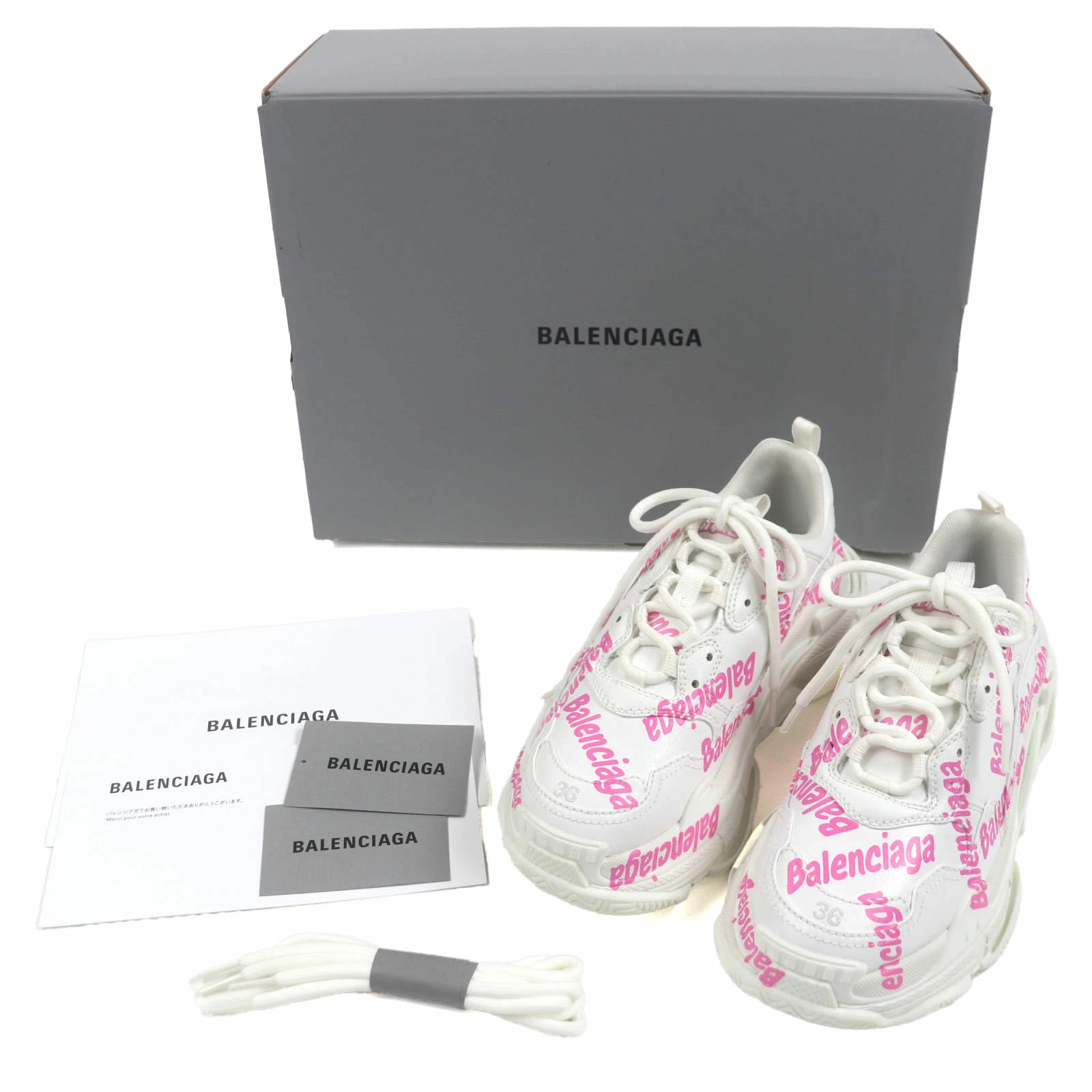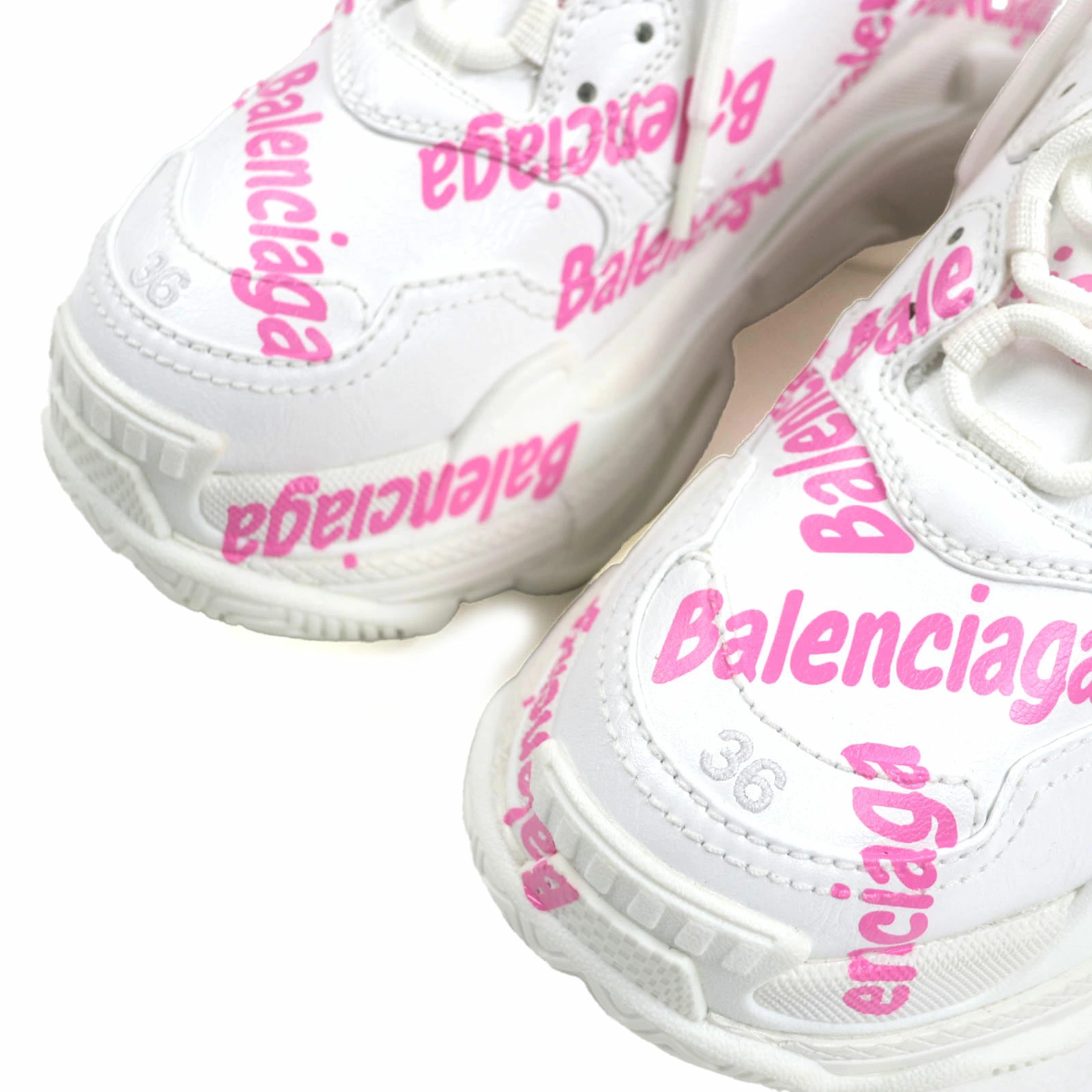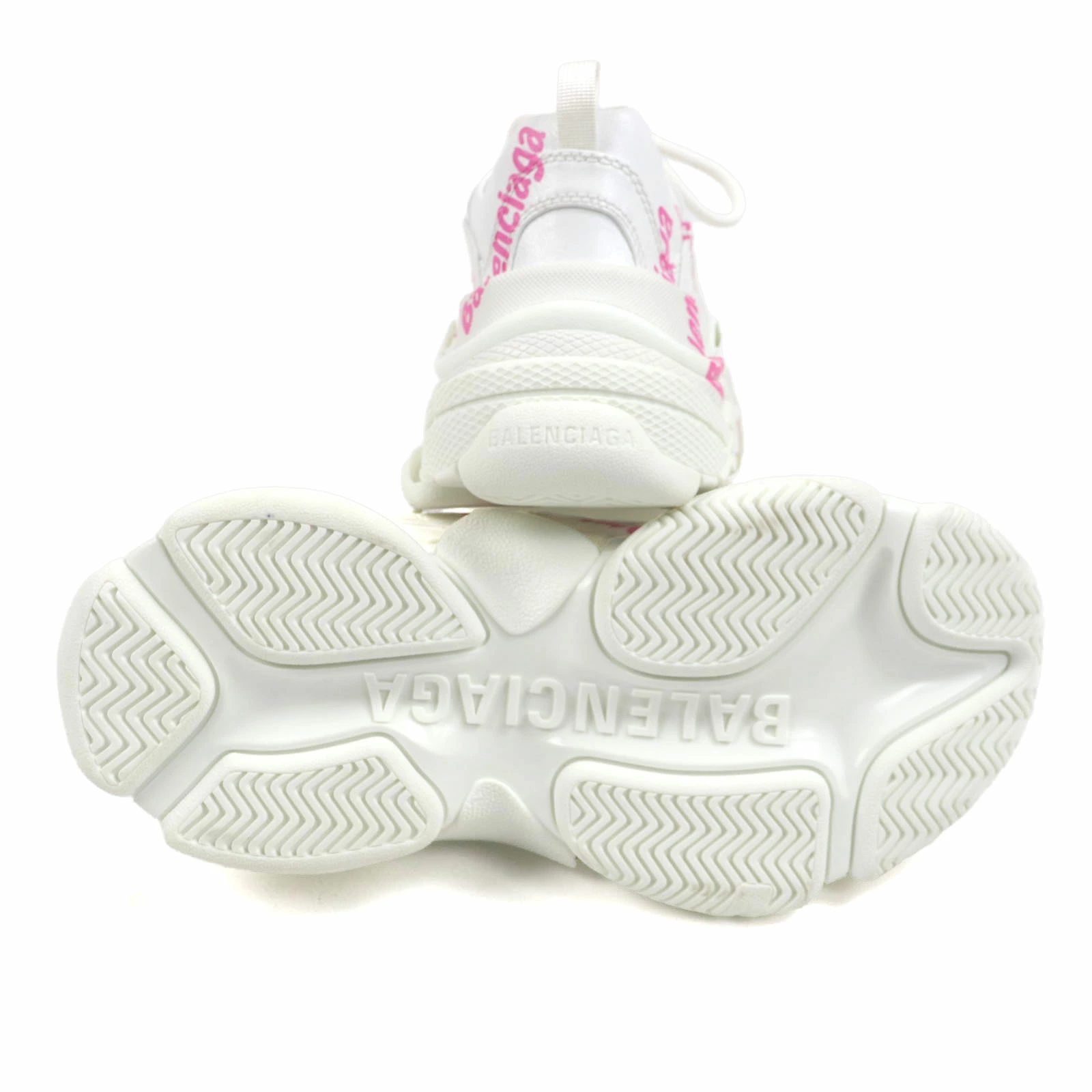 Unused BALENCIAGA 524039 TRIPLE S Leather Sneakers with All-Over Logo Print, White and Pink, Size 36 (24cm), Women's [Pre-owned]