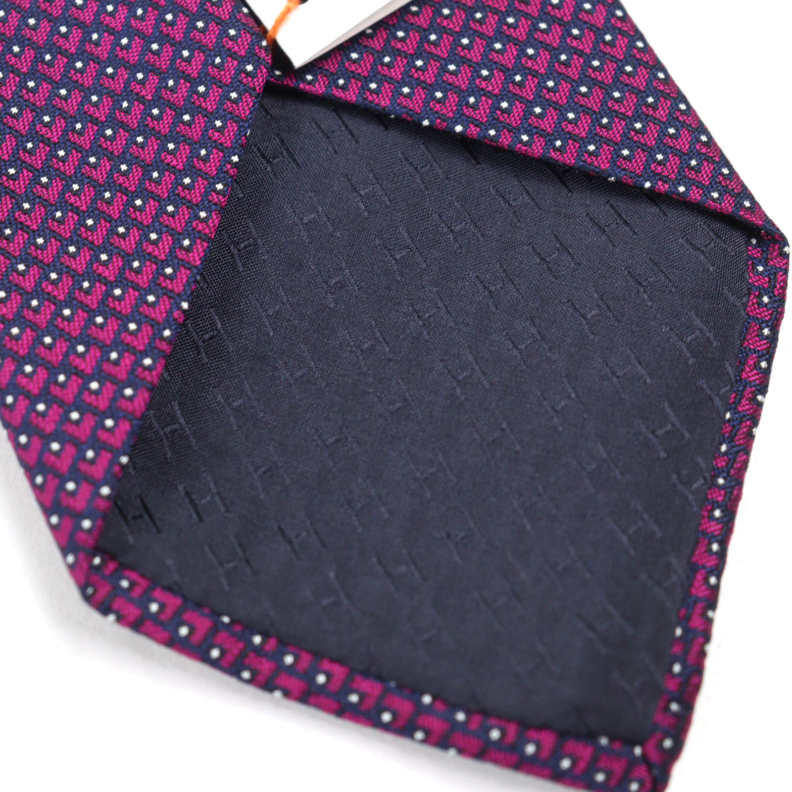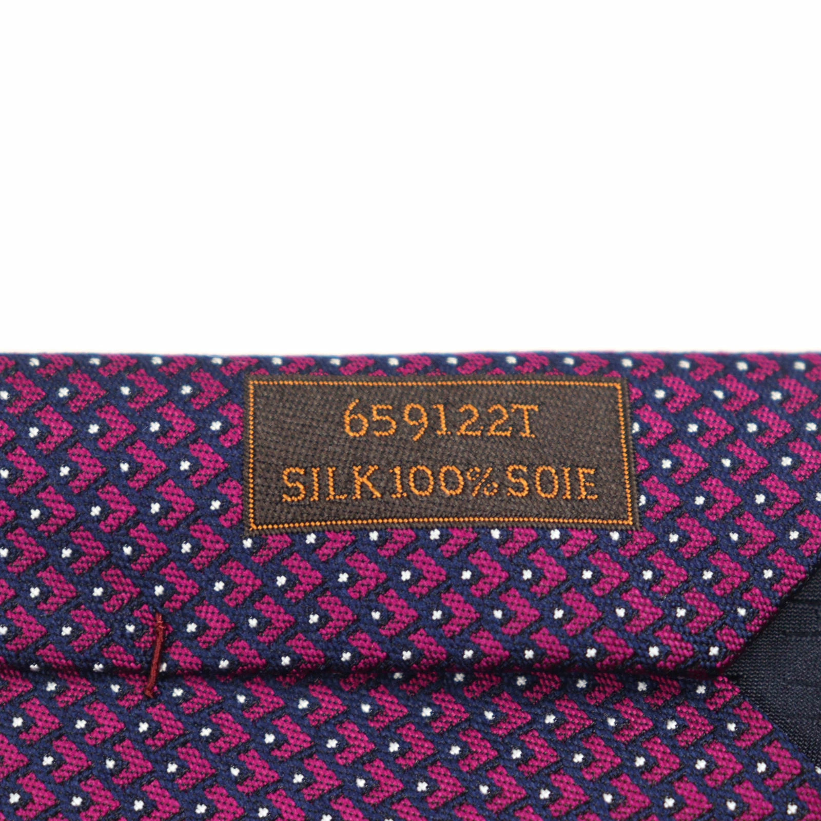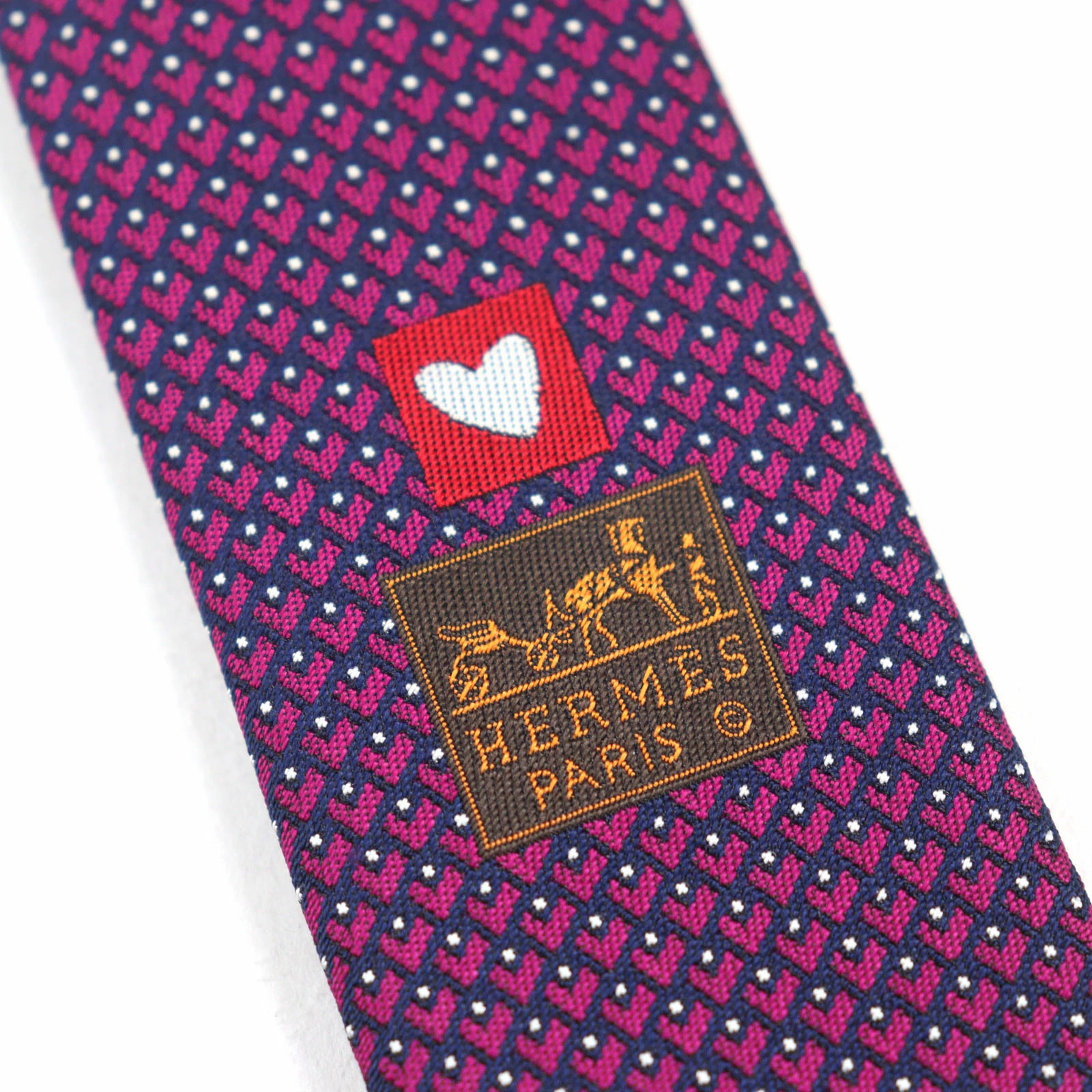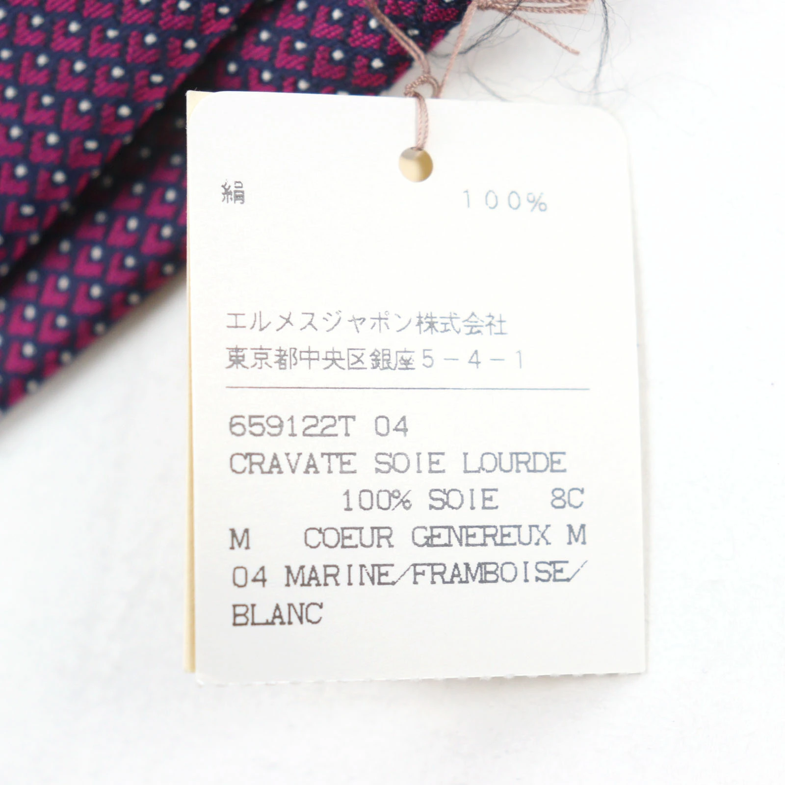 Unused Hermès 659122T CRAVATE 100% Silk Tie by Marine Framboise Blanc, featuring an all-over heart embroidery and an H logo on the lining. Purple. Comes with box. Made in France. Pre-owned.