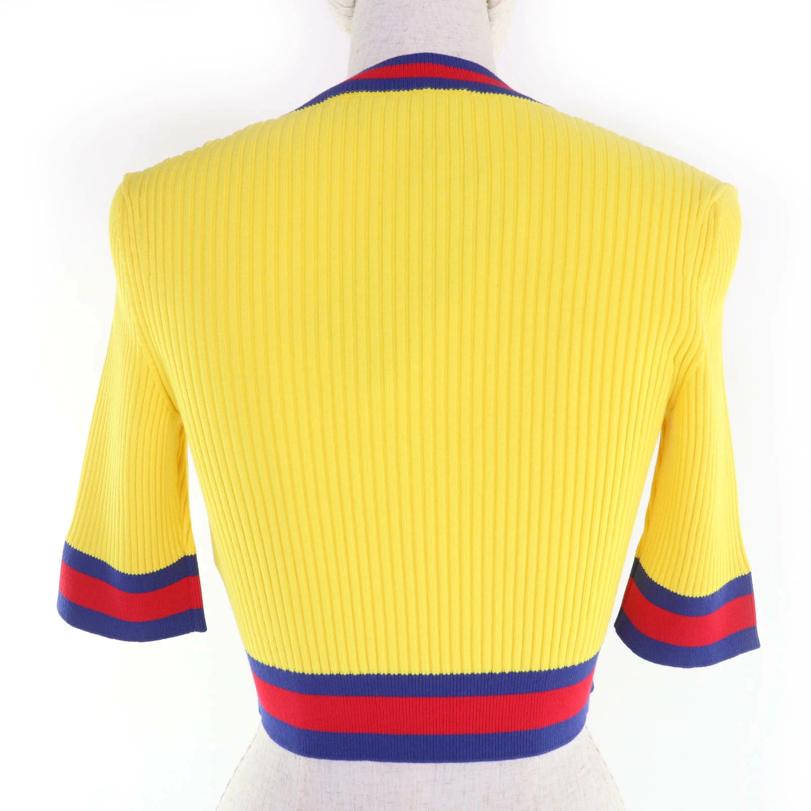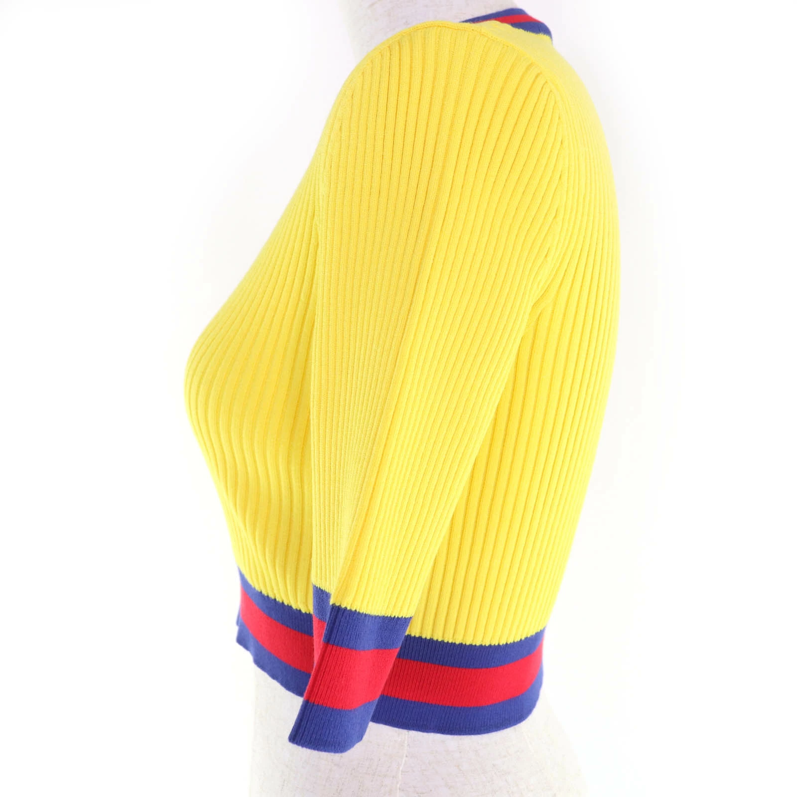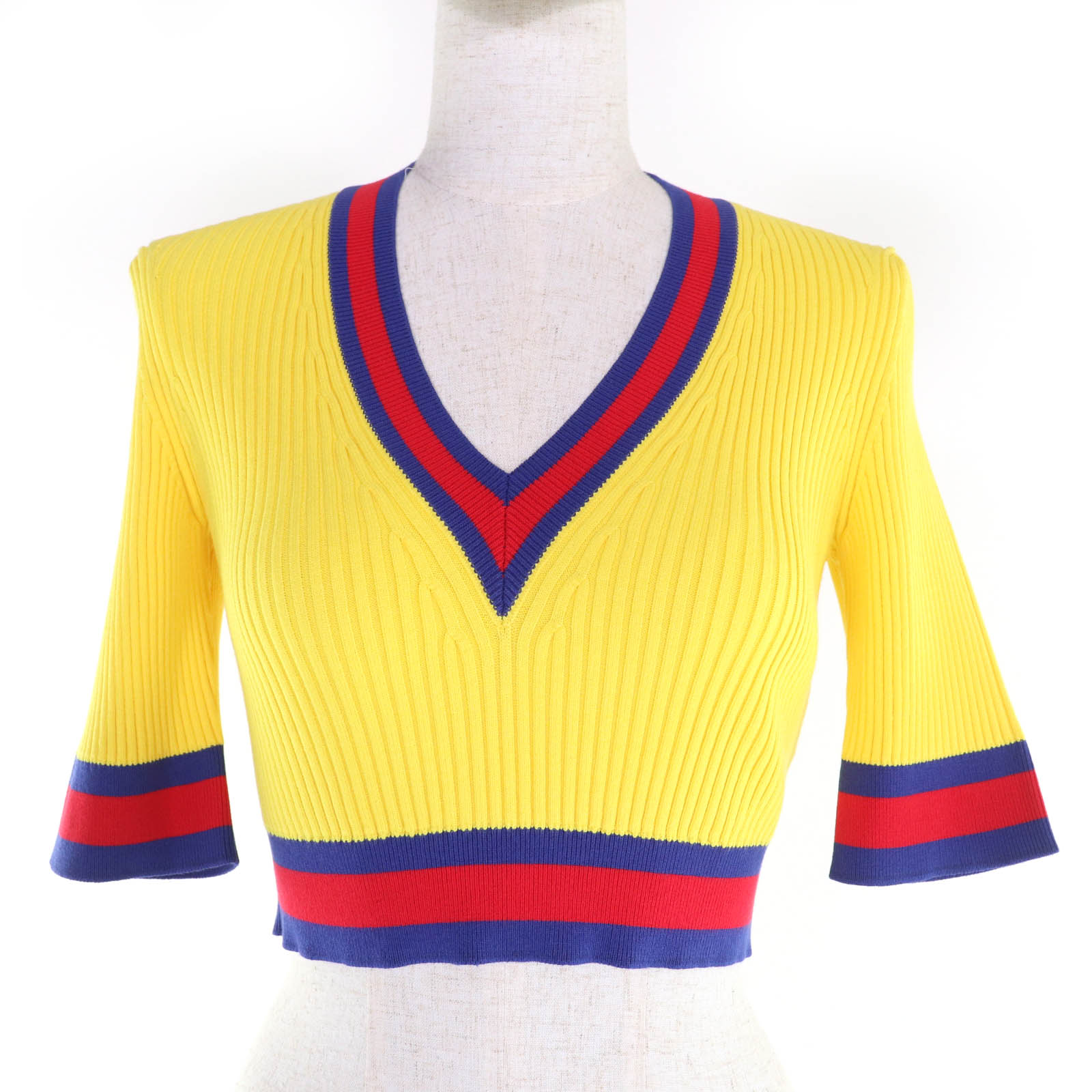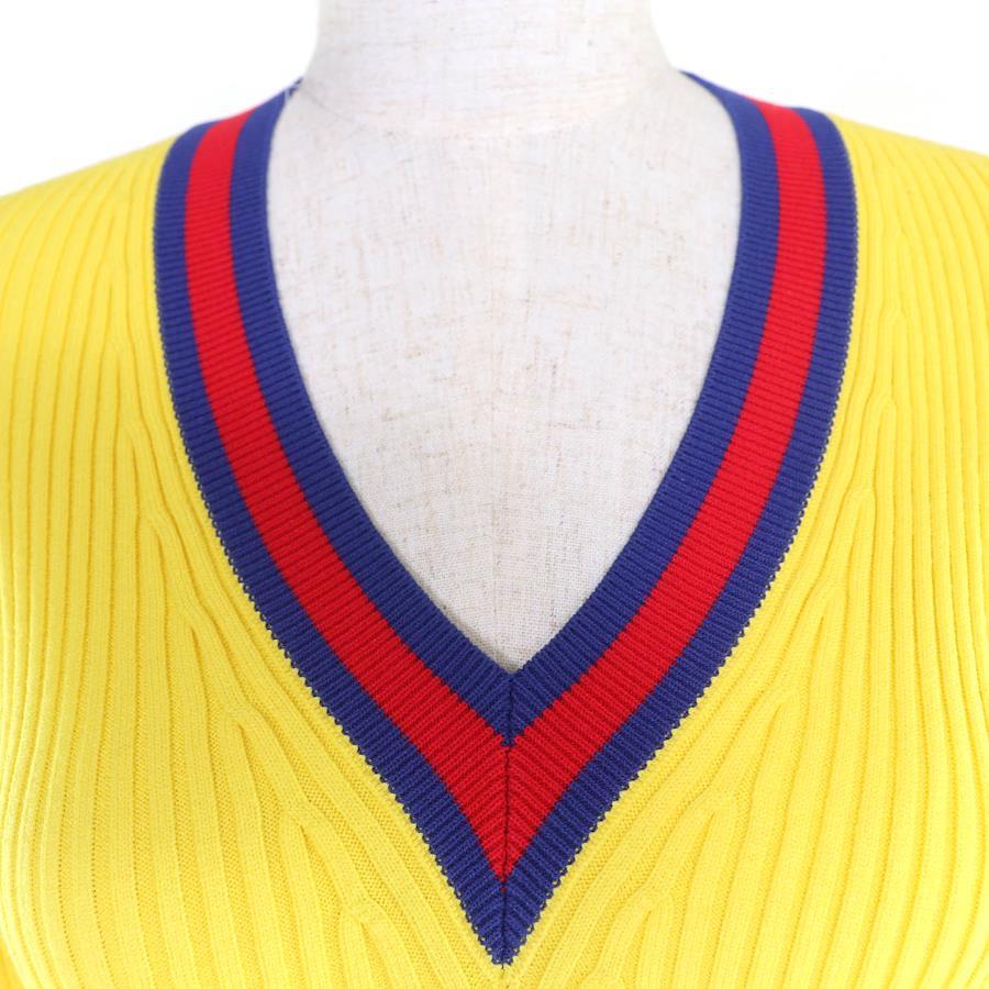 Unused GUCCI 2023 Autumn/Winter 756271 Web-lined V-neck cropped short-sleeve knit top, yellow, size S, made in Italy, authentic, women's [pre-owned]