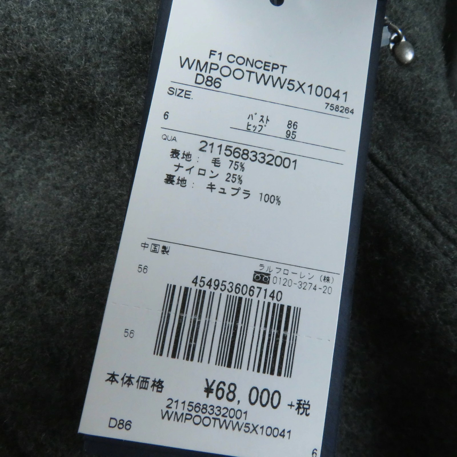 | 素材 (material) | 本体:ウール75% :ナイロン25% 裏地:キュプラ100% | ||||||||||||||||