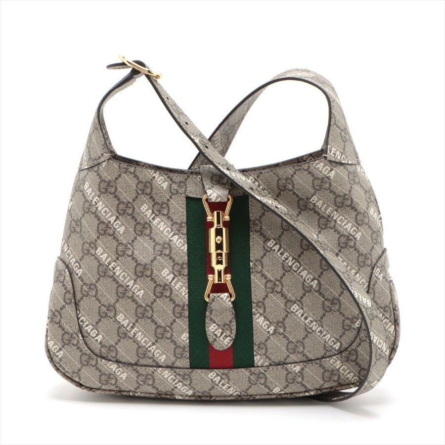 バレンシアガとグッチがコラボレーションしたハッカープロジェクトのショルダーバックです。グッチ人気のジャッキーです。ベーシックなGGスプリーム柄の上にバレンシアガのロゴがプリントされ、グッチ定番のシェリーラインが入ったゴージャスでおしゃれなデザインのバックです。