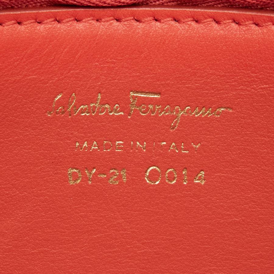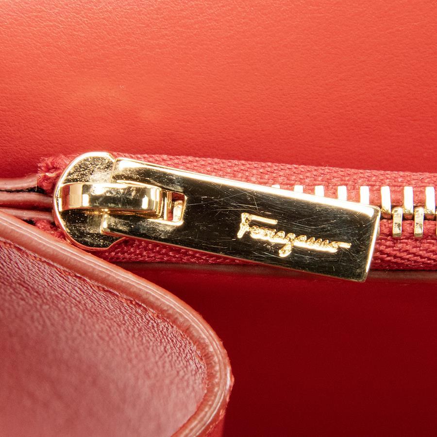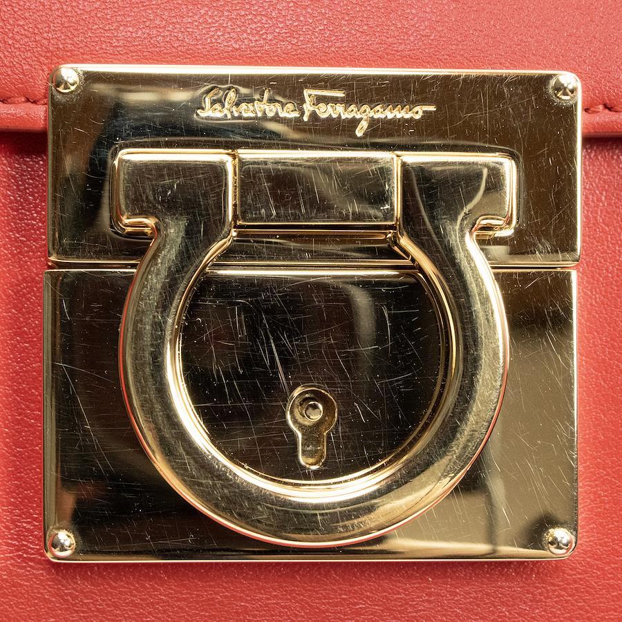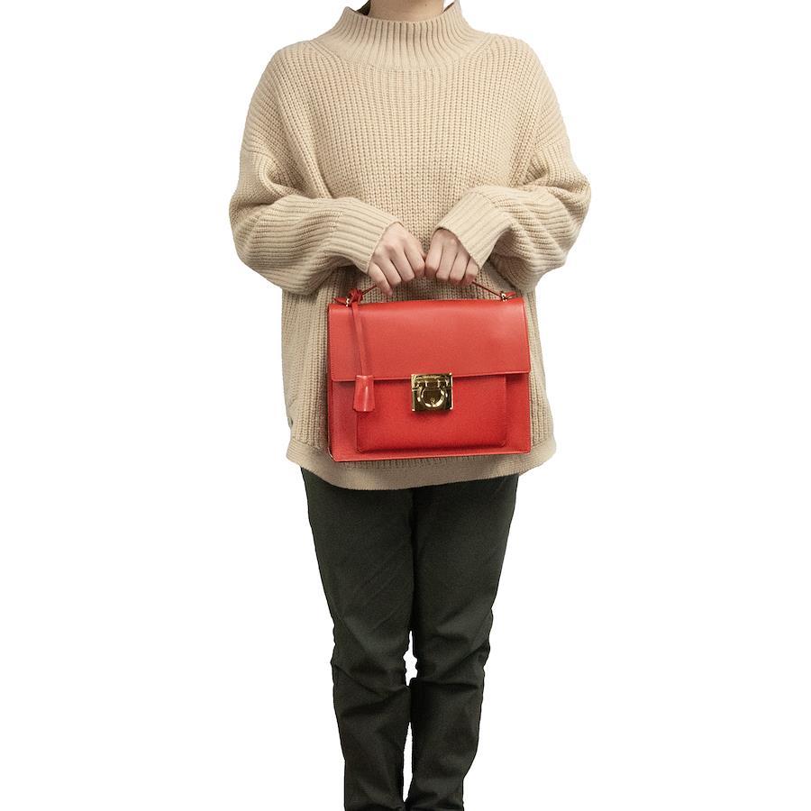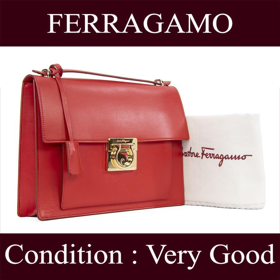 正品 Ferragamo 女士手提包,小牛皮 Gancini 皮革,紅色,流行且稀有,標誌,金色五金配件,獨立,結構精美,包包 F221