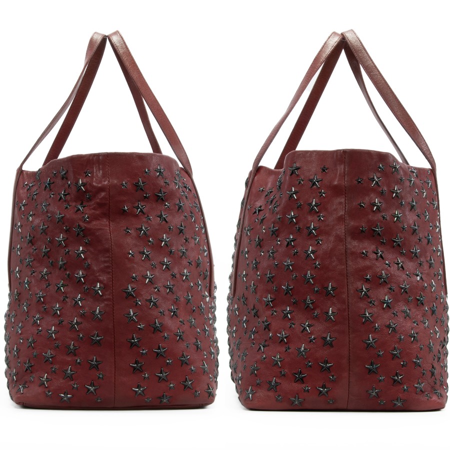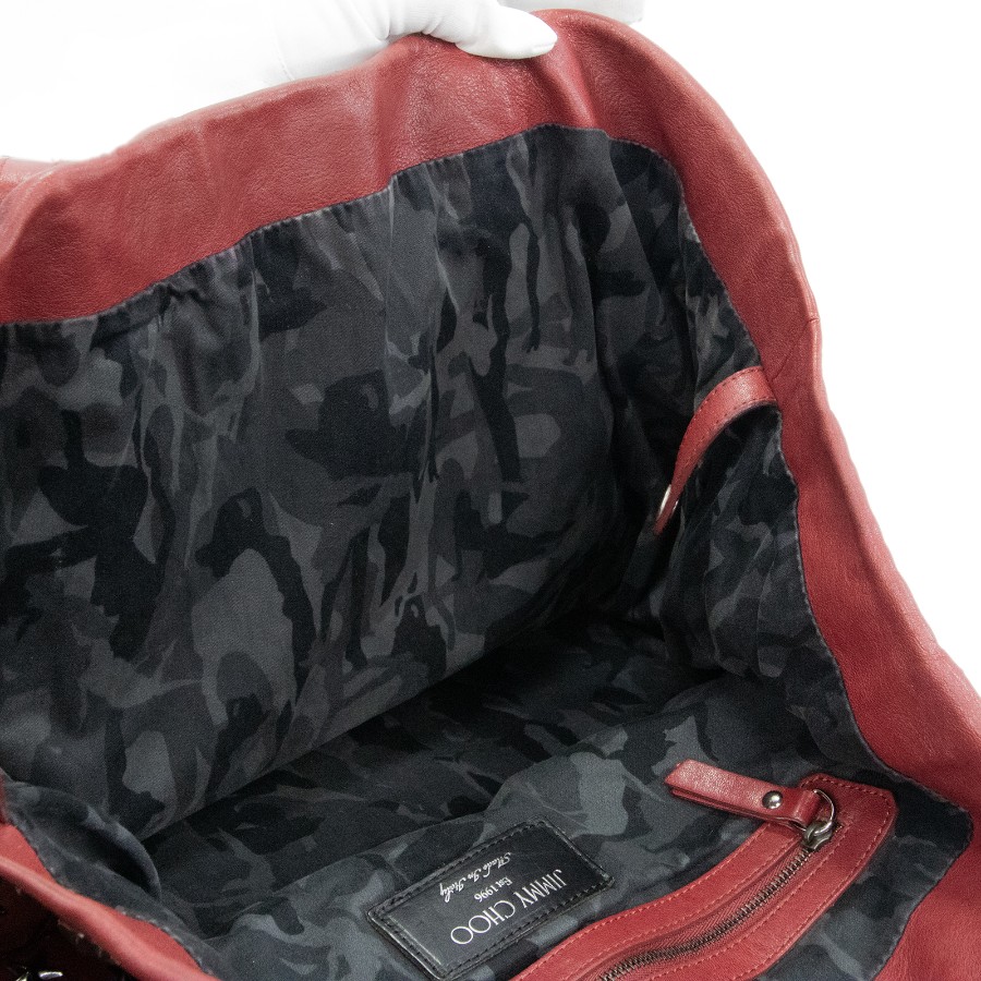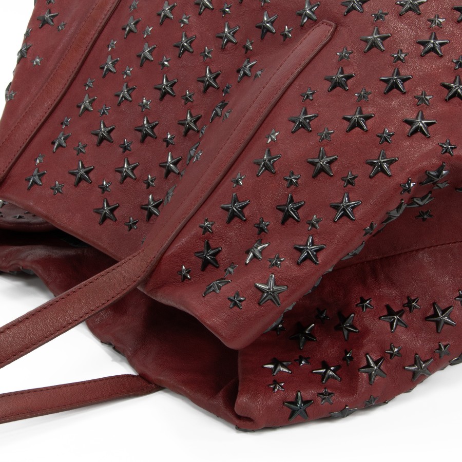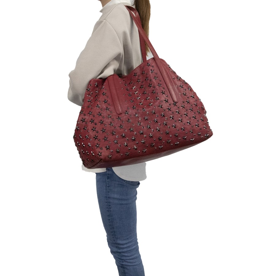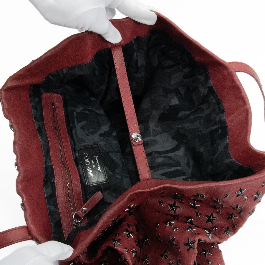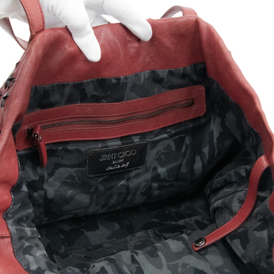 正品 JIMMY CHOO 手提包/托特包/肩包,男女通用,小牛皮材質,Pimlico L 碼,紅色,熱門稀有款式,Y2K、00 年代、90 年代風格,可容納 A4 紙張,旅行必備,大容量,飾有星形鉚釘,迷彩圖案,真皮材質,美觀大方,灰色五金配件,高端品牌,7