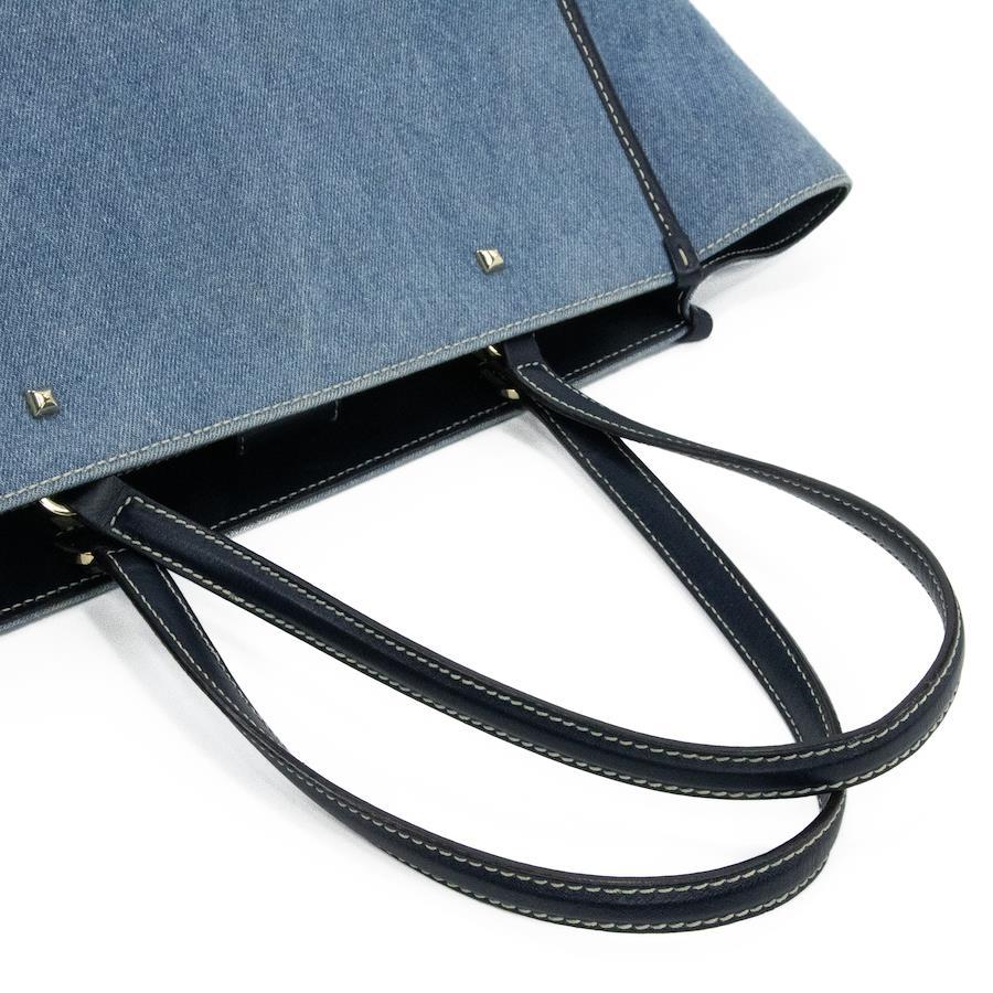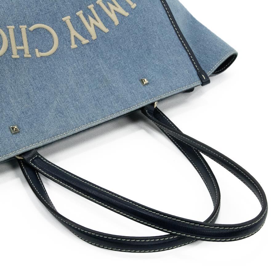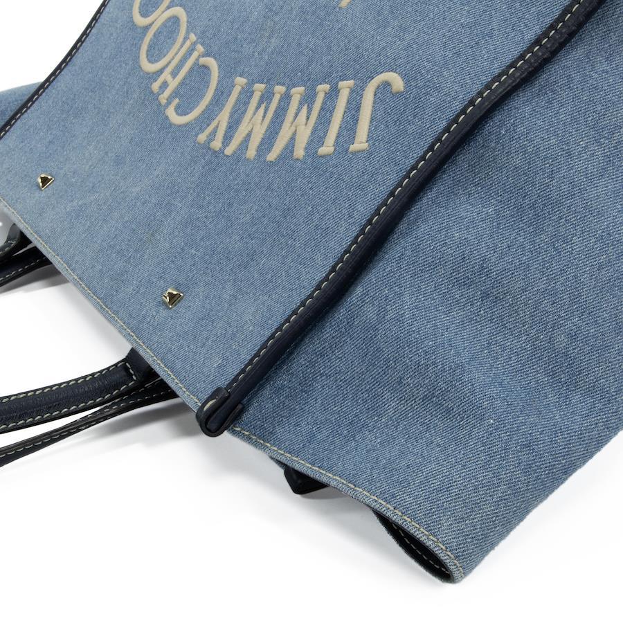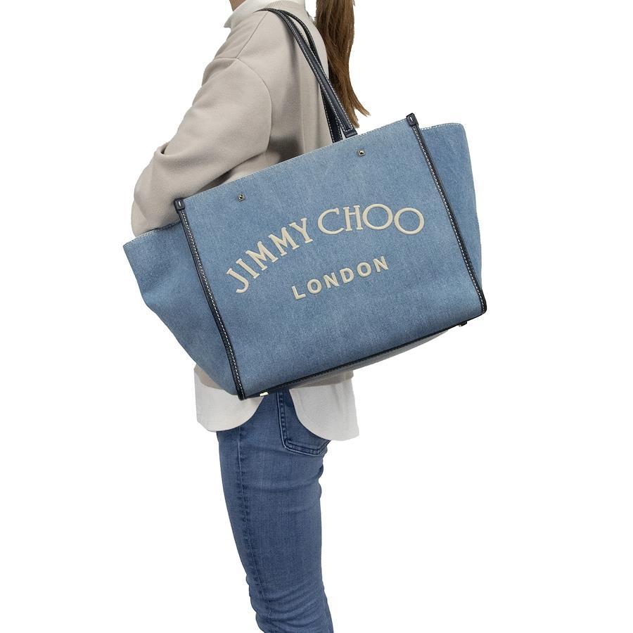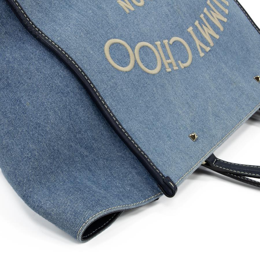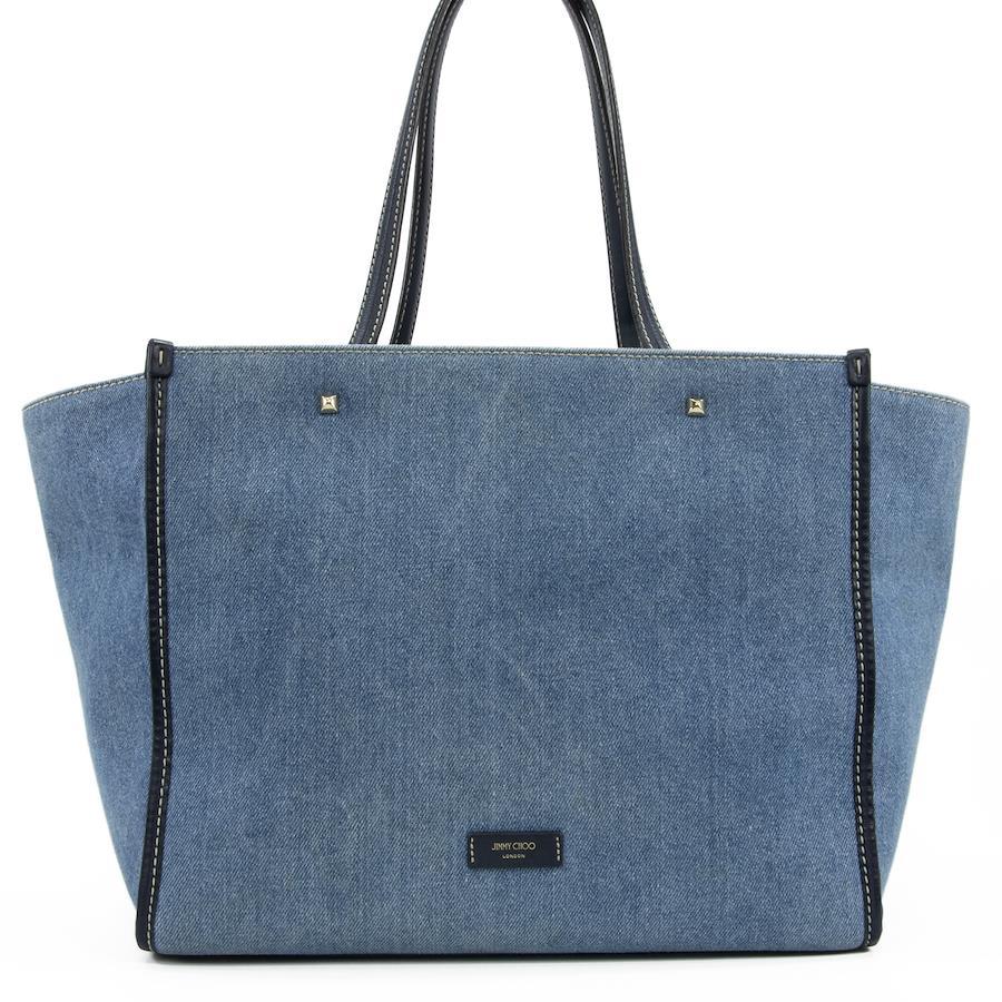 正品 JIMMY CHOO 手提包、托特包、肩背包,男女皆宜。 Varenne 托特包,淺藍色、米白色和藏藍色牛仔小牛皮材質。稀有獨特款式。可容納 A4 紙張,適合通勤和旅行。大容量,飾有超大 logo。真皮材質,搭配精美銀色五金配件。高端品牌。時尚包款。 B327