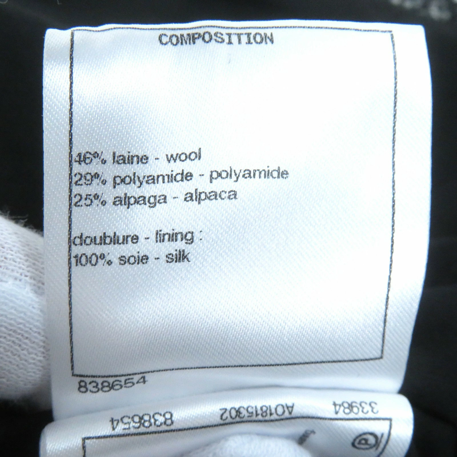 | 素材 (material) | 表地:ウール46% :ポリアミド(ナイロン)29% :アルパカ25% 裏地:シルク100% 表地:ウール46% :ポリアミド(ナイロン)29% :アルパカ25% 裏地:シルク100% | ||||||||||||||||