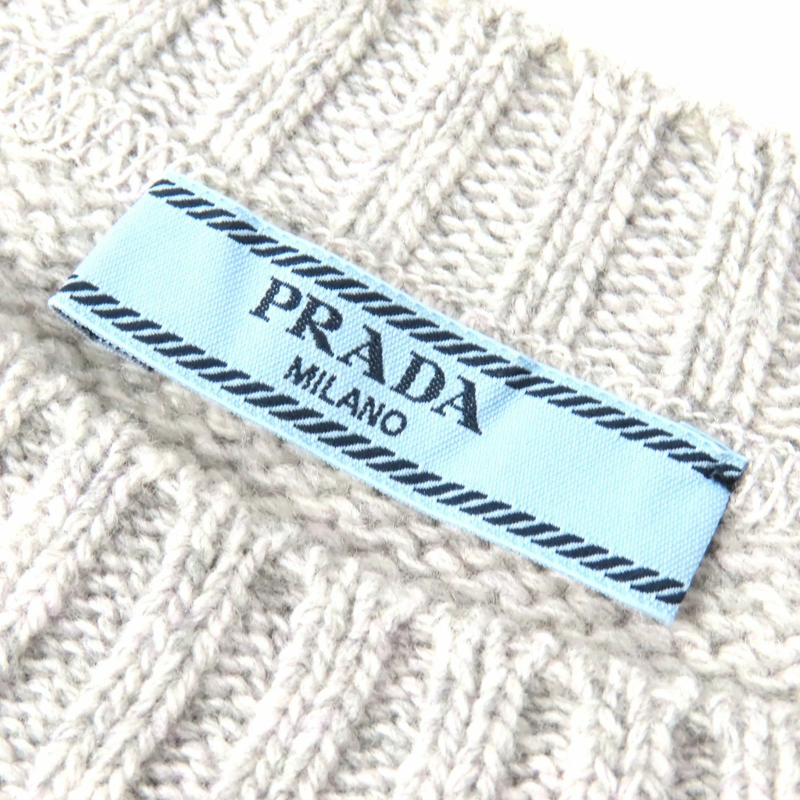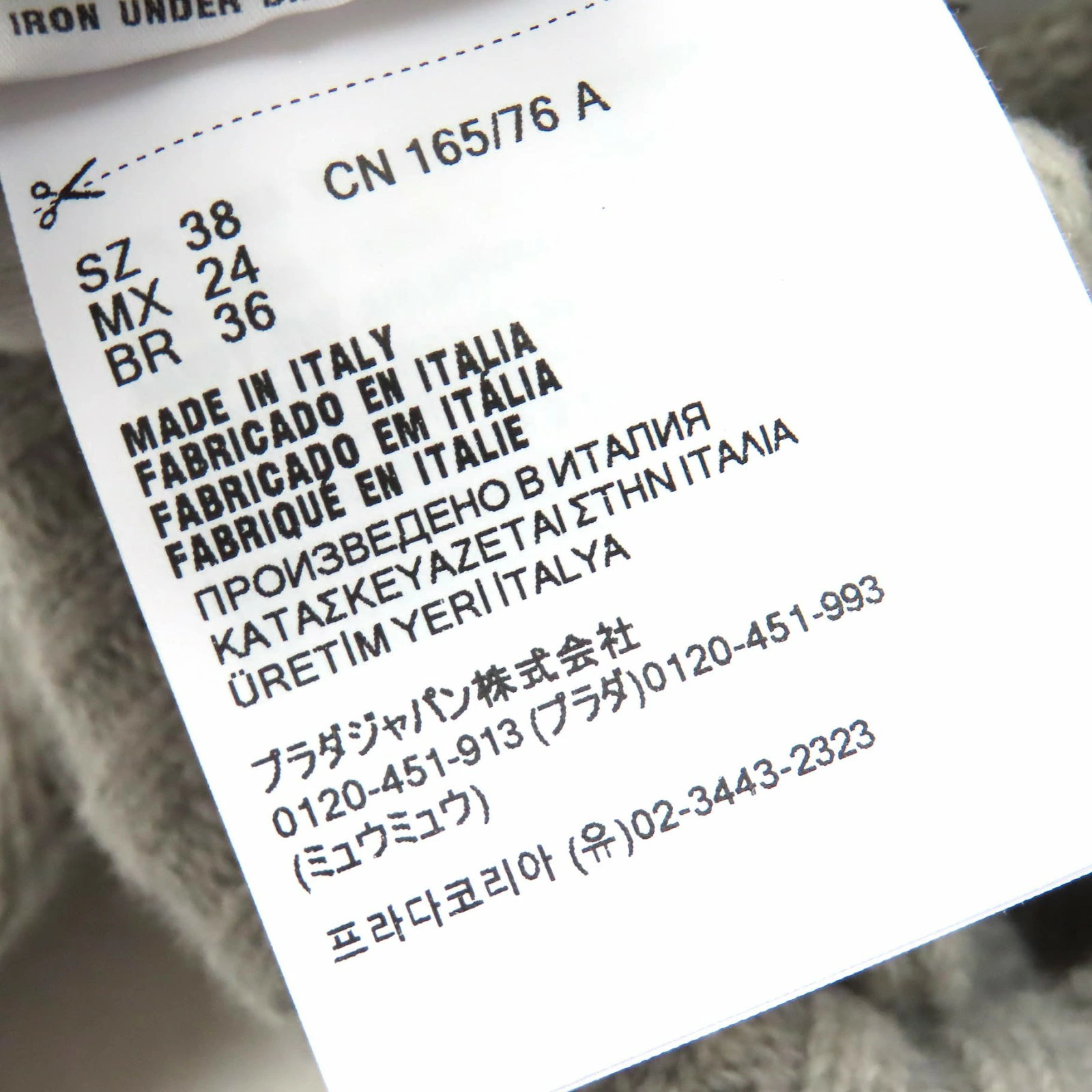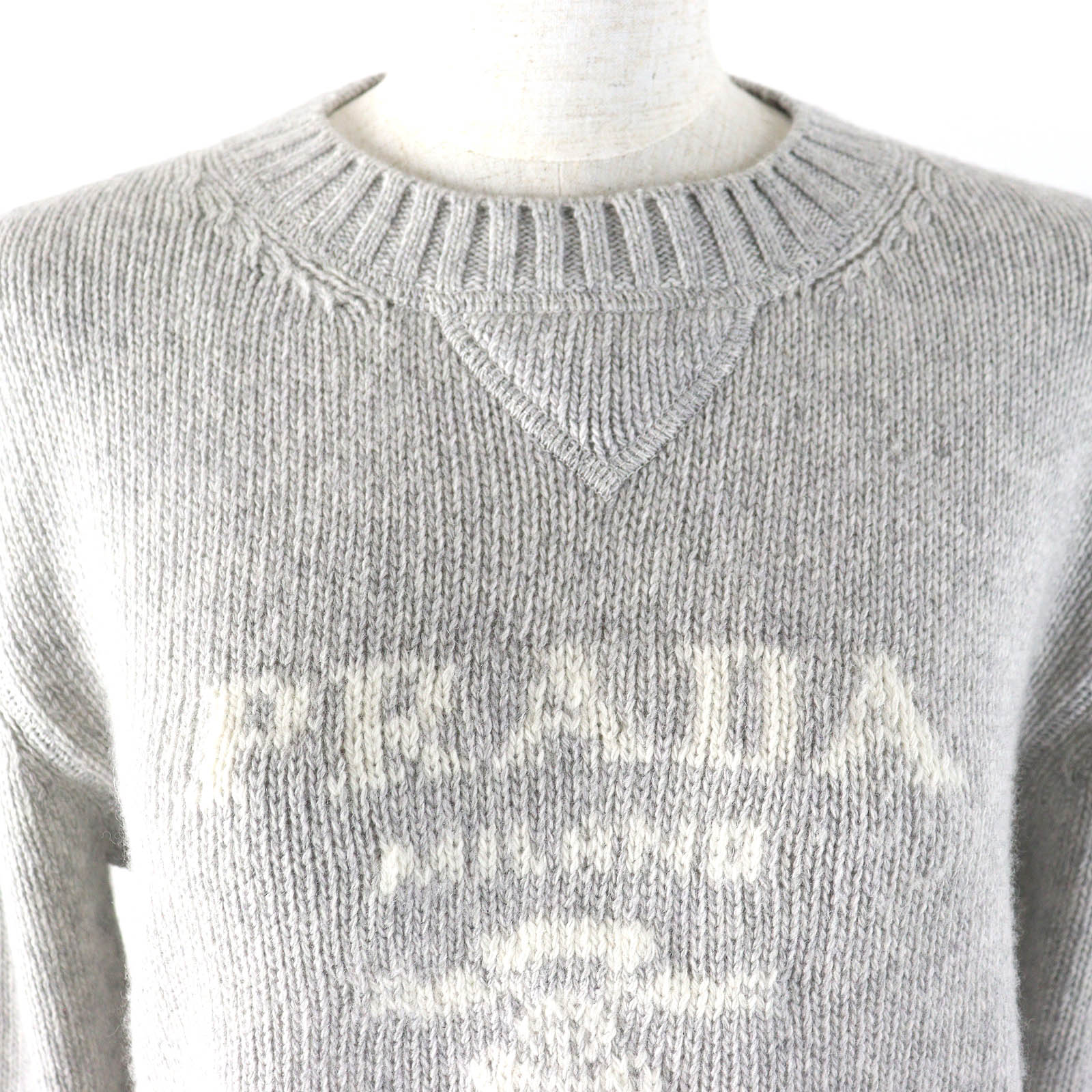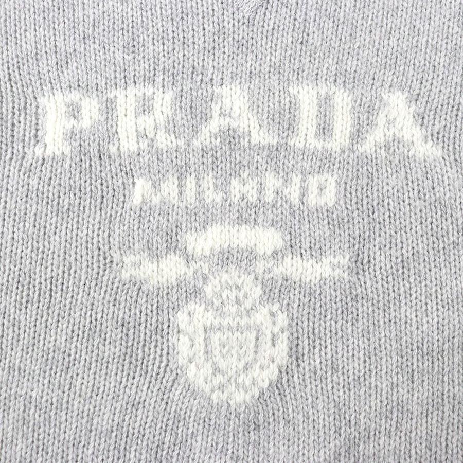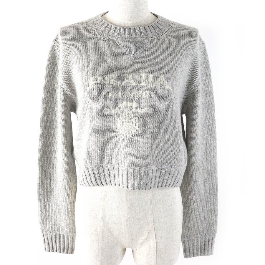Excellent condition PRADA Prada 2024 P24U1T virgin wool cashmere logo box silhouette crew neck cropped knit sweater in light gray and white, size 38, made in Italy. Authentic. Recommended for women. [Pre-owned]