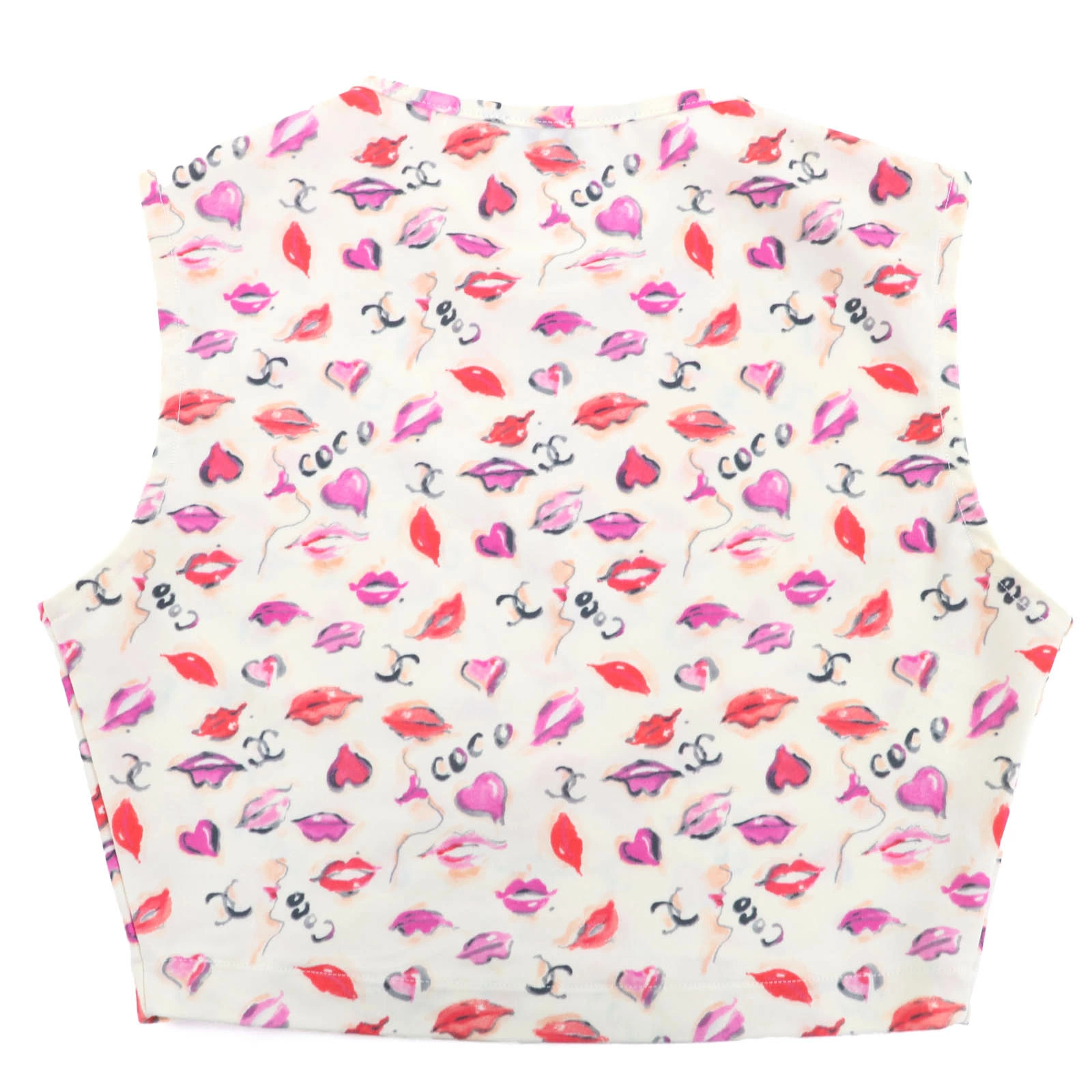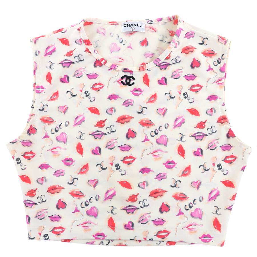 Excellent condition CHANEL vintage Coco Mark embroidered lip print cropped tank top in off-white multicolor, size 38, women's. Pre-owned.