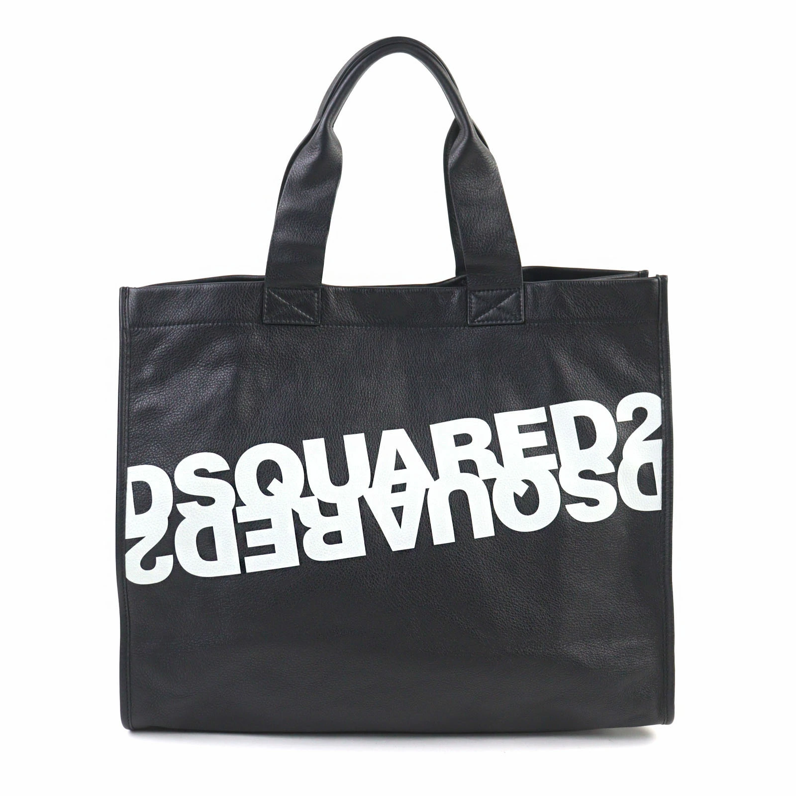 Excellent condition: DSQUARED2 leather tote bag with logo print and pouch, black and white, made in Italy. Recommended for men. [Pre-owned]