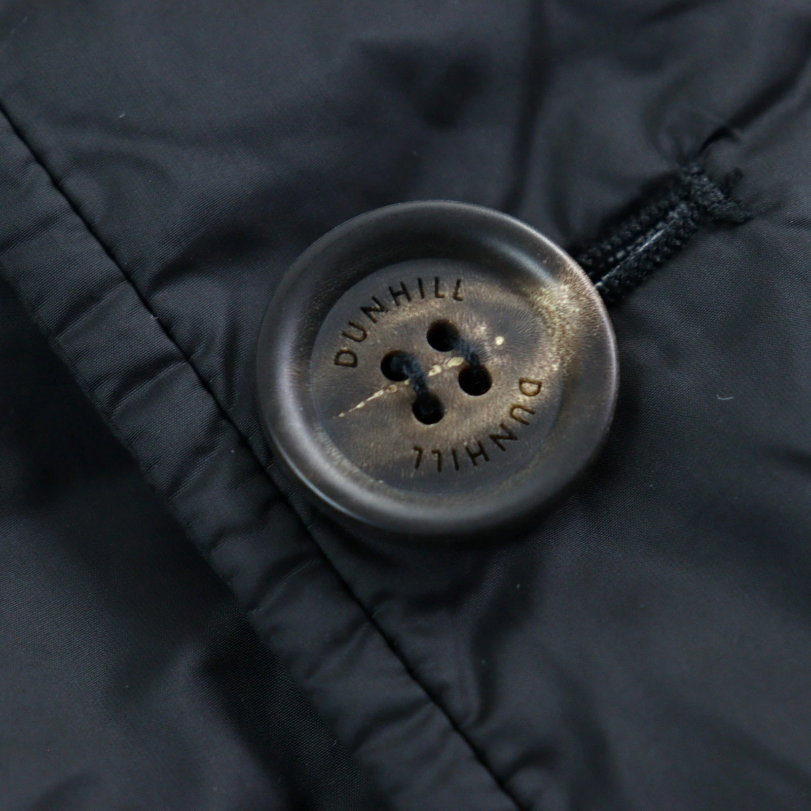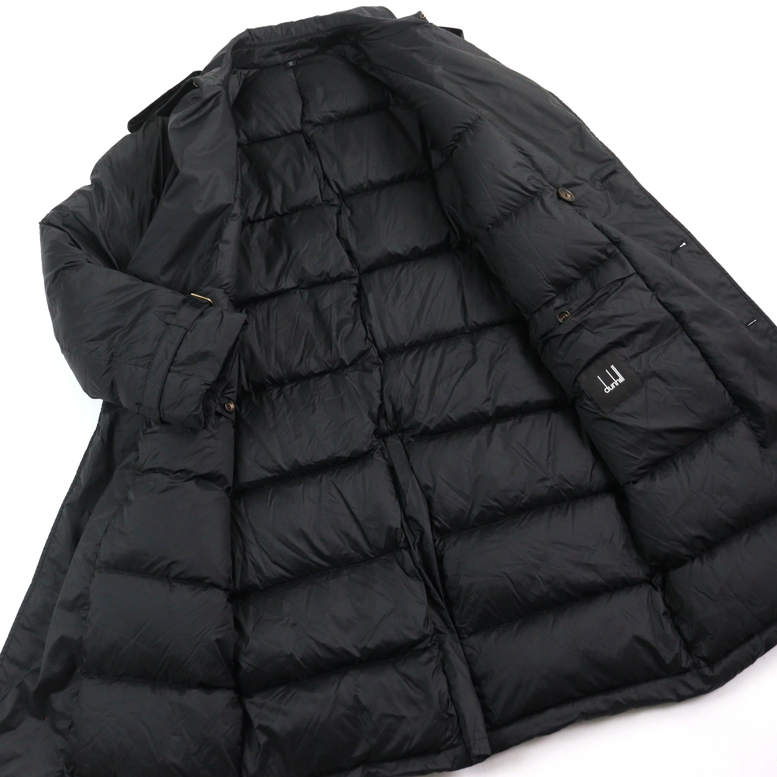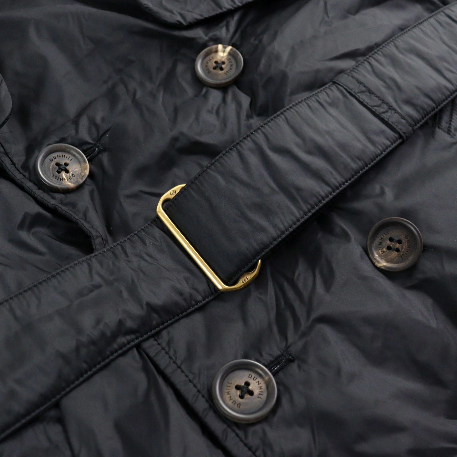Excellent condition Dunhill down trench coat with logo buttons, belt, chin strap, and epaulettes. Black, size S. Made in Italy. Authentic. Men's. [Pre-owned]