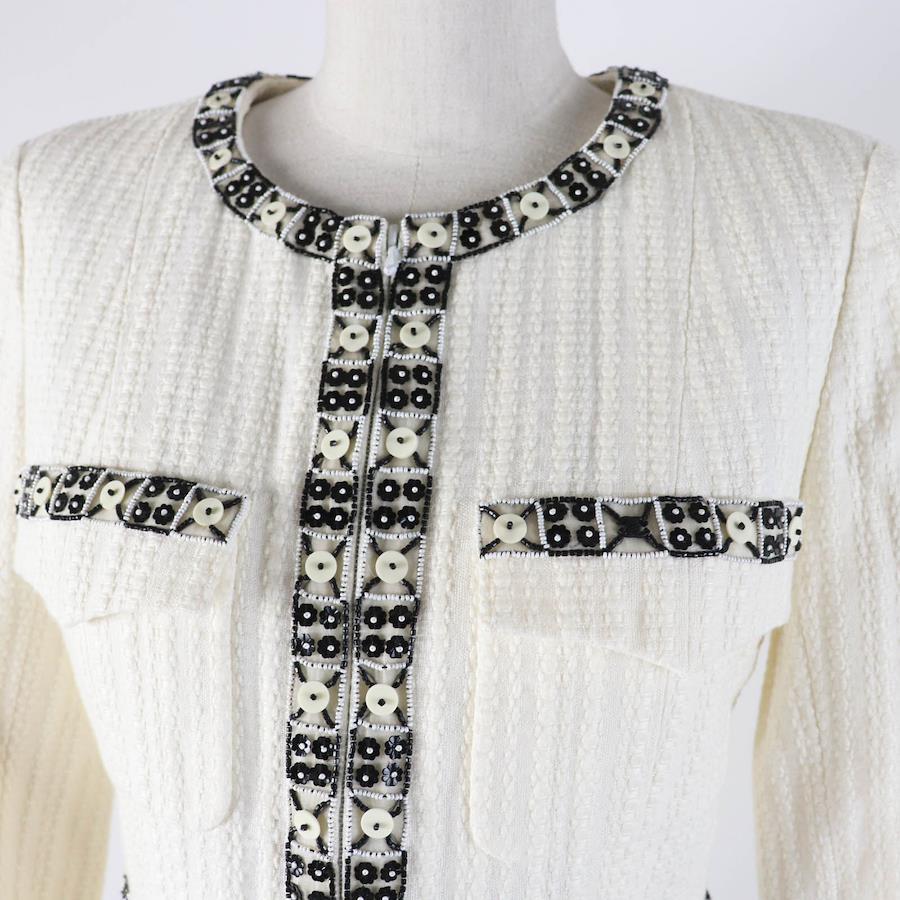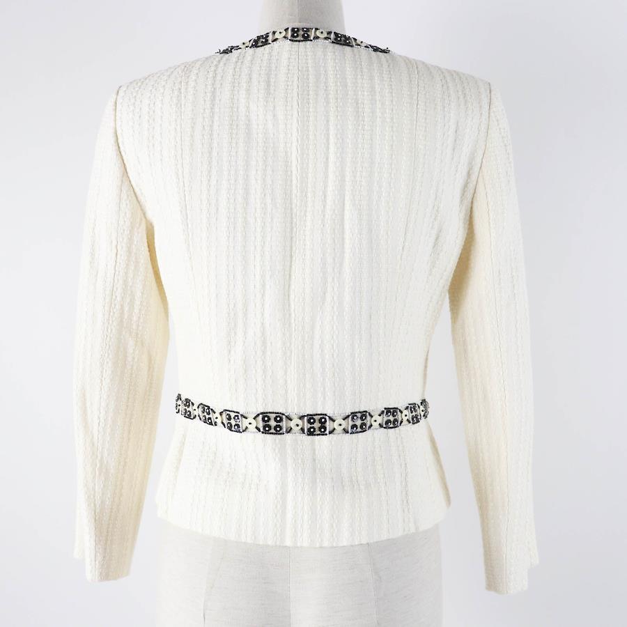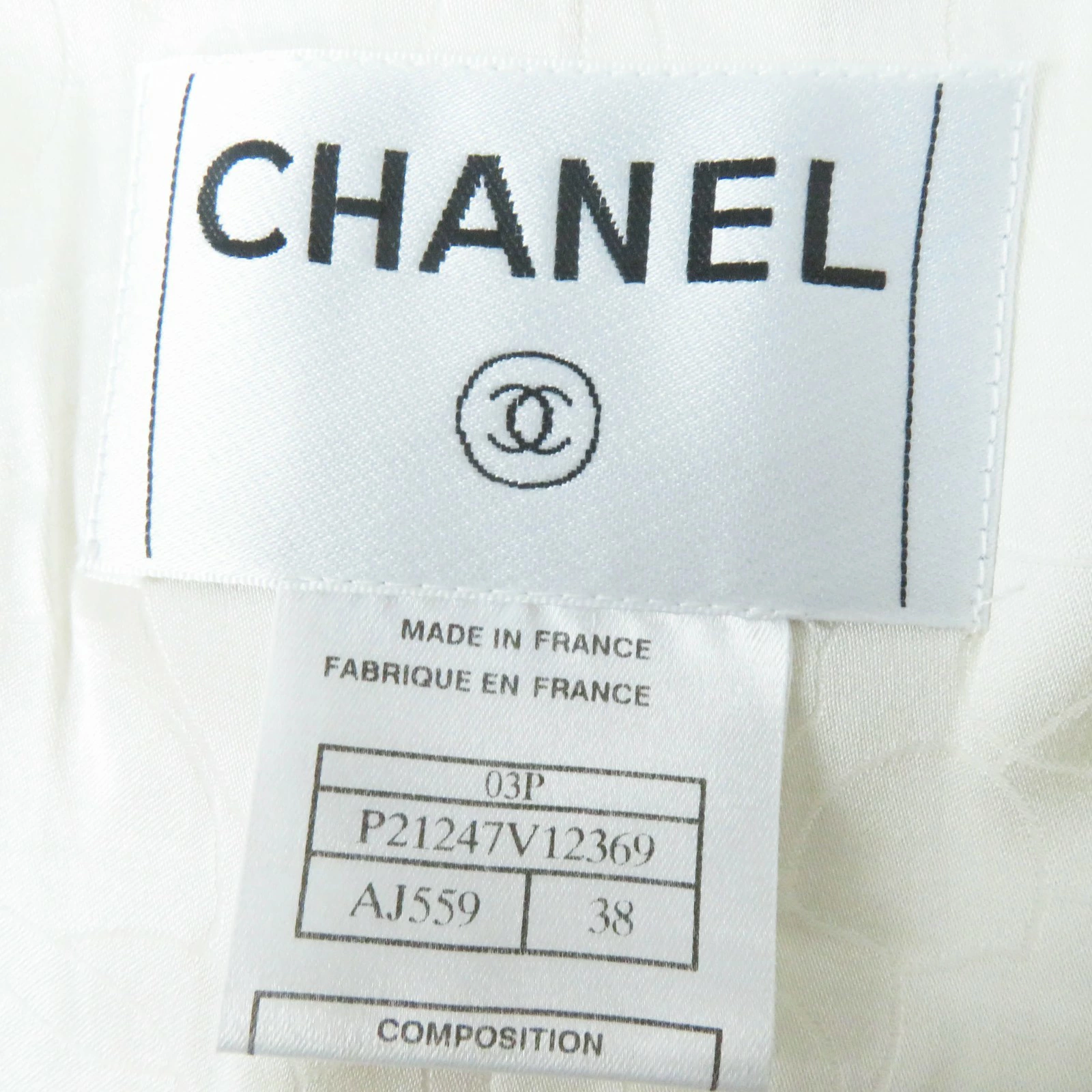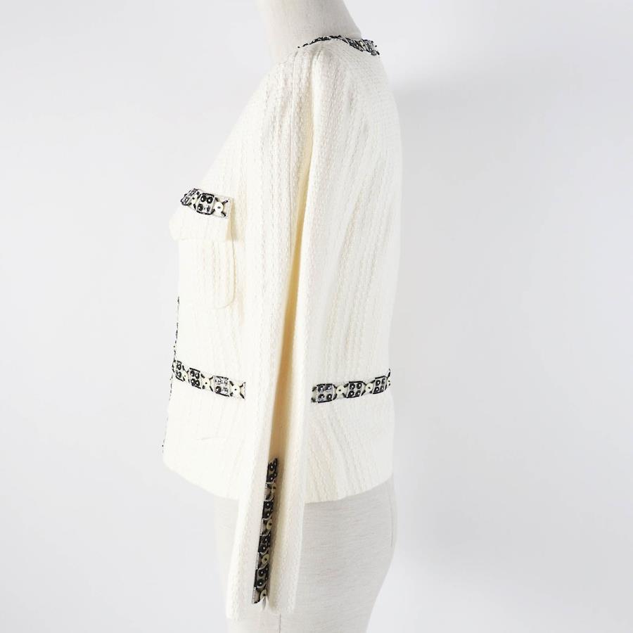 Excellent condition CHANEL 03P P21247 Cotton/Linen Blend Tweed Jacket with Coco Mark and Beads, Collarless, Ivory/Black, Size 38, Made in France, Women's [Pre-owned]