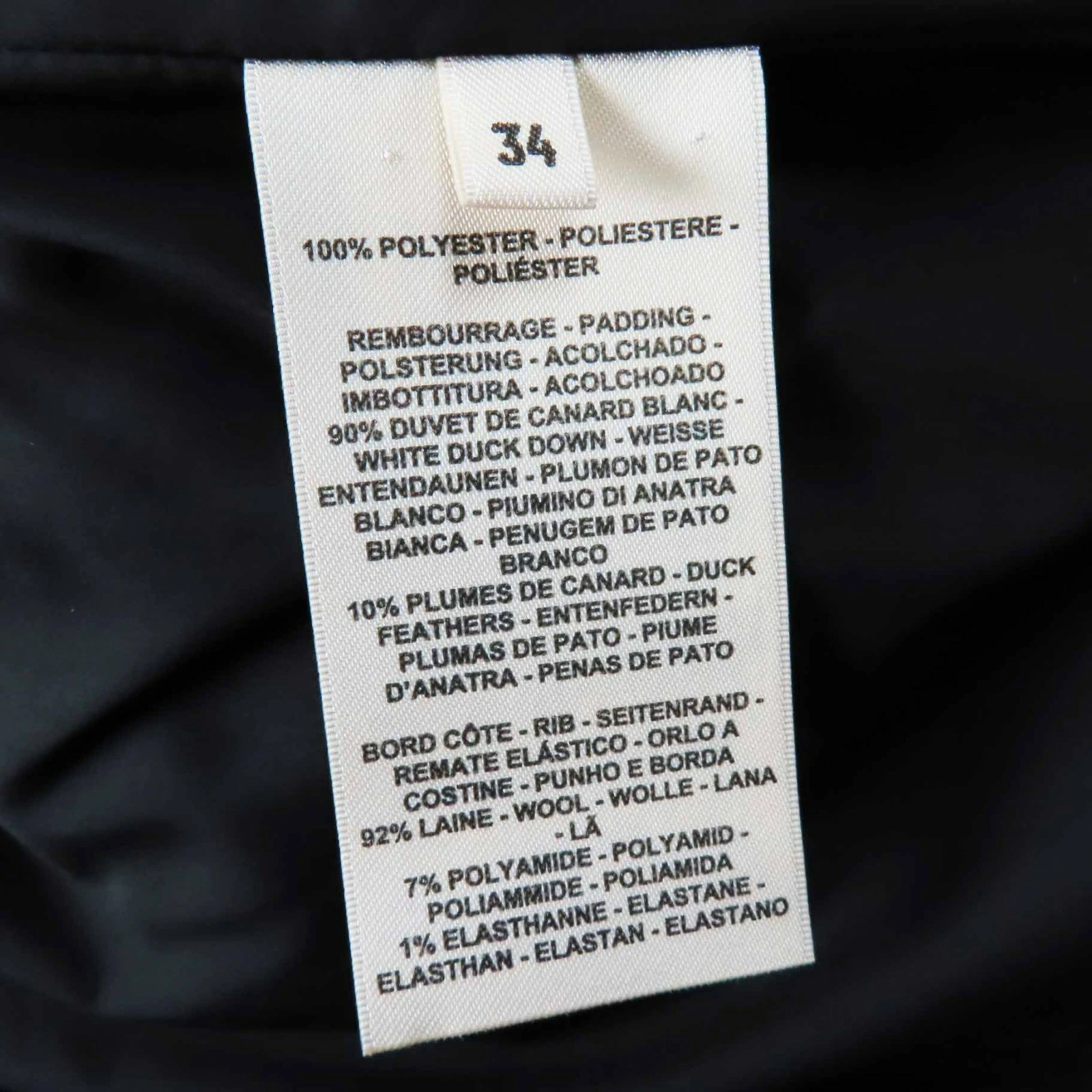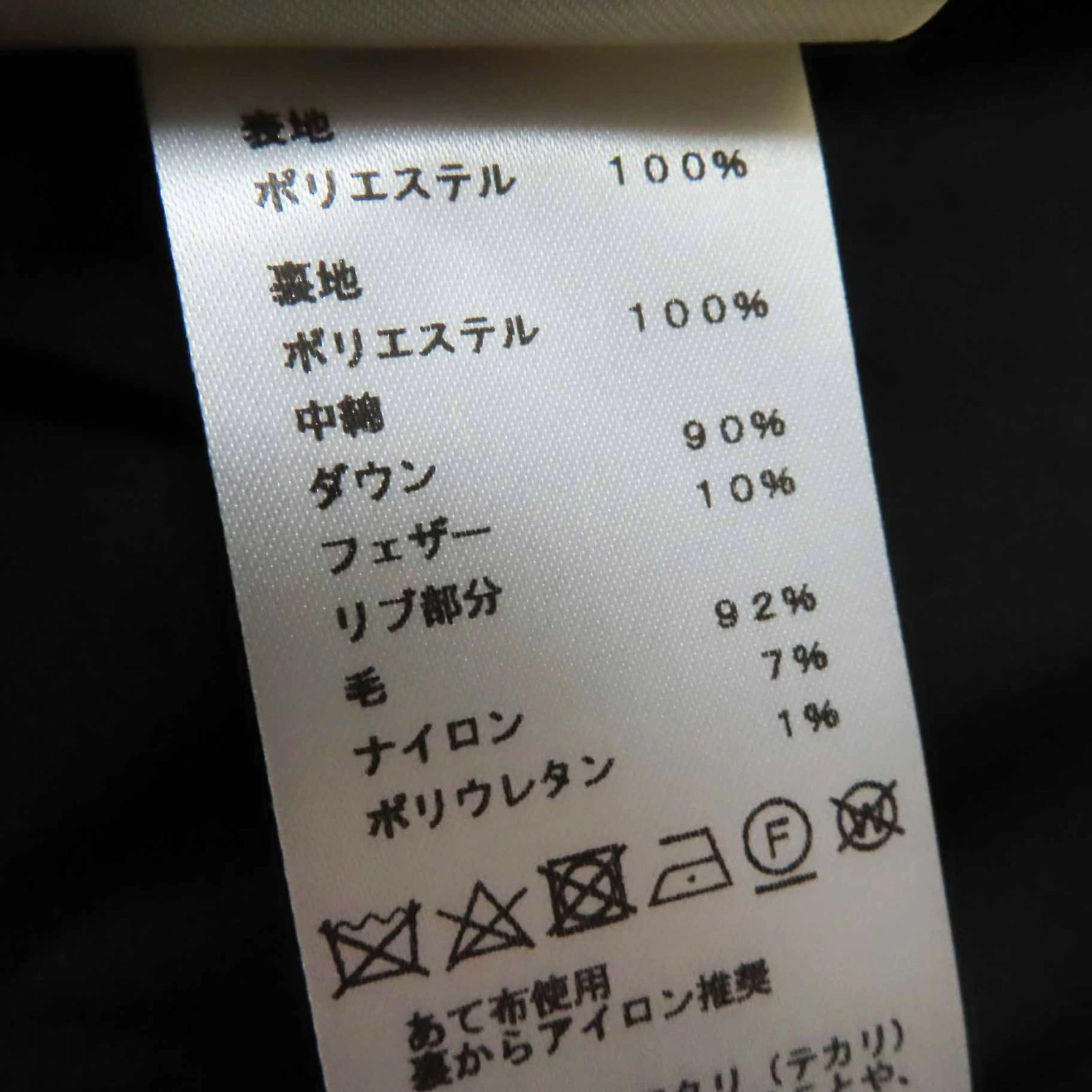 | 素材 (material) | 本体:ポリエステル100% 裏地:ポリエステル100% 中綿:ダウン90% :フェザー10% 一部:ウール92% :ナイロン7% :ポリウレタン1% | ||||||||||||||||