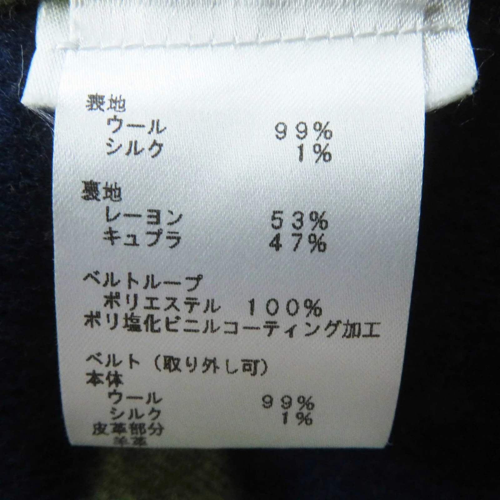 | 素材 (material) | 表地:ウール99% :シルク1% 裏地:レーヨン53% :キュプラ47% ベルトループ:ポリエステル100% ベルト:ウール99%・シルク1% 皮革部分:ラムレザー | ||||||||||||||||
