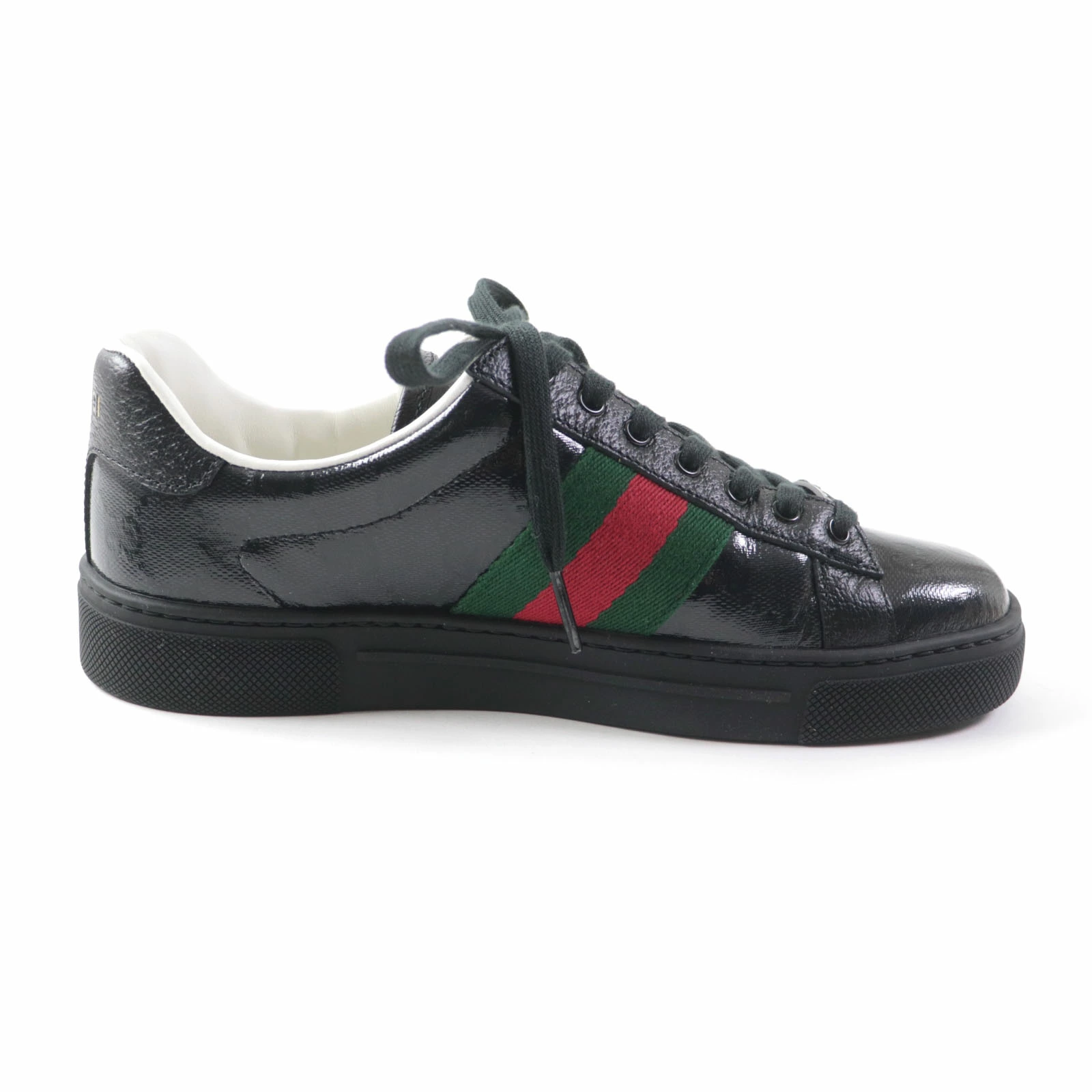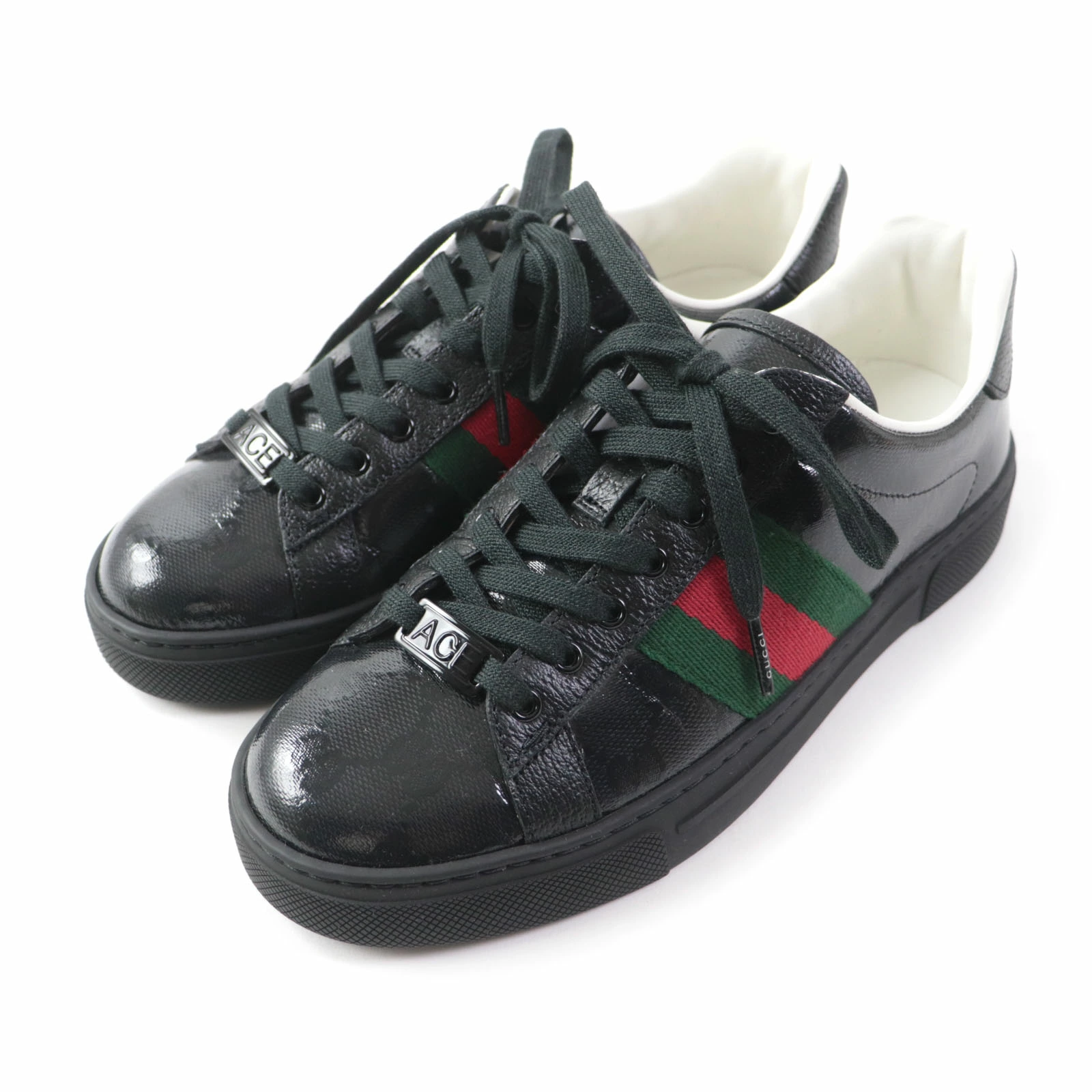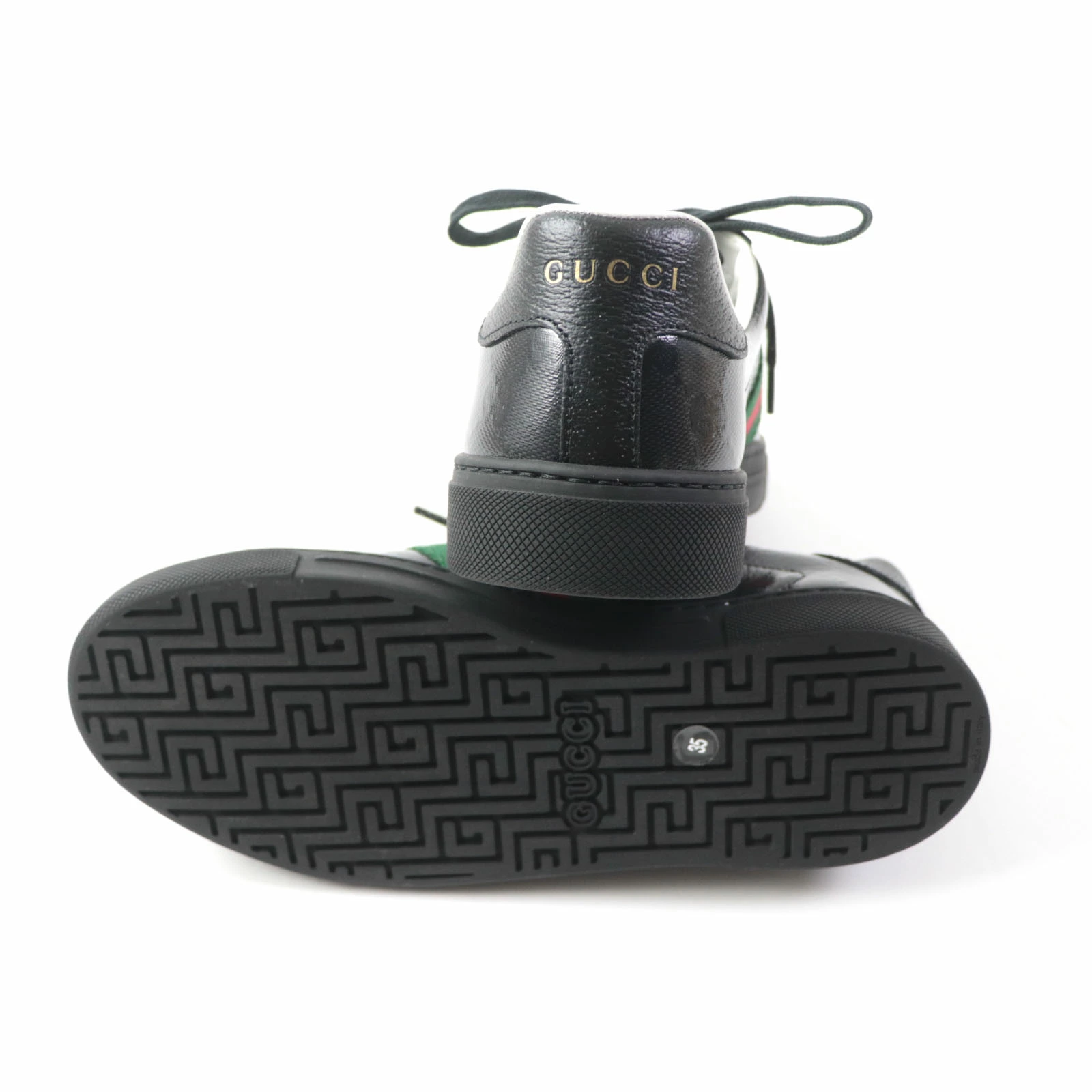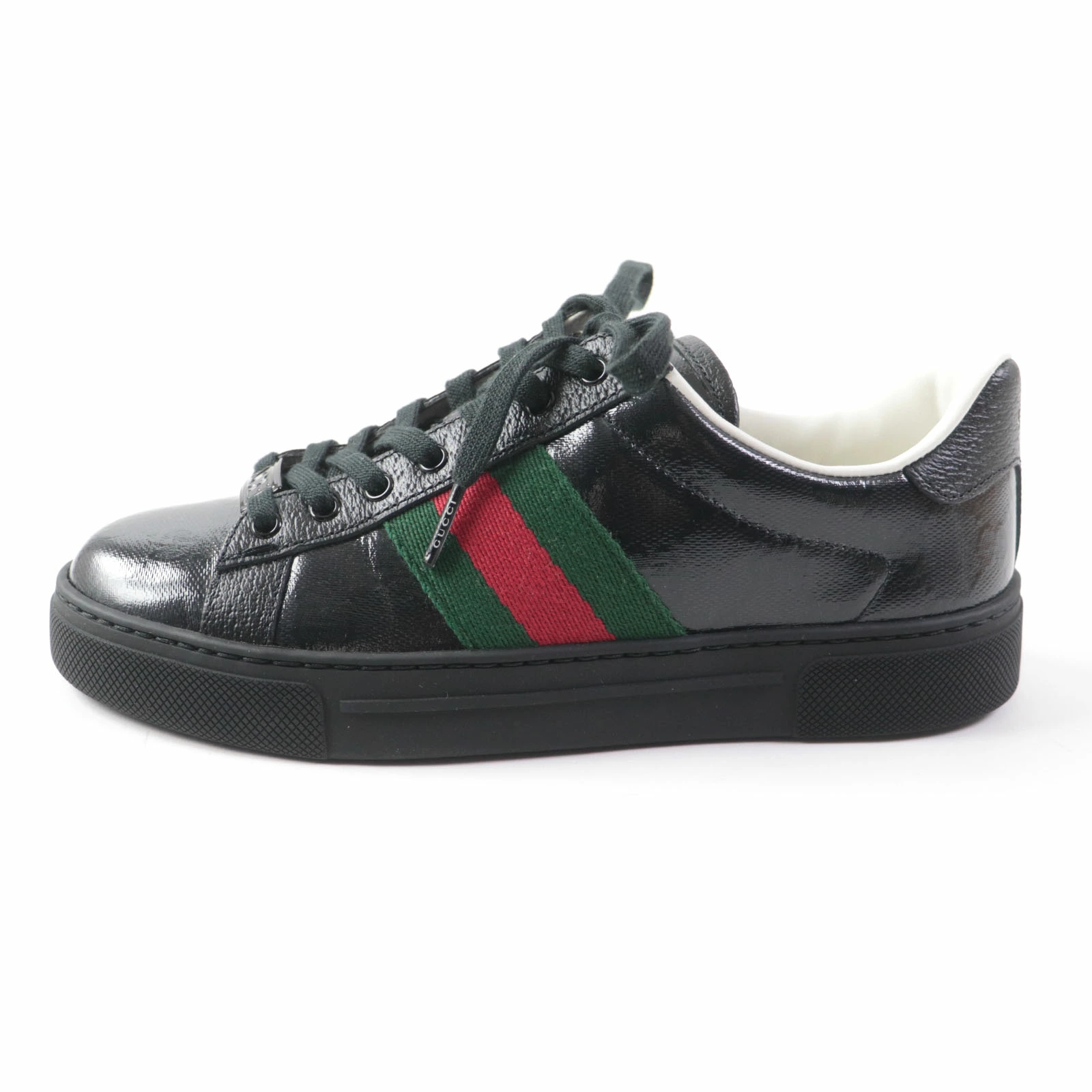 Excellent condition GUCCI 760774 Women's Ace Web Stripe Leather Low-Top Sneakers with GG Crystals, Black, Size 35, Made in Italy, Box and Dust Bag Included. Pre-owned.