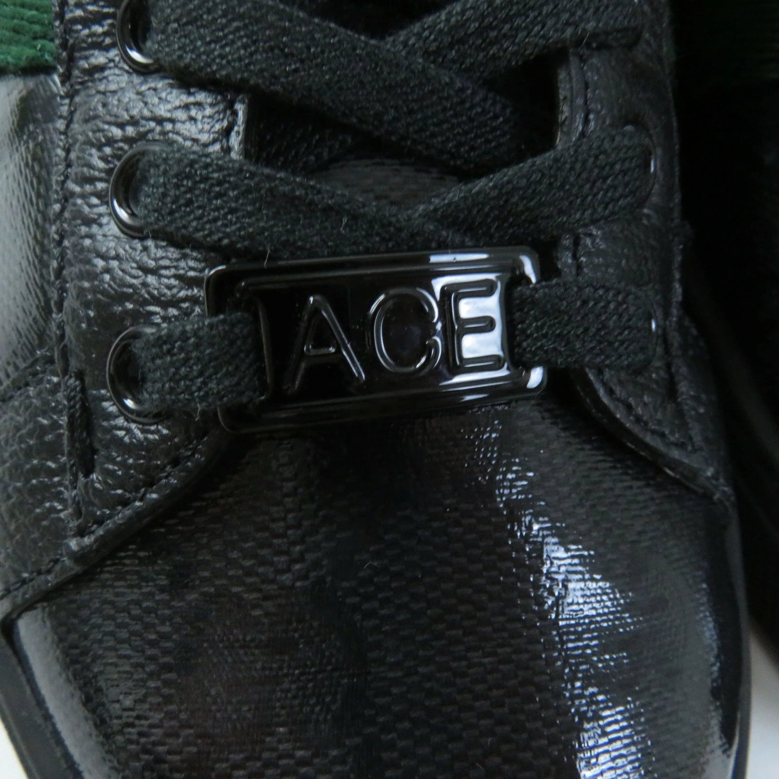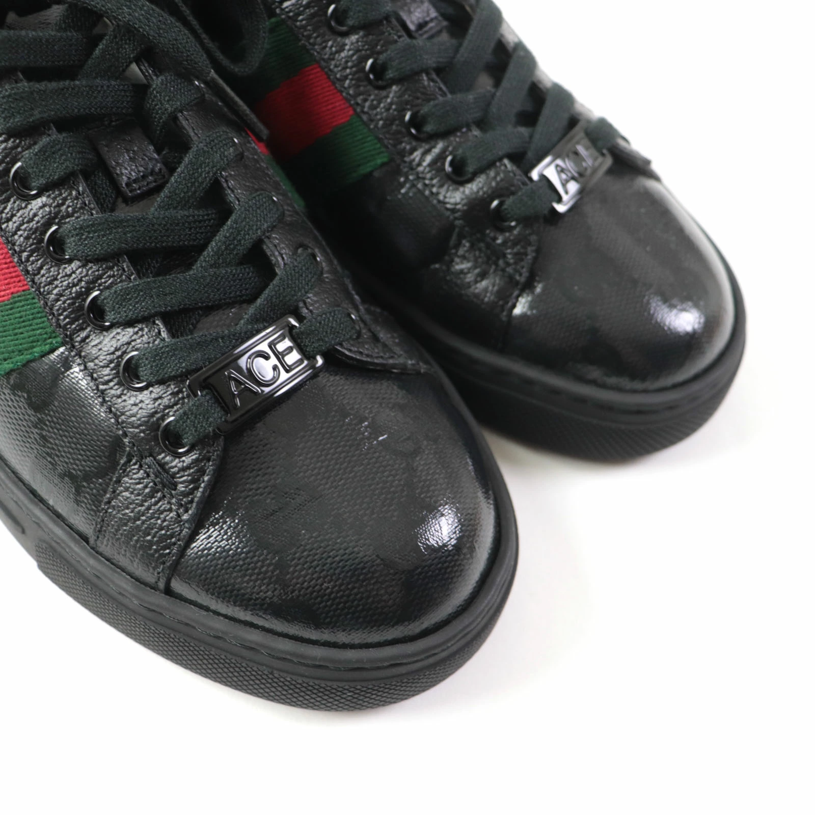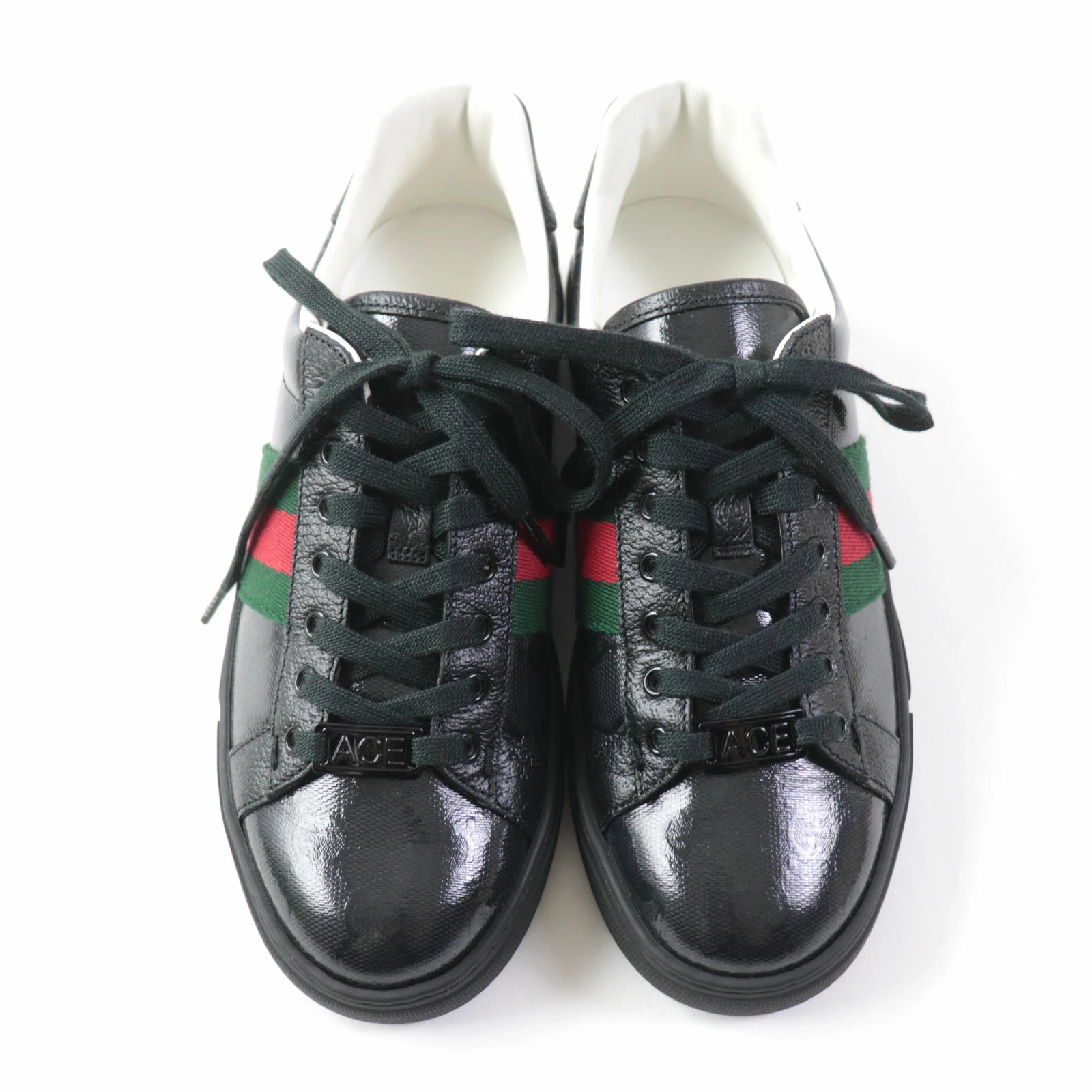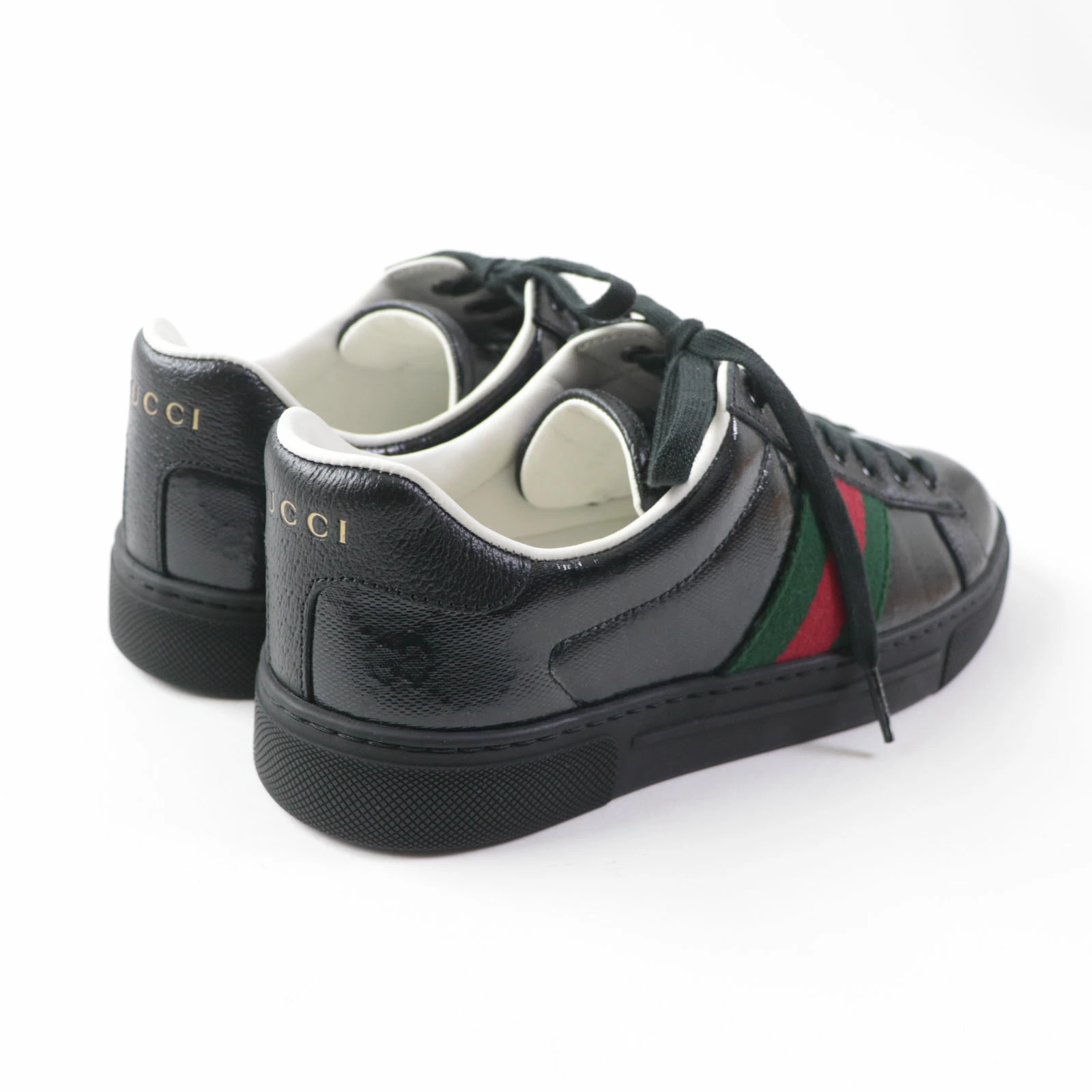 Excellent condition GUCCI 760774 Women's Ace Web Stripe Leather Low-Top Sneakers with GG Crystals, Black, Size 35, Made in Italy, Box and Dust Bag Included. Pre-owned.