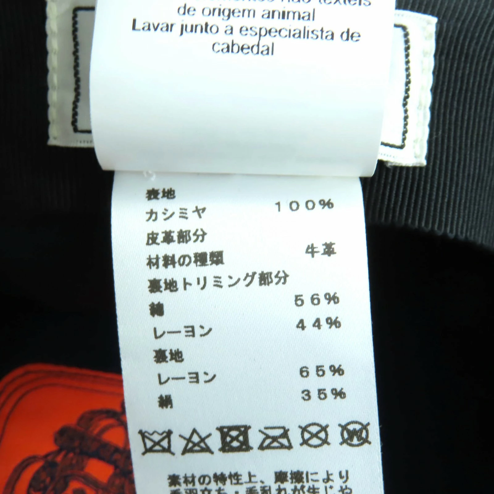 | 素材 (material) | 表地:カシミヤ100% 一部:牛革 :コットン56% :レーヨン44% 裏地:レーヨン65% :シルク35% | ||||||||||||||||
