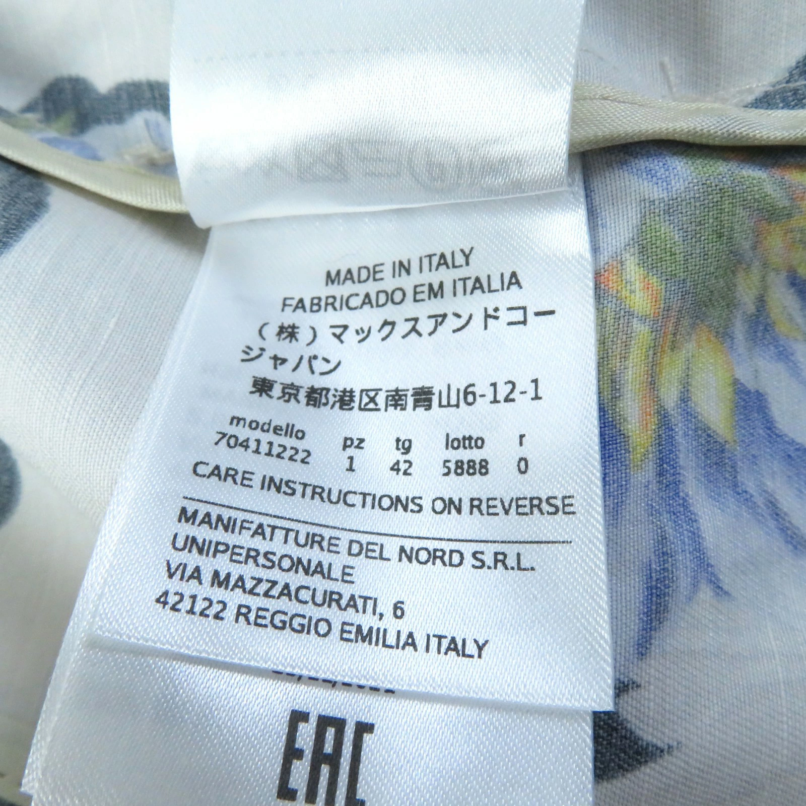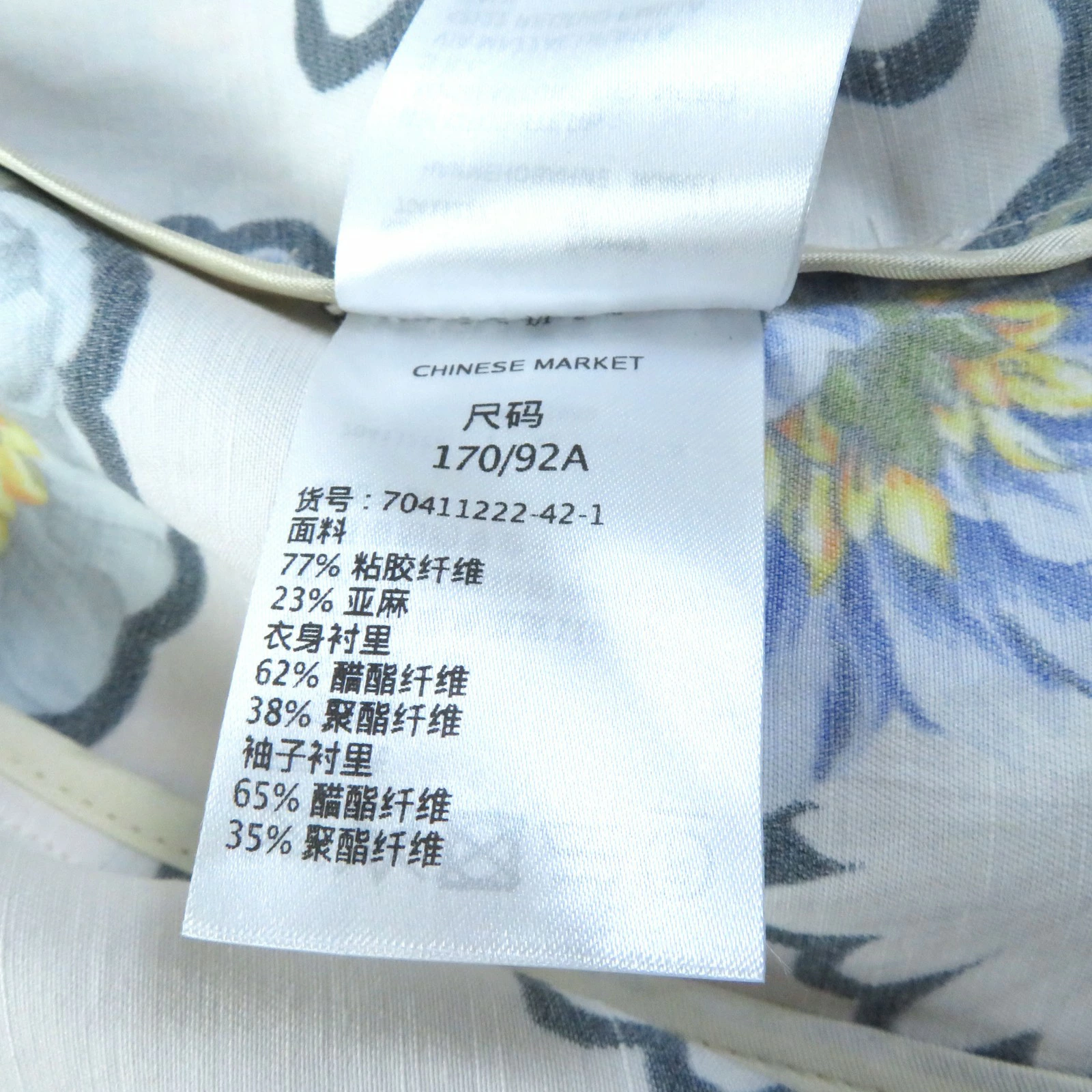 | 素材 (material) | 裏地:アセテート62% :ポリエステル38% 裏地:アセテート62% :ポリエステル38% 表地:ビスコース77% リノ23% | ||||||||||||||||