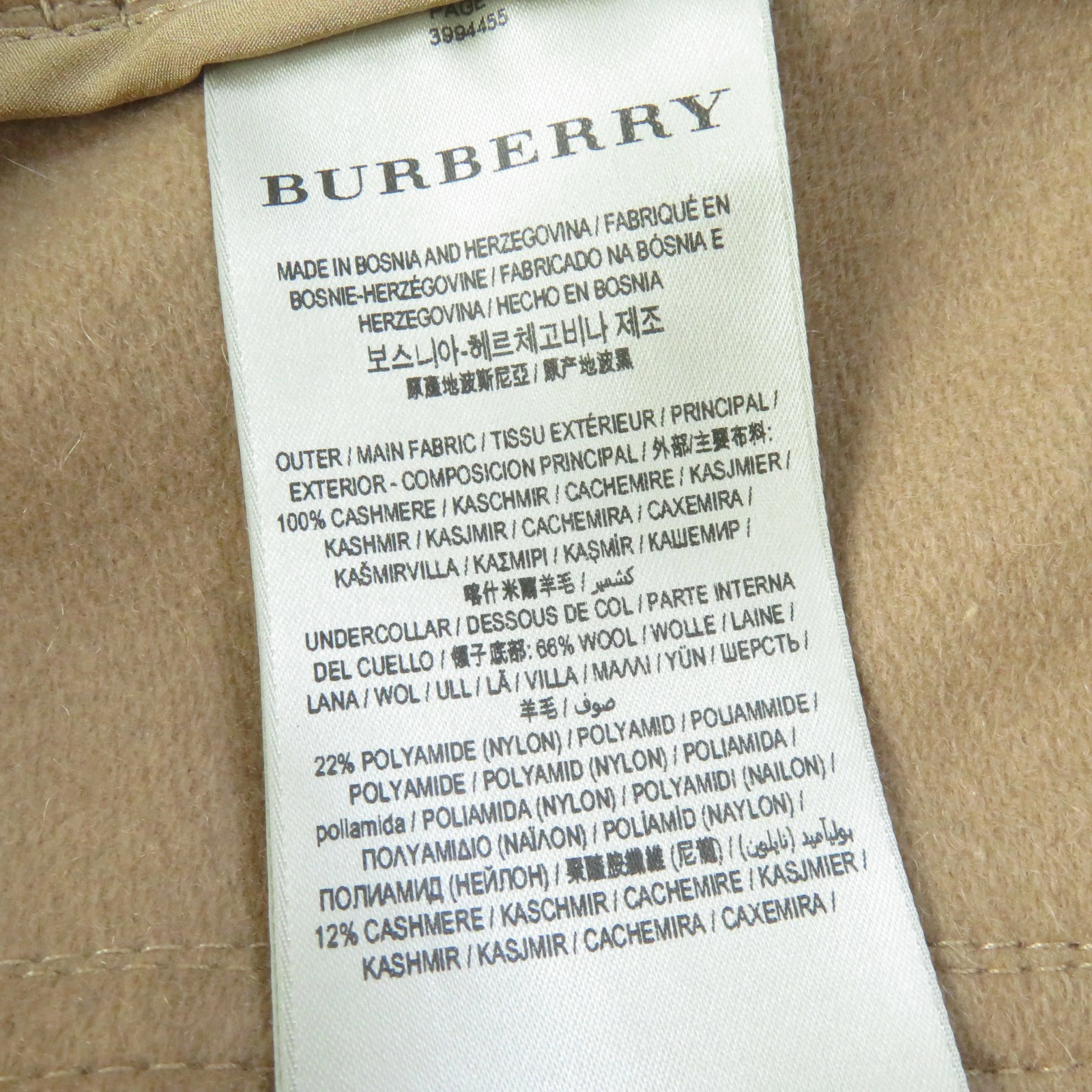 | 素材 (material) | 本体:カシミヤ100% 一部:ウール66% :ナイロン22% :カシミヤ12% 裏地:ビスコース(レーヨン)100% 裏地(袖裏):ビスコース100% | ||||||||||||||||