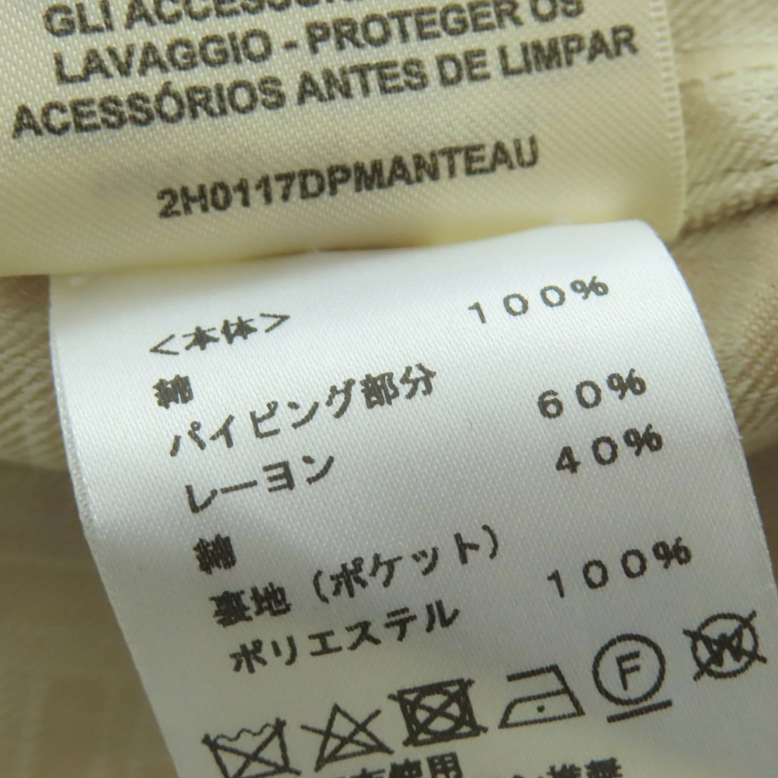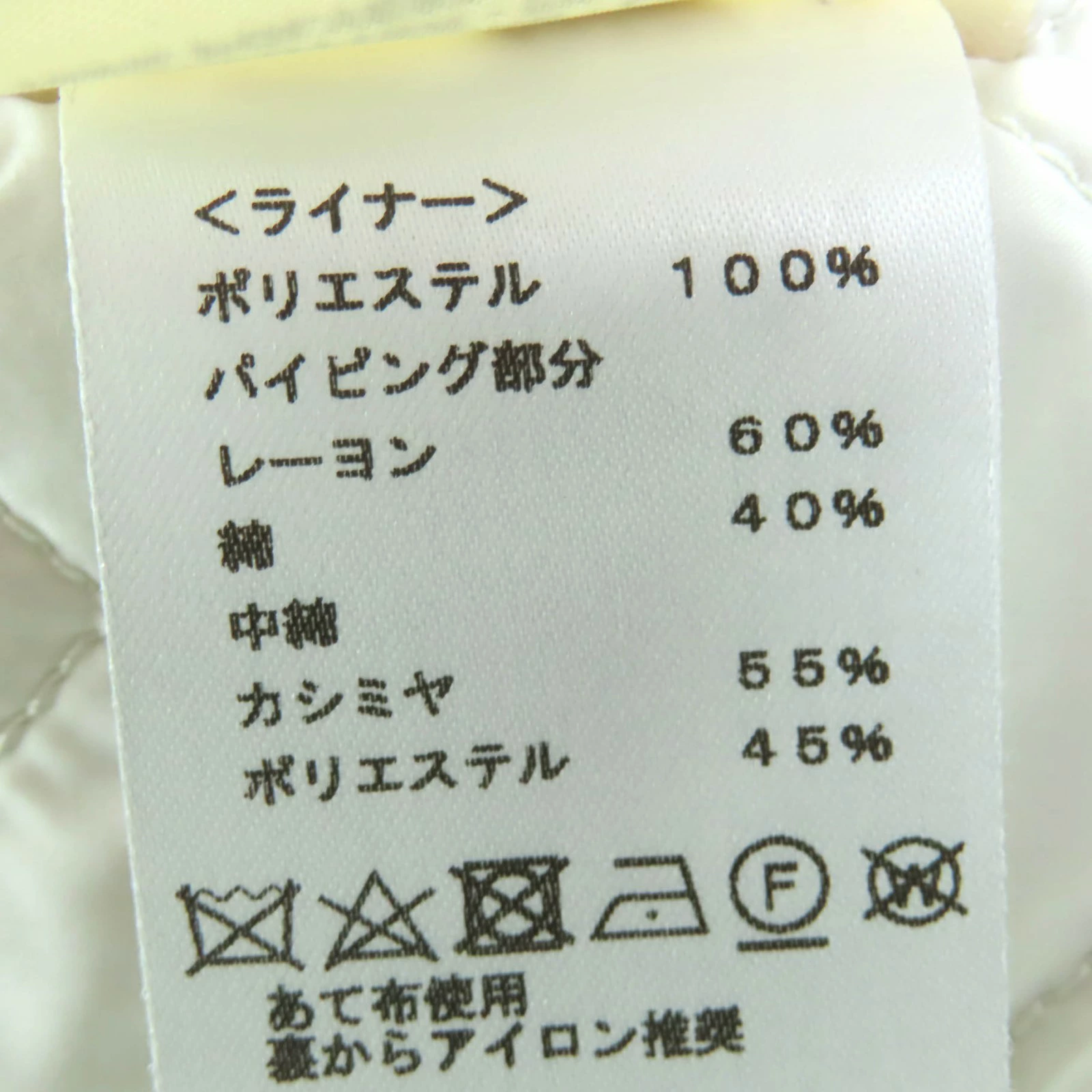 | 素材 (material) | 本体:コットン100% 一部:レーヨン60% :コットン40% 裏地:ポリエステル100% ライナー:ポリエステル100% 一部:レーヨン60% :コットン40% 中綿:カシミヤ55% :ポリエステル45% | ||||||||||||||||