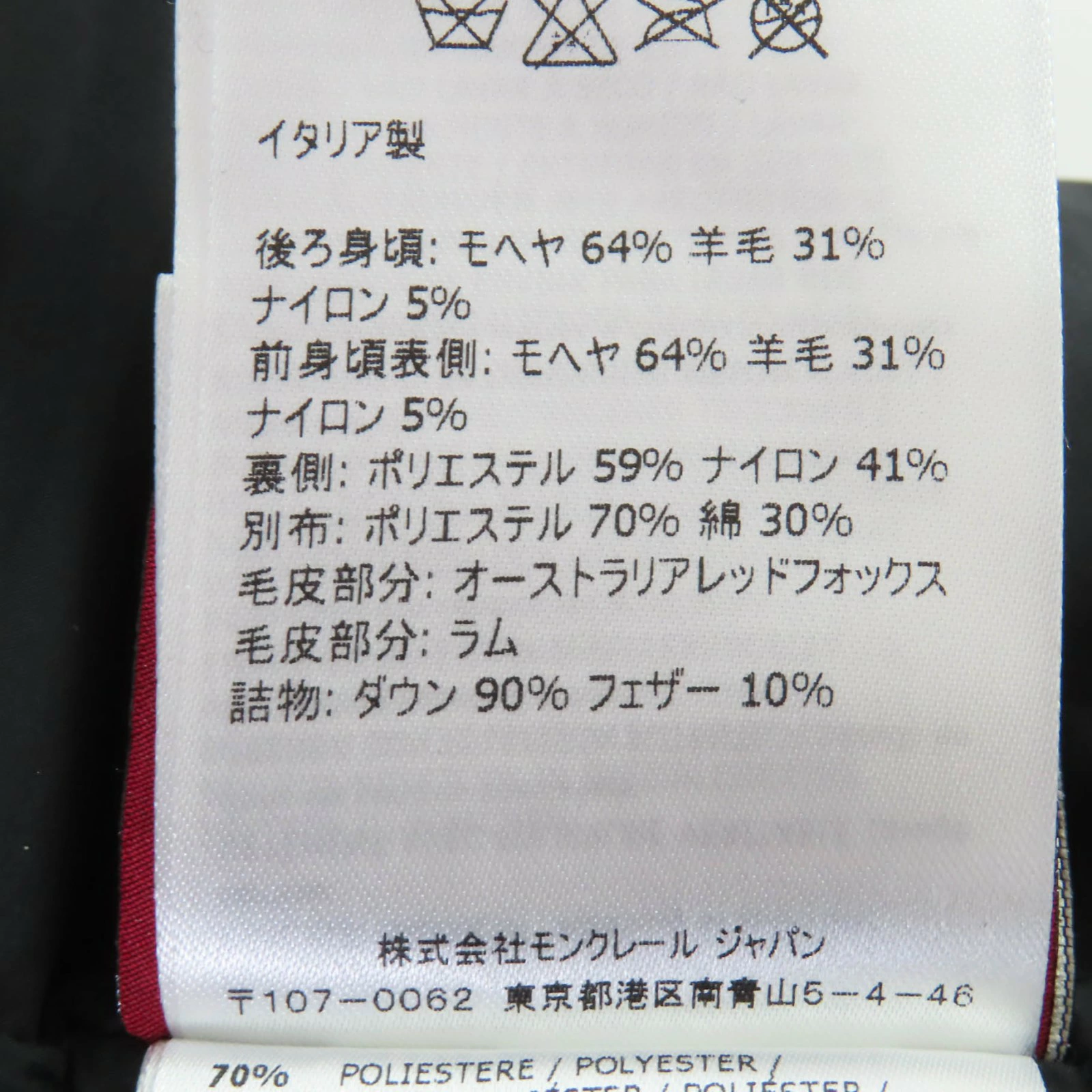 | 素材 (material) | 本体:モヘア64% :ウール31% :ナイロン5% 裏地:ポリエステル59% :ナイロン41% 一部:ポリエステル70% :コットン30% 皮革部分:フォックス :ラムファー 中綿:ダウン90% :フェザー10% | ||||||||||||||||