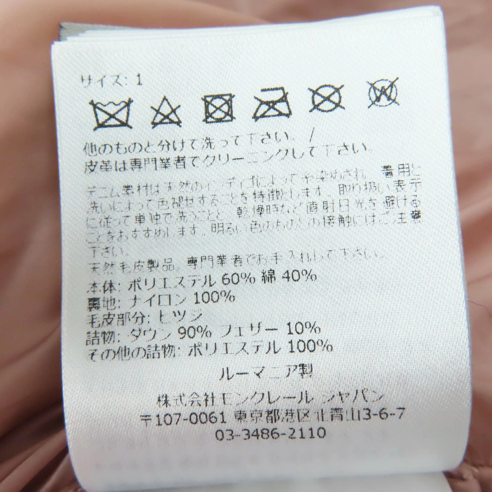 | 素材 (material) | 本体:ポリエステル60% :コットン40% 裏地:ナイロン100% ファー:羊毛 中綿:ダウン90% :フェザー10% :ポリエステル100% | ||||||||||||||||