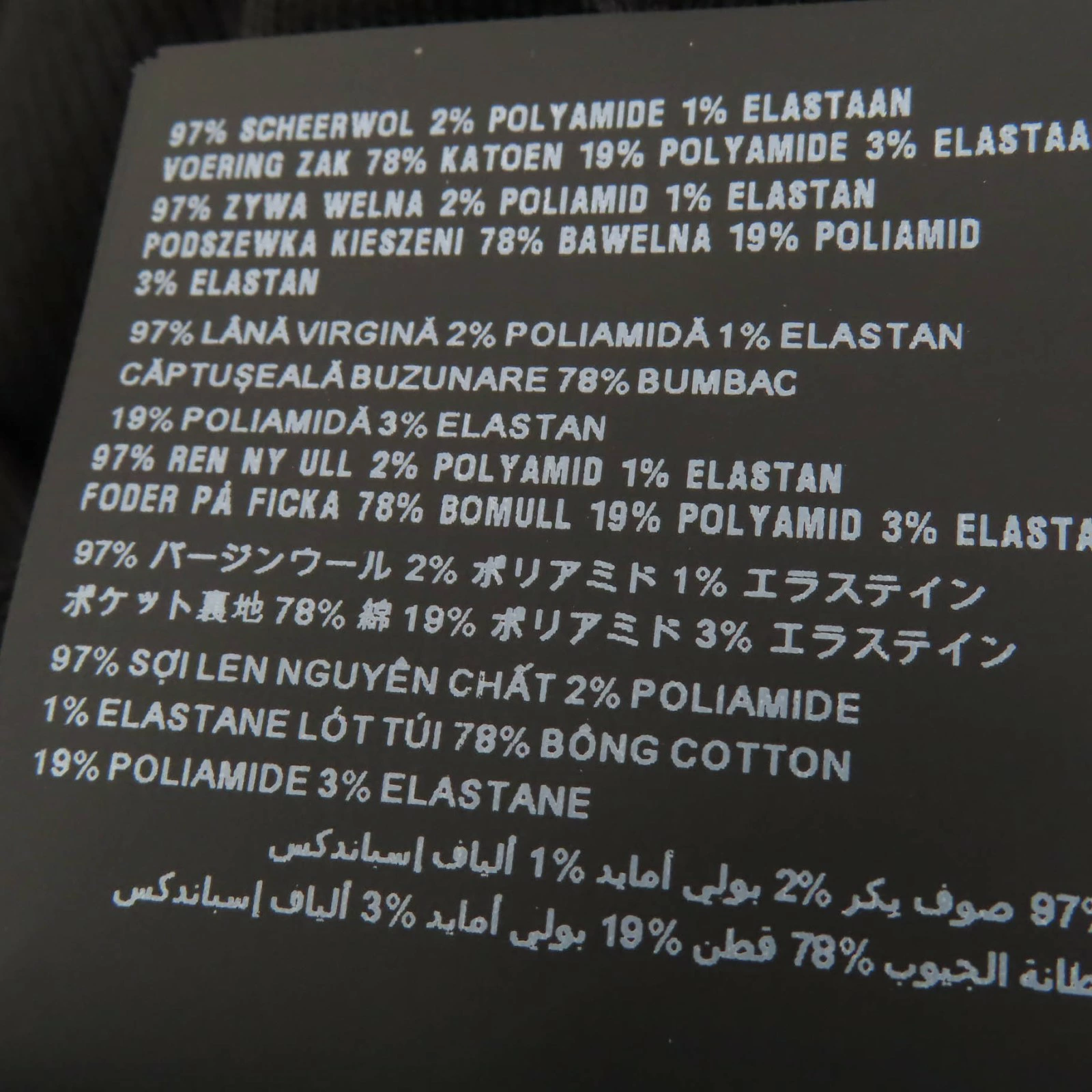 | 素材 (material) | 本体:バージンウール97% :ポリアミド2% :エラステン1% 一部:コットン78% :ポリアミド19% :エラステン3% | ||||||||||||||||