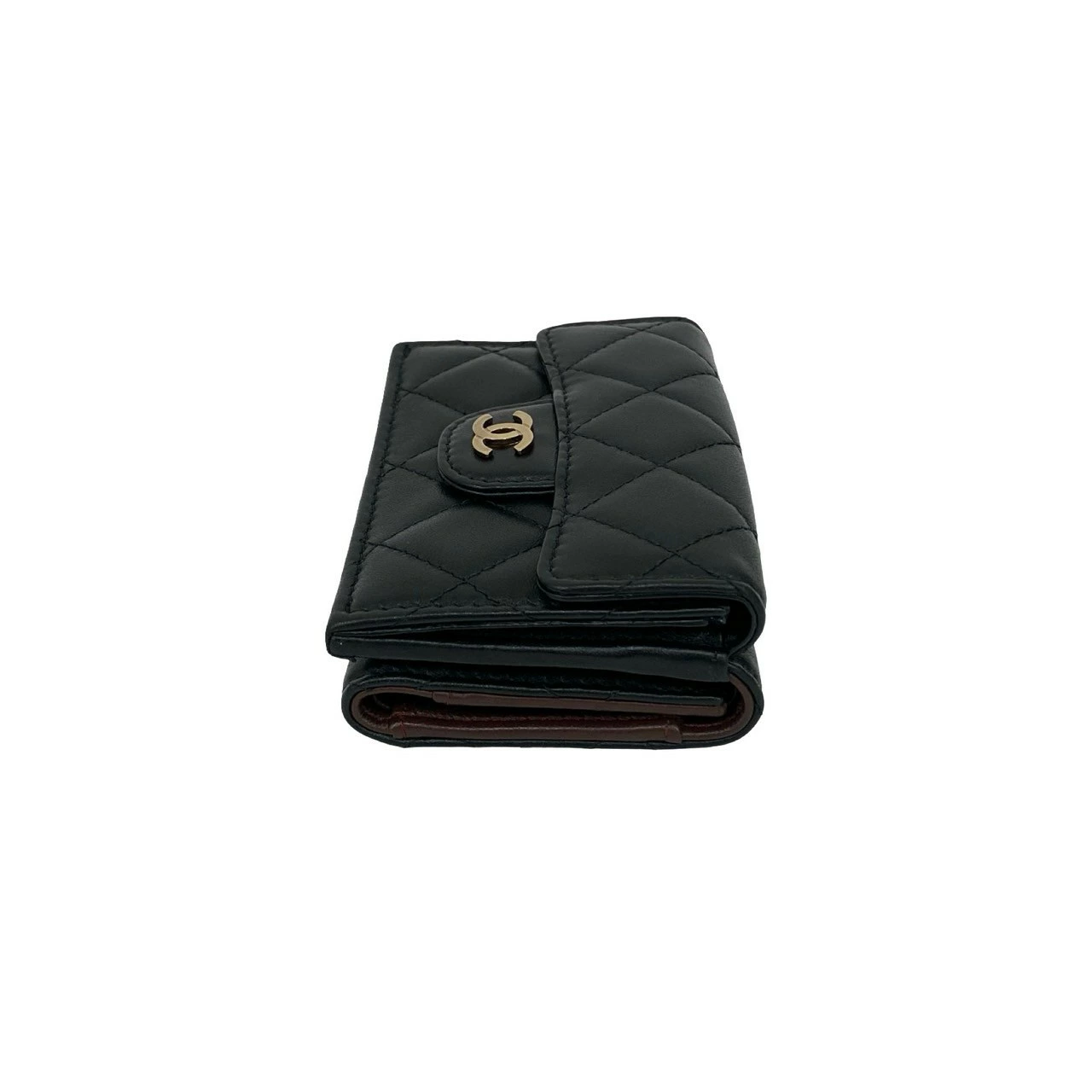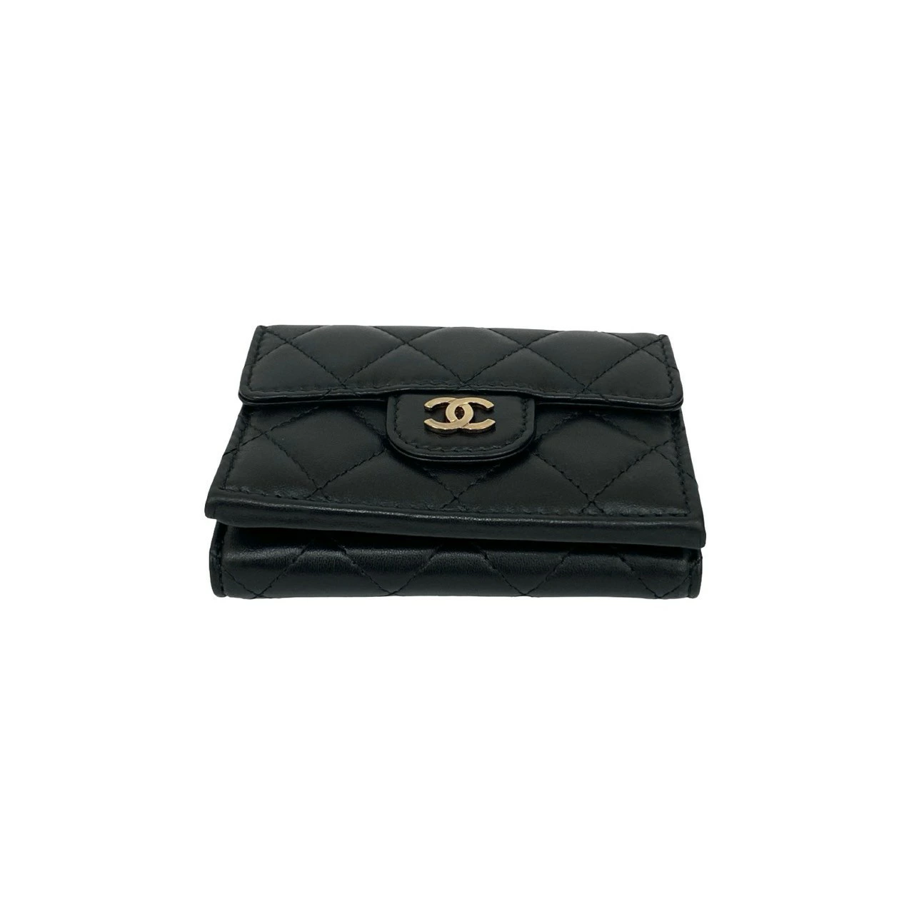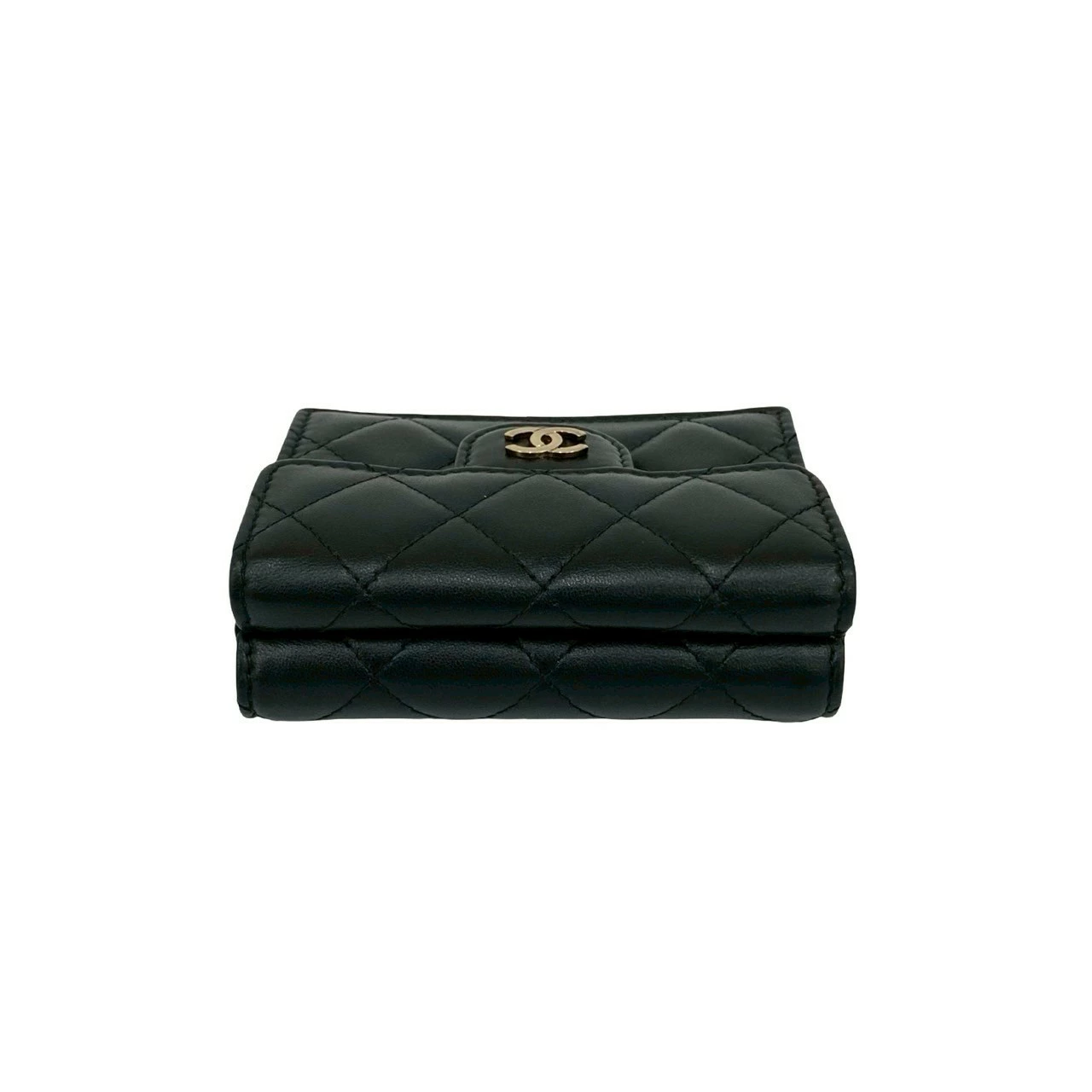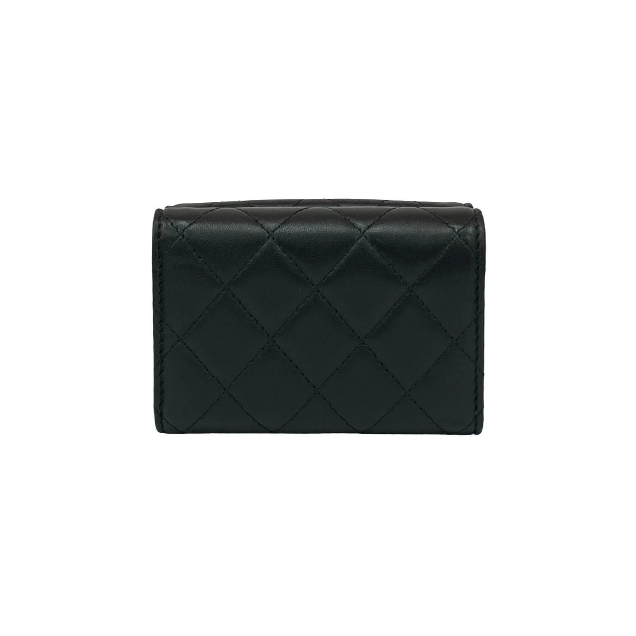 Excellent condition, box, bag, card, stickers included. CHANEL Matelasse Coco Mark lambskin tri-fold wallet, black, 82492. Pre-owned.