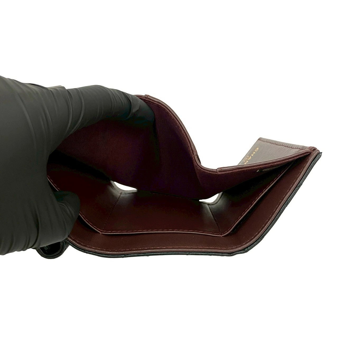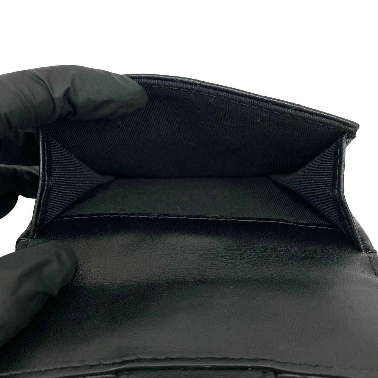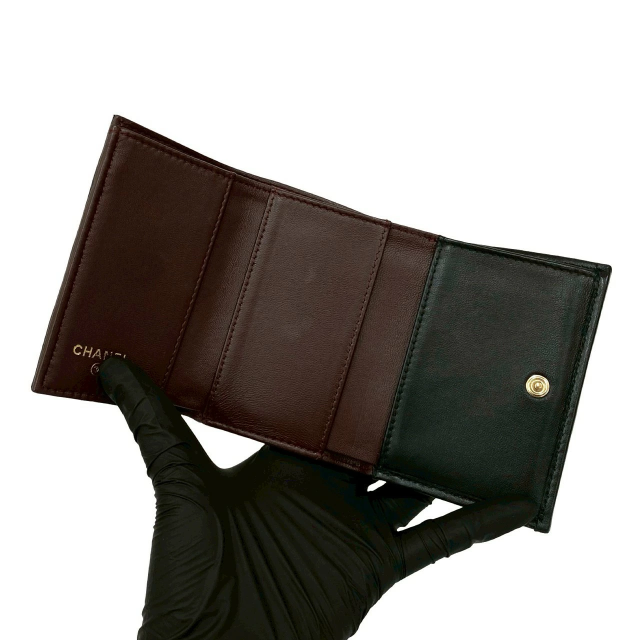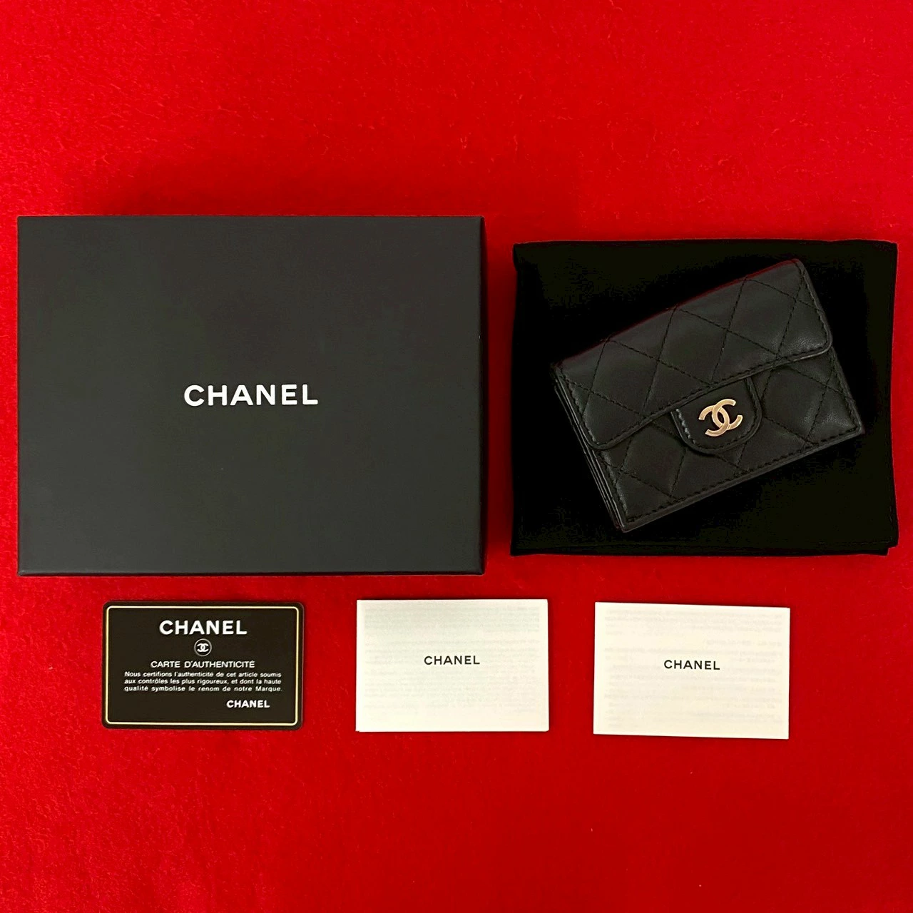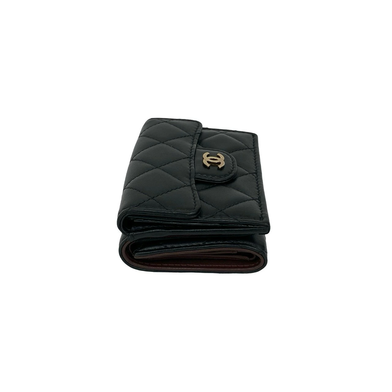 Excellent condition, box, bag, card, stickers included. CHANEL Matelasse Coco Mark lambskin tri-fold wallet, black, 82492. Pre-owned.