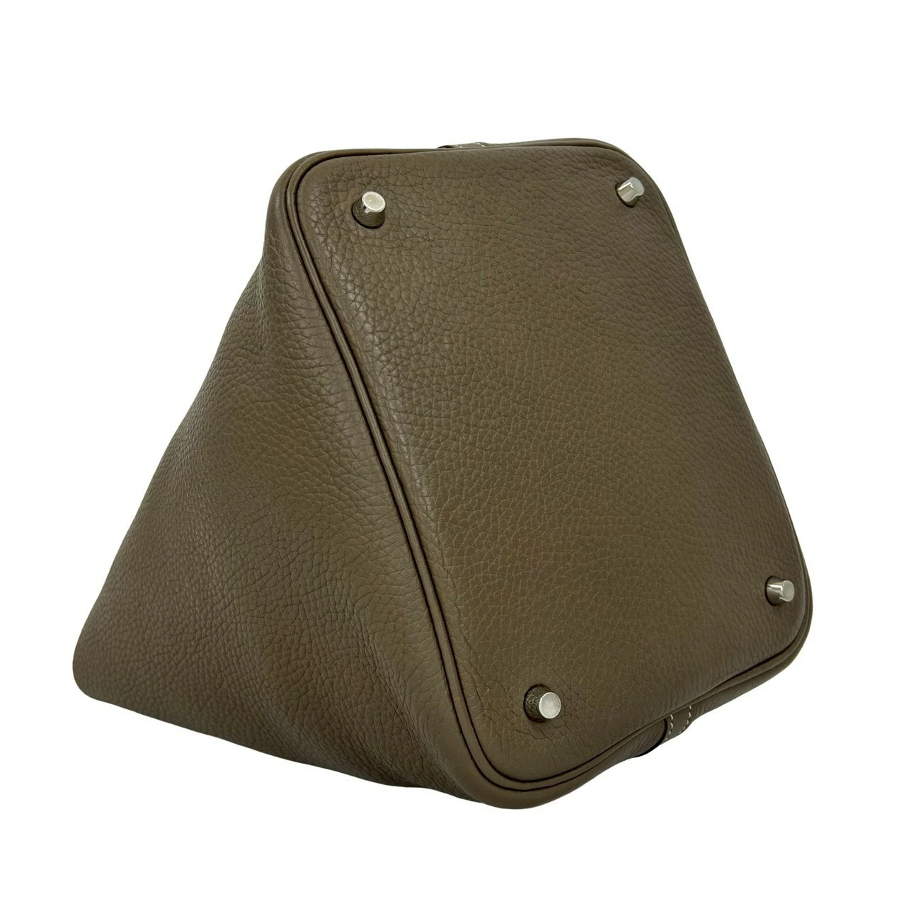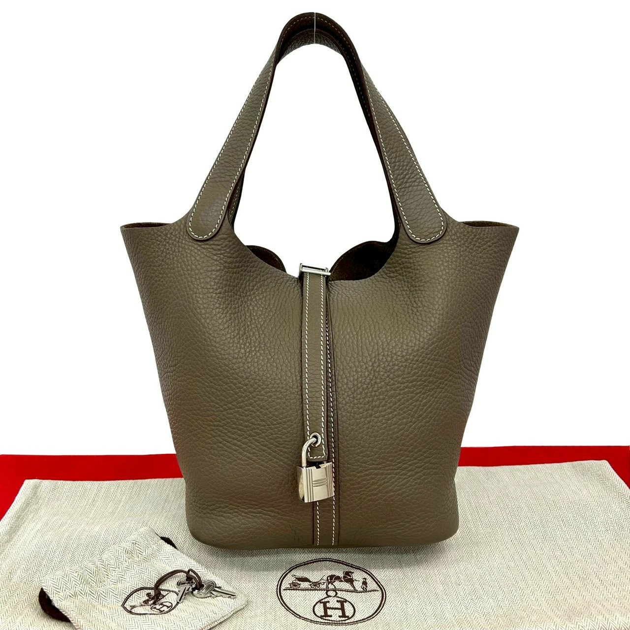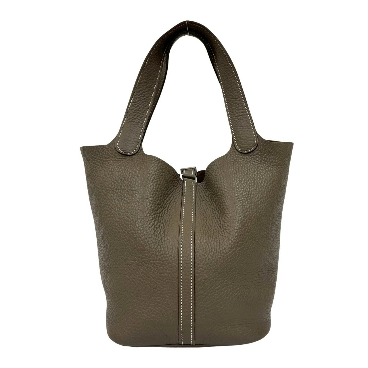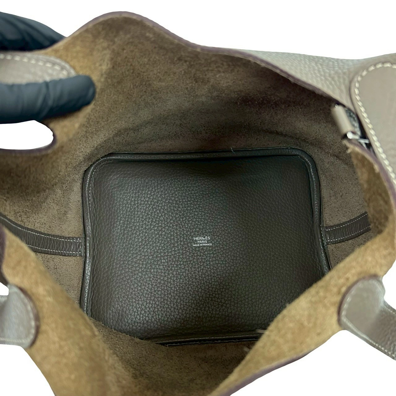 Excellent condition bag with lock. HERMES Picotin Lock MM Taurillon Clemence leather handbag/mini tote bag in Etoupe leather (30567). Pre-owned.