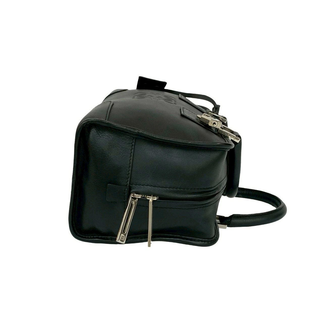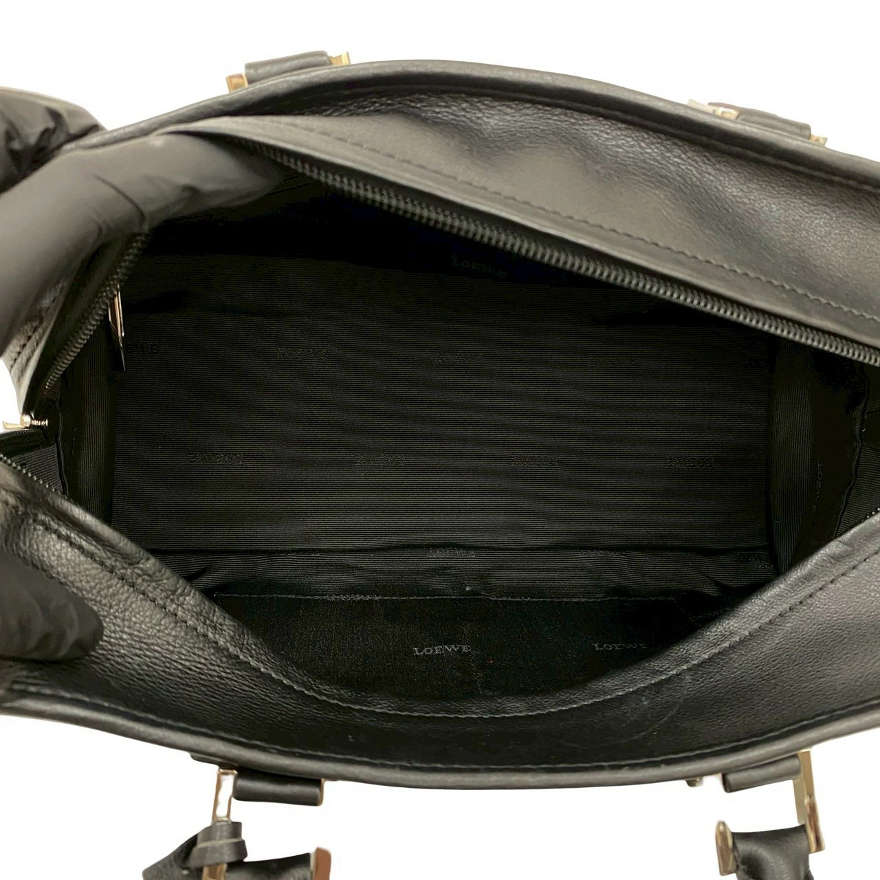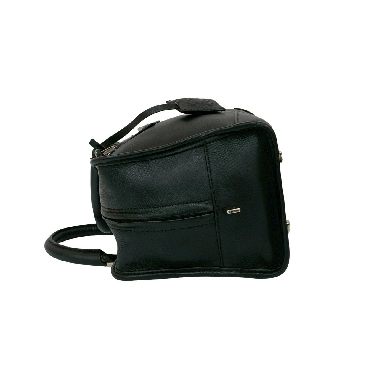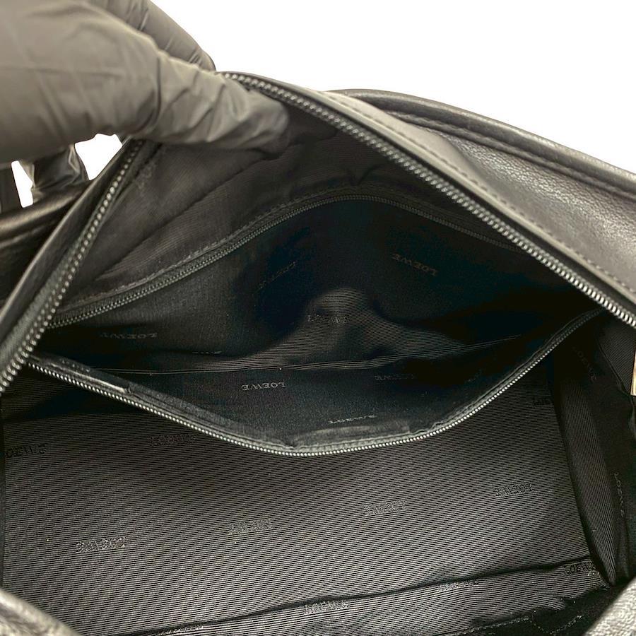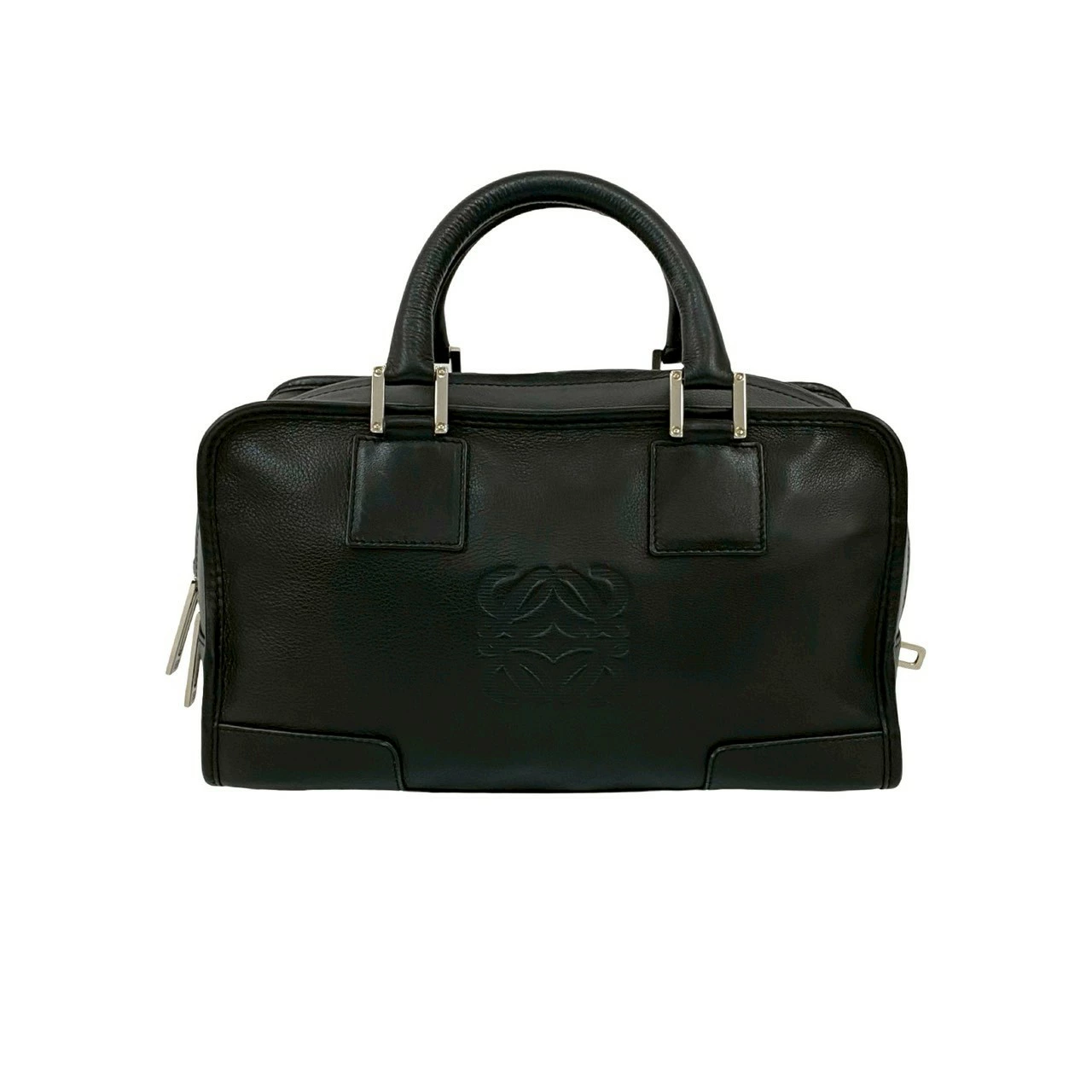 Pre-owned, excellent condition LOEWE Amazona 28 handbag with lock, featuring an Anagram logo and genuine leather, mini Boston bag, black, model 74491.