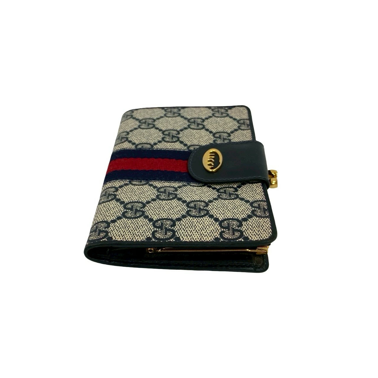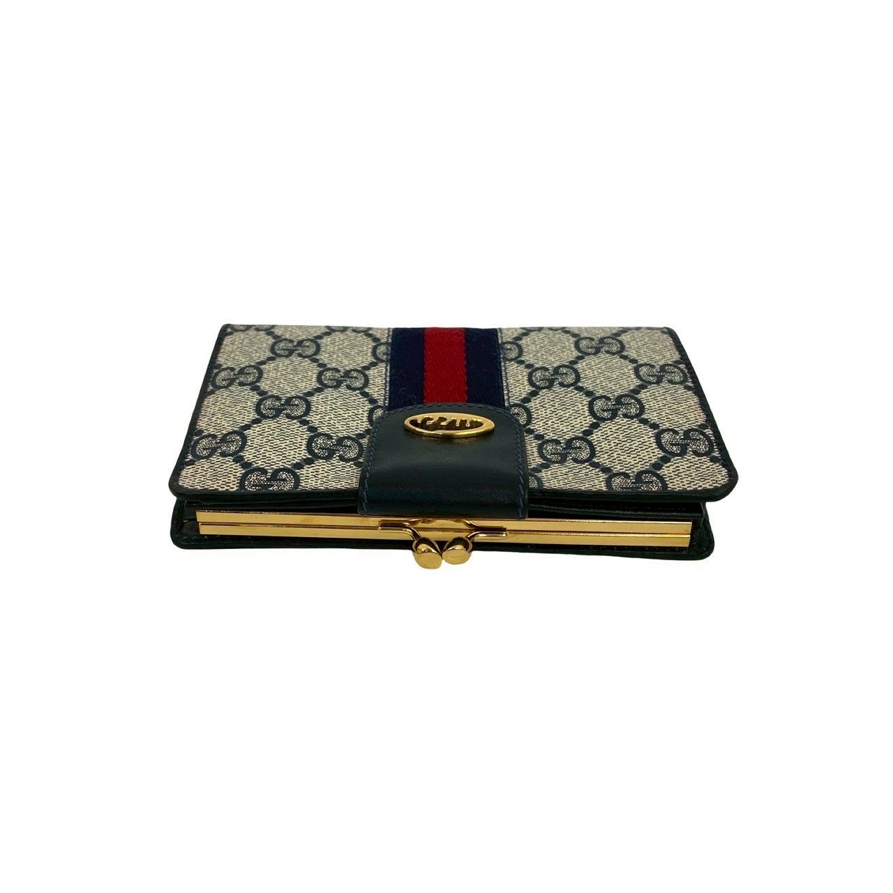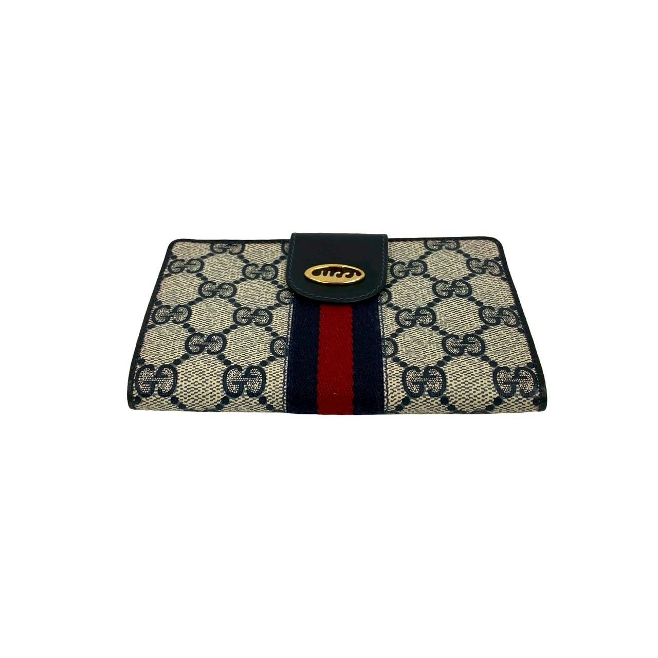Earn double points! Excellent condition GUCCI vintage Sherry line logo, metal hardware, leather clasp closure, bifold wallet, navy blue, 29765. Pre-owned.