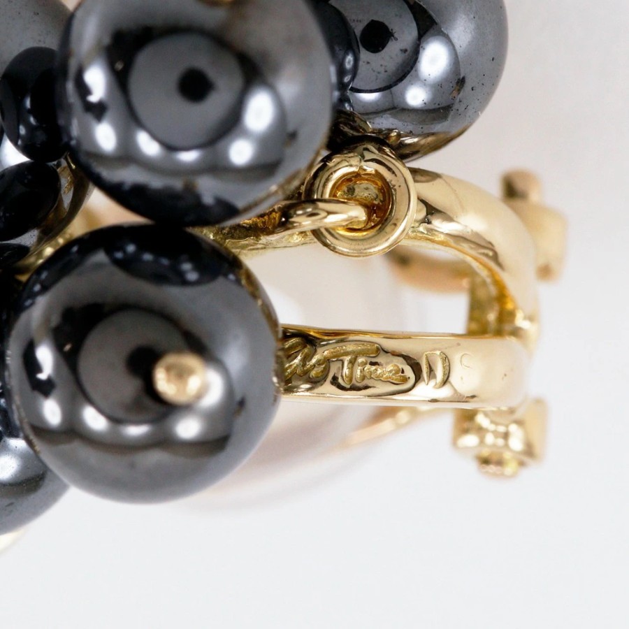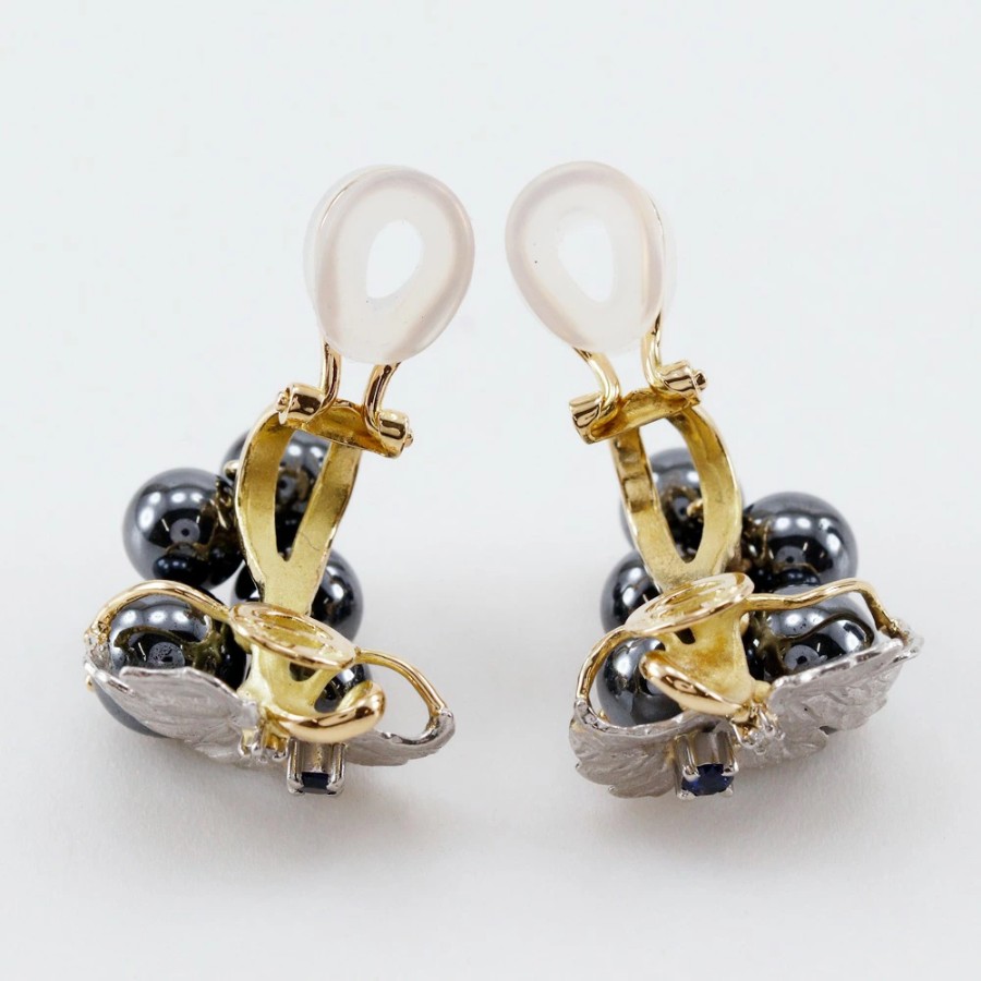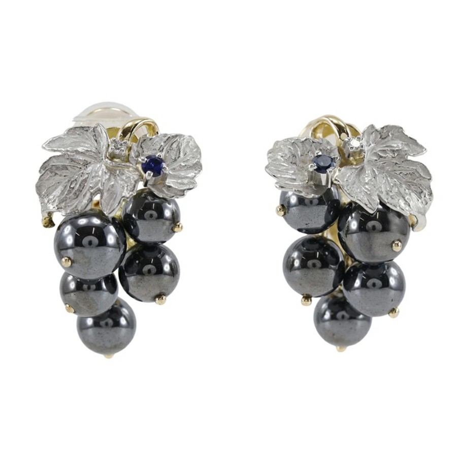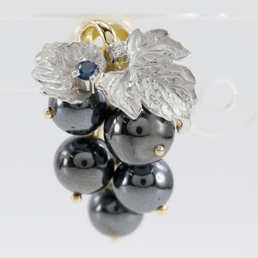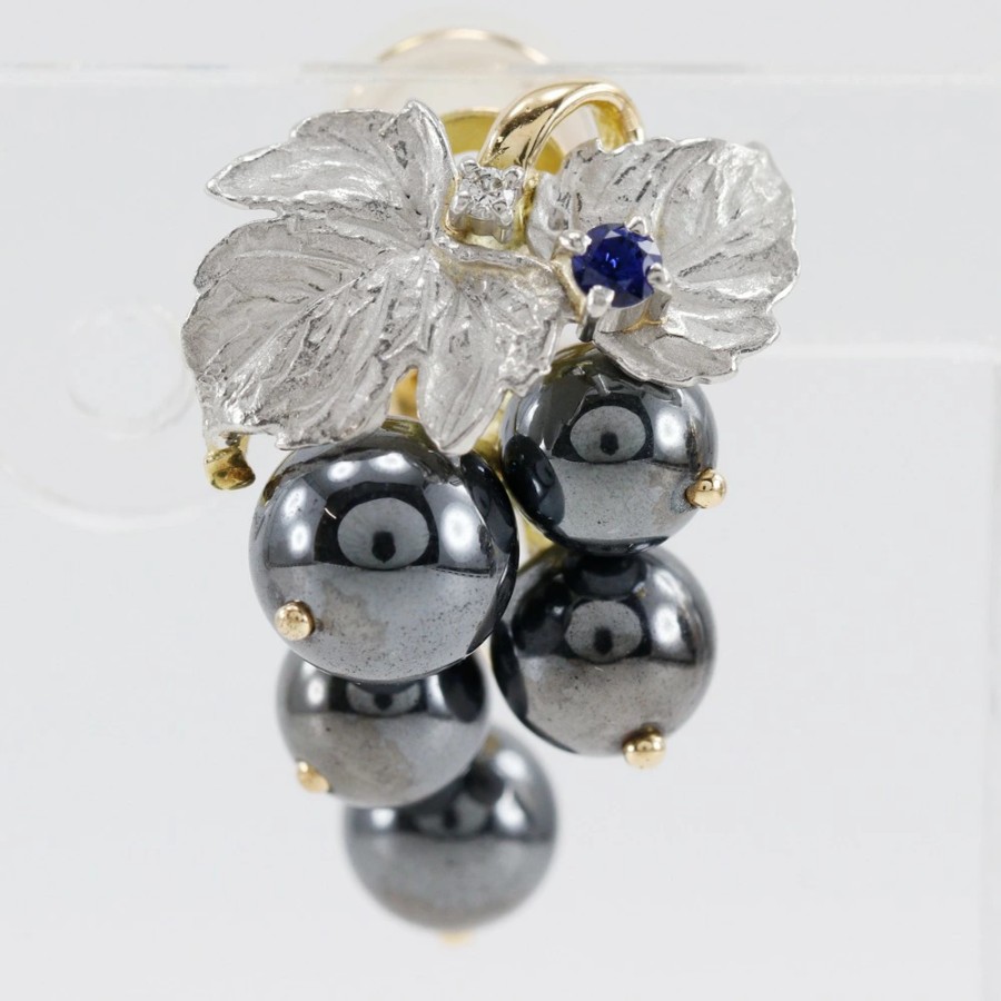 Nobuko Ishikawa Grape Motif Earrings, Pt900 Platinum x K18 Yellow Gold x Hematite x Sapphire x Diamond, Approx. 15g, Moss motif, Women's, [Used] A Rank