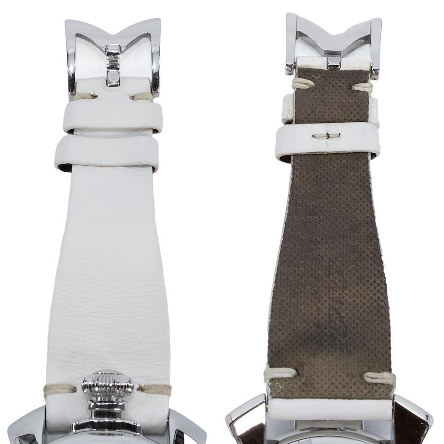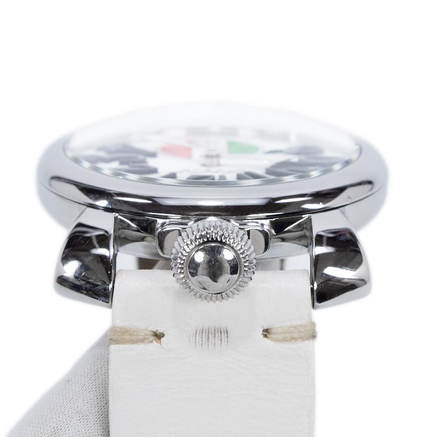 イタリア国旗を模したトリコローレカラーが、ホワイトの文字盤上で鮮やかに躍動します。