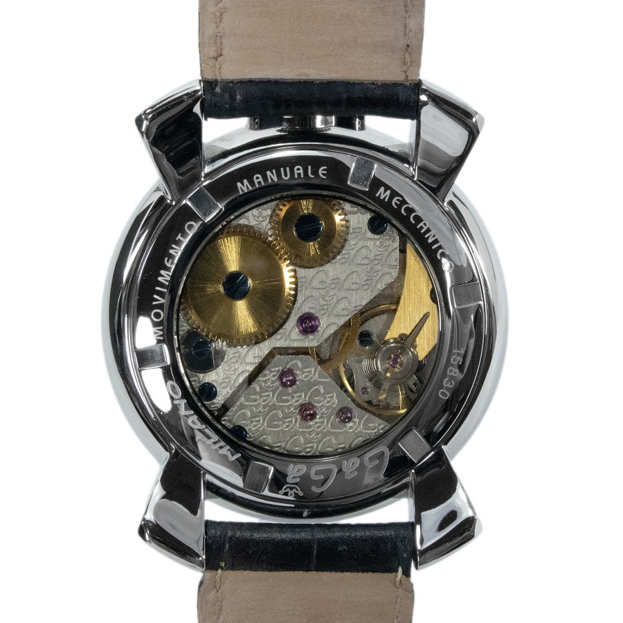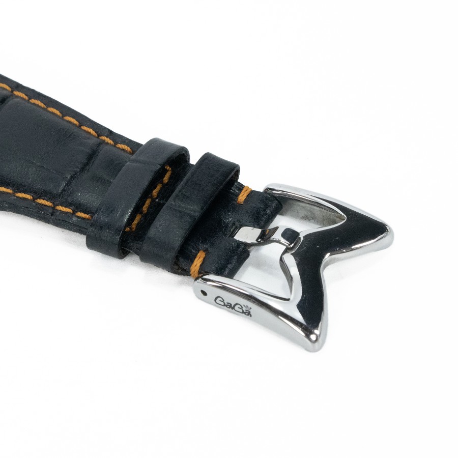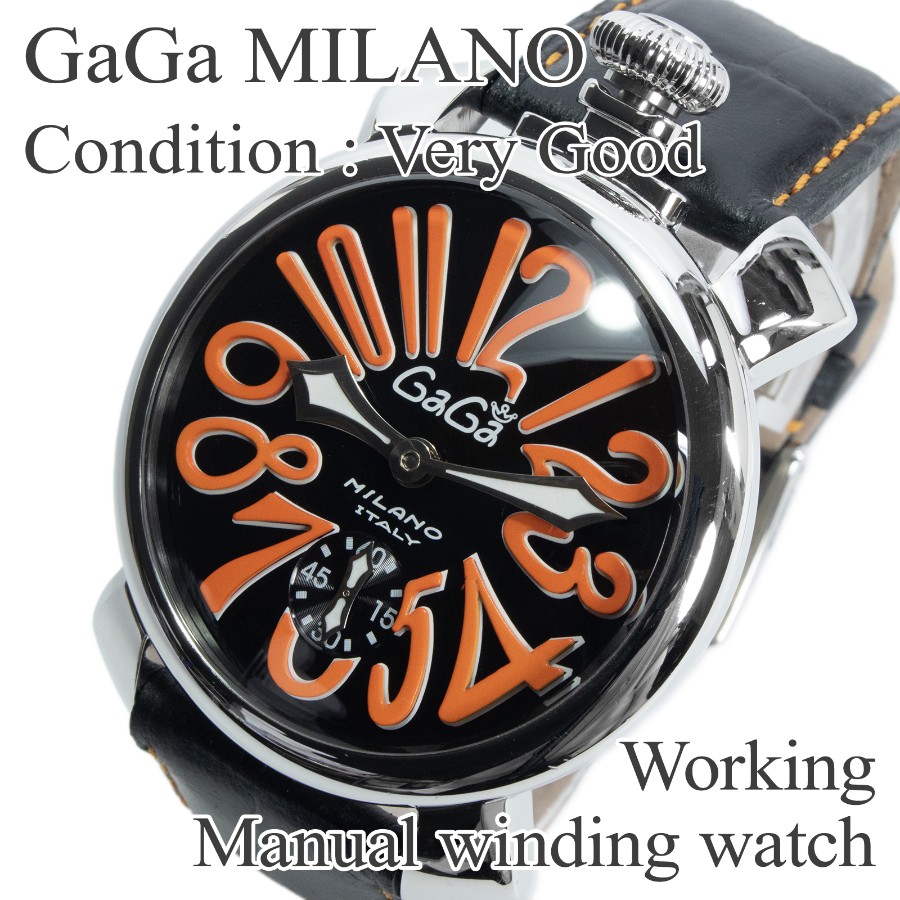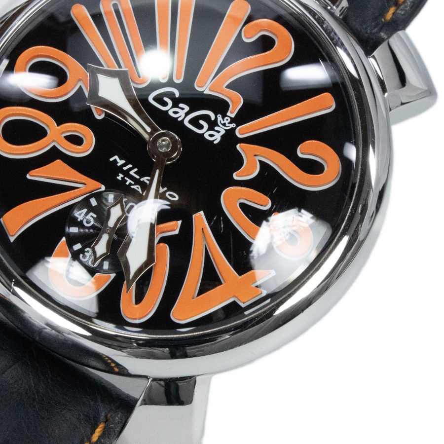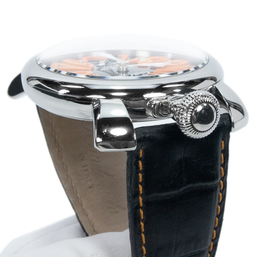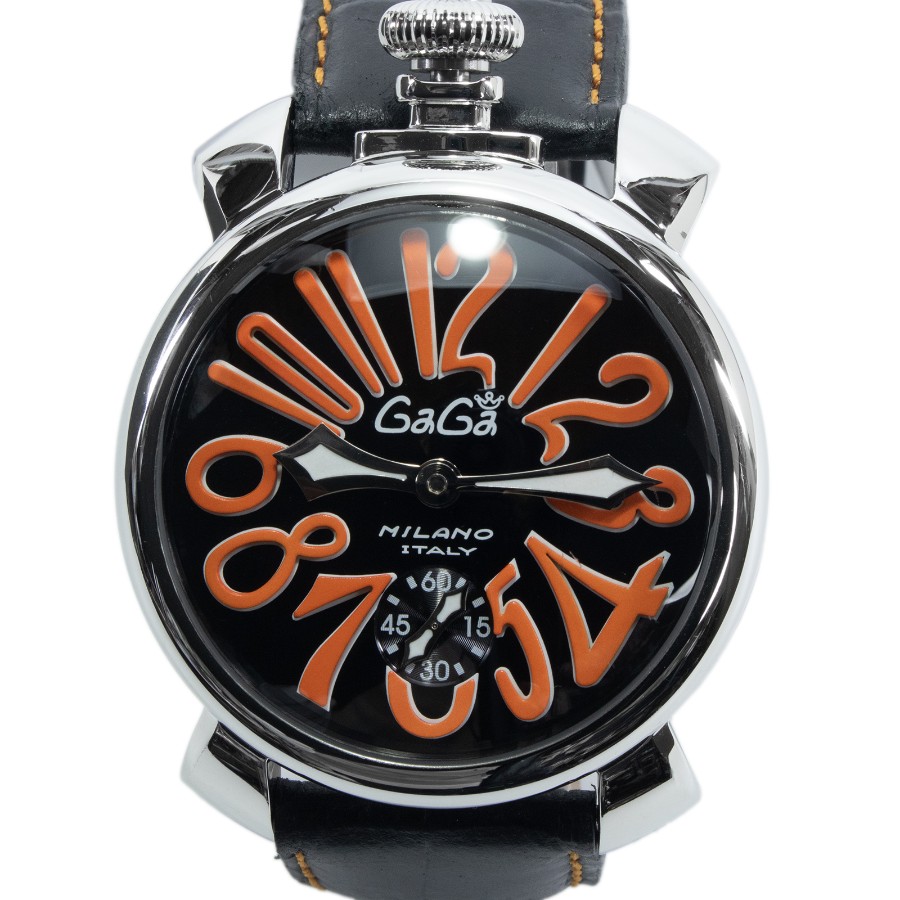 こちらは、ブラックの文字盤に浮かび上がる鮮やかなオレンジの立体インデックスが目を惹く、ガガミラノのマヌアーレ48mm・腕時計でございます。