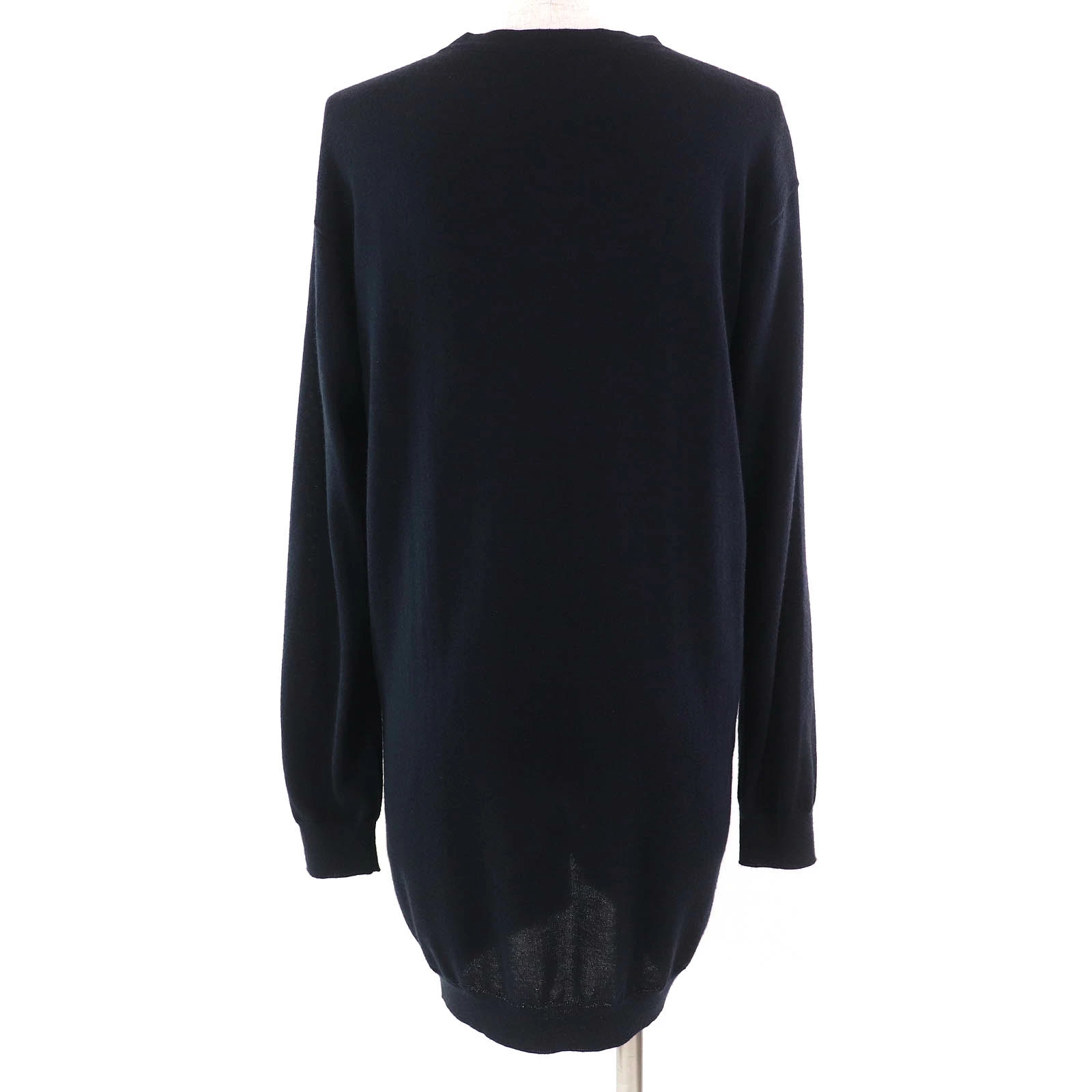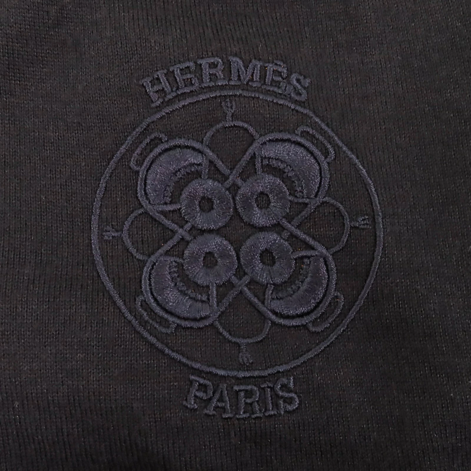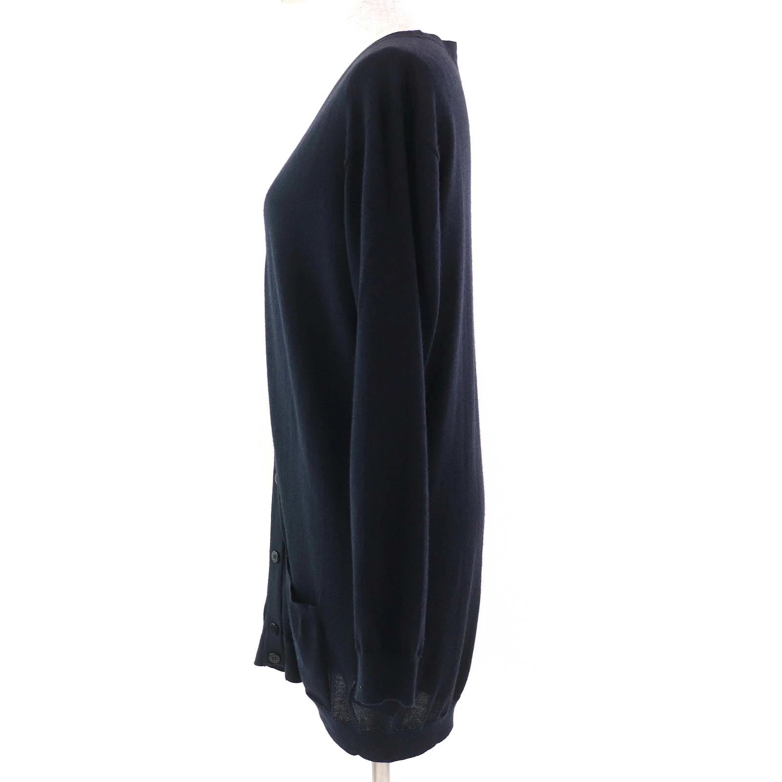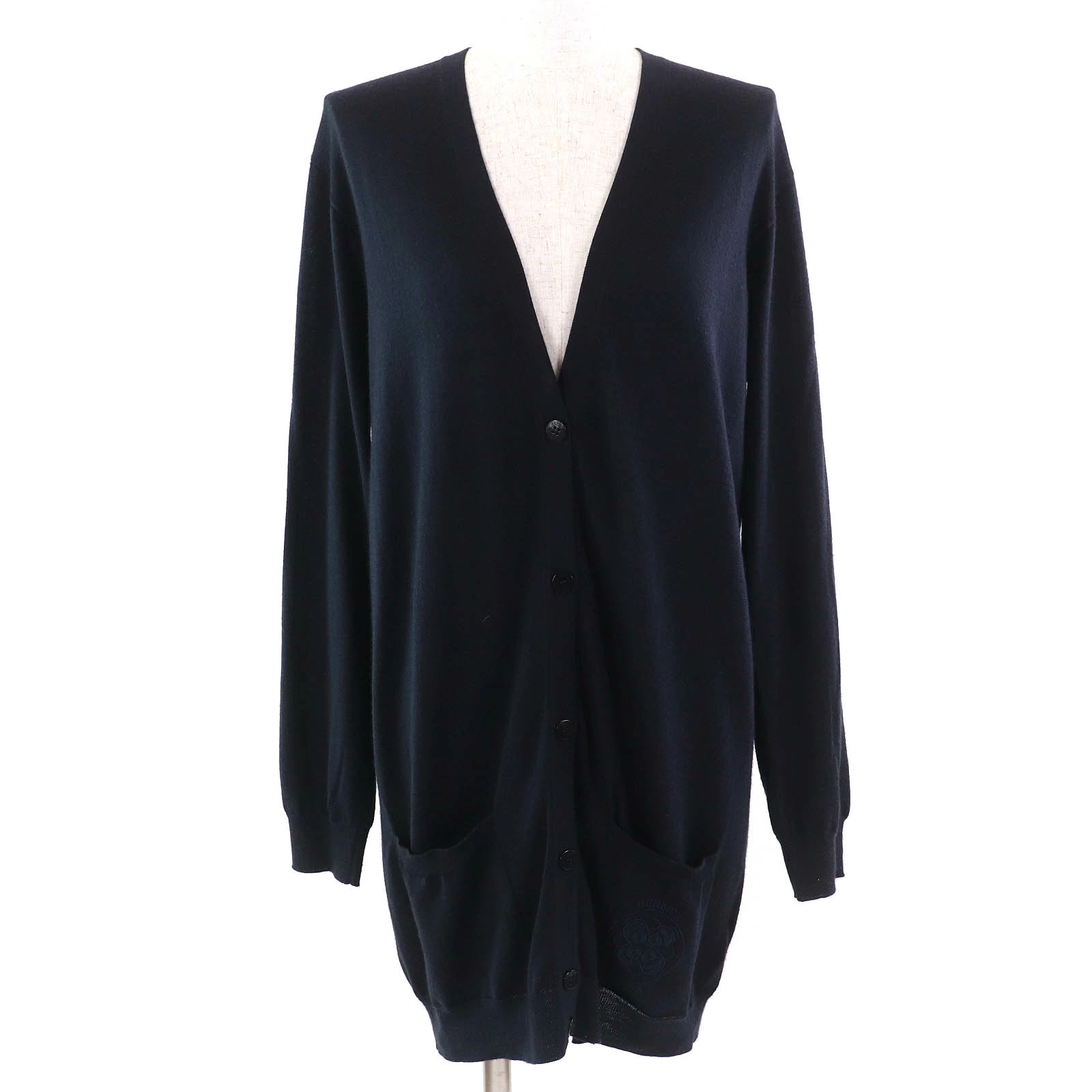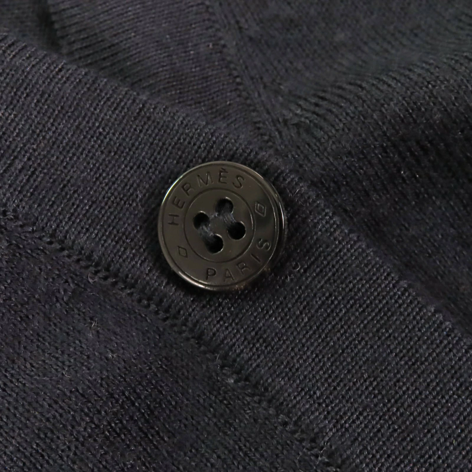 Excellent condition: HERMES cashmere and silk cardigan with embroidered pocket logo, logo buttons, V-neck, long sleeves, navy, size 34, made in Italy. Women's. [Pre-owned]