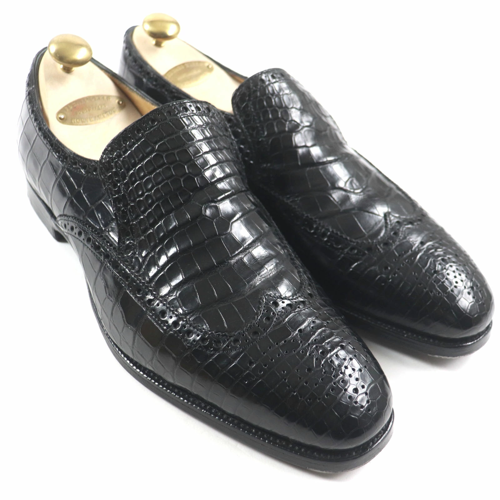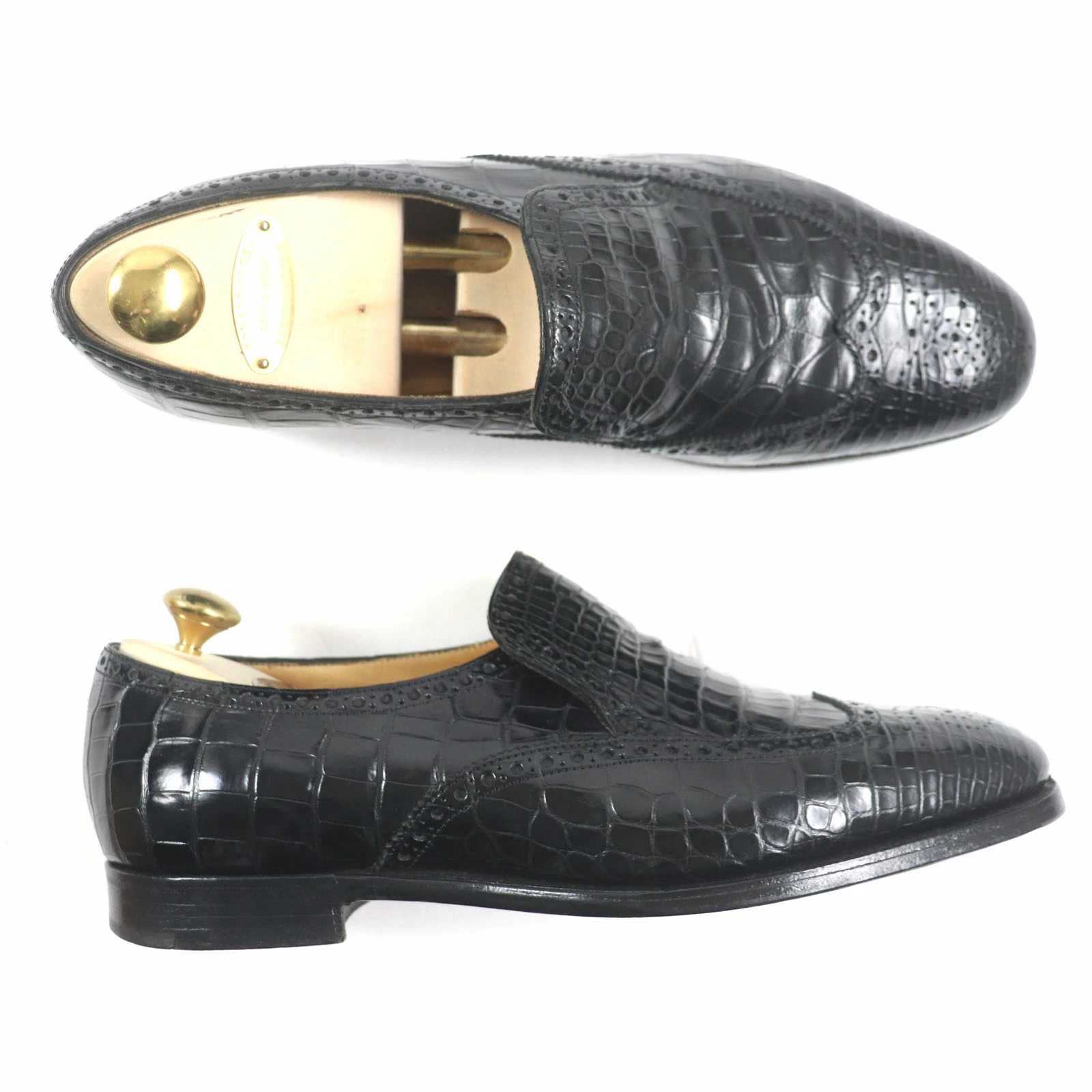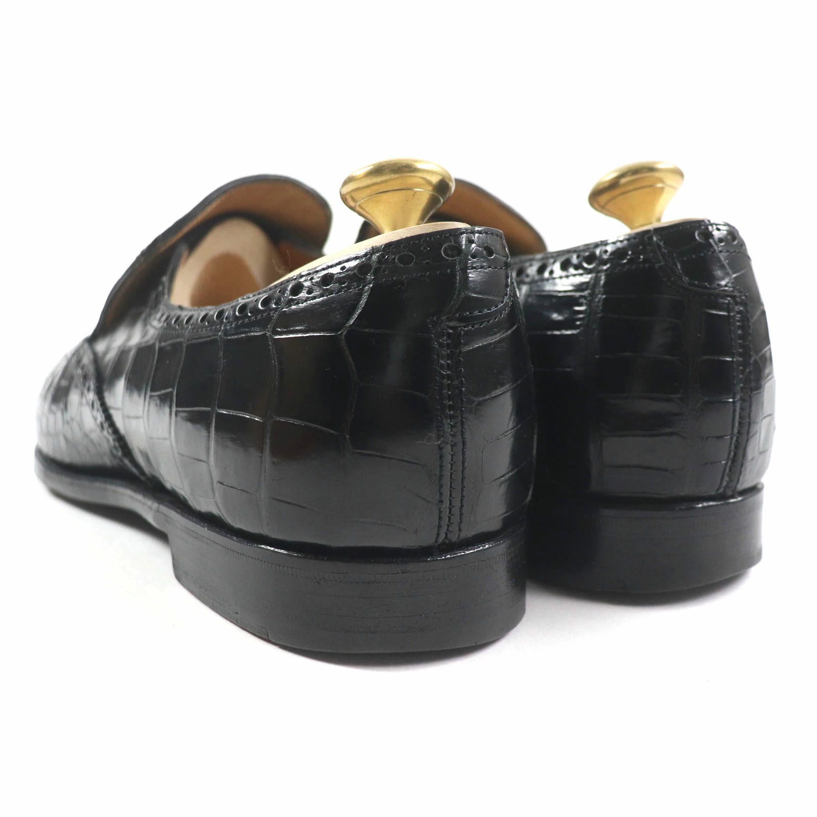 Excellent condition: Edward Green Wigmore wingtip medallion loafers in crocodile leather, black, size 7.5, with dust bag. Made in England. Pre-owned.
