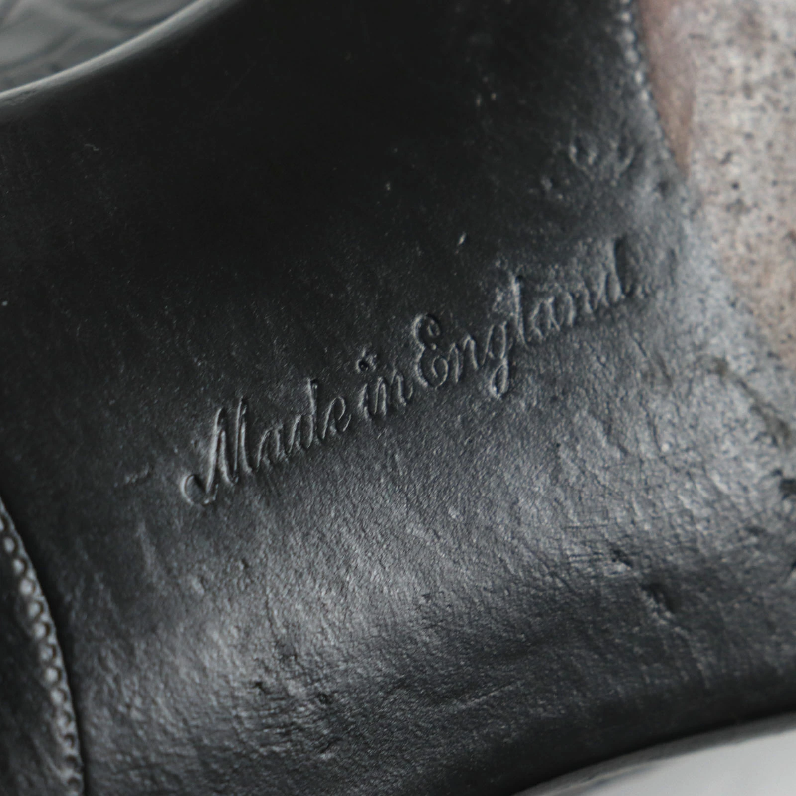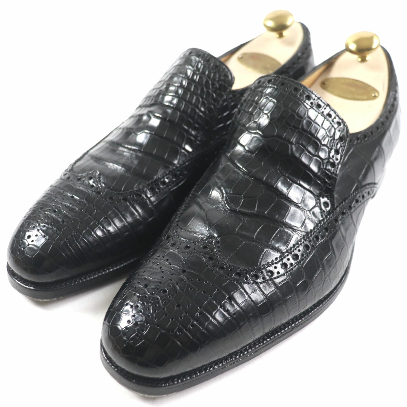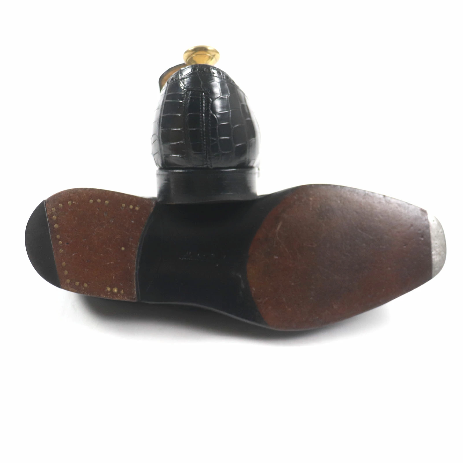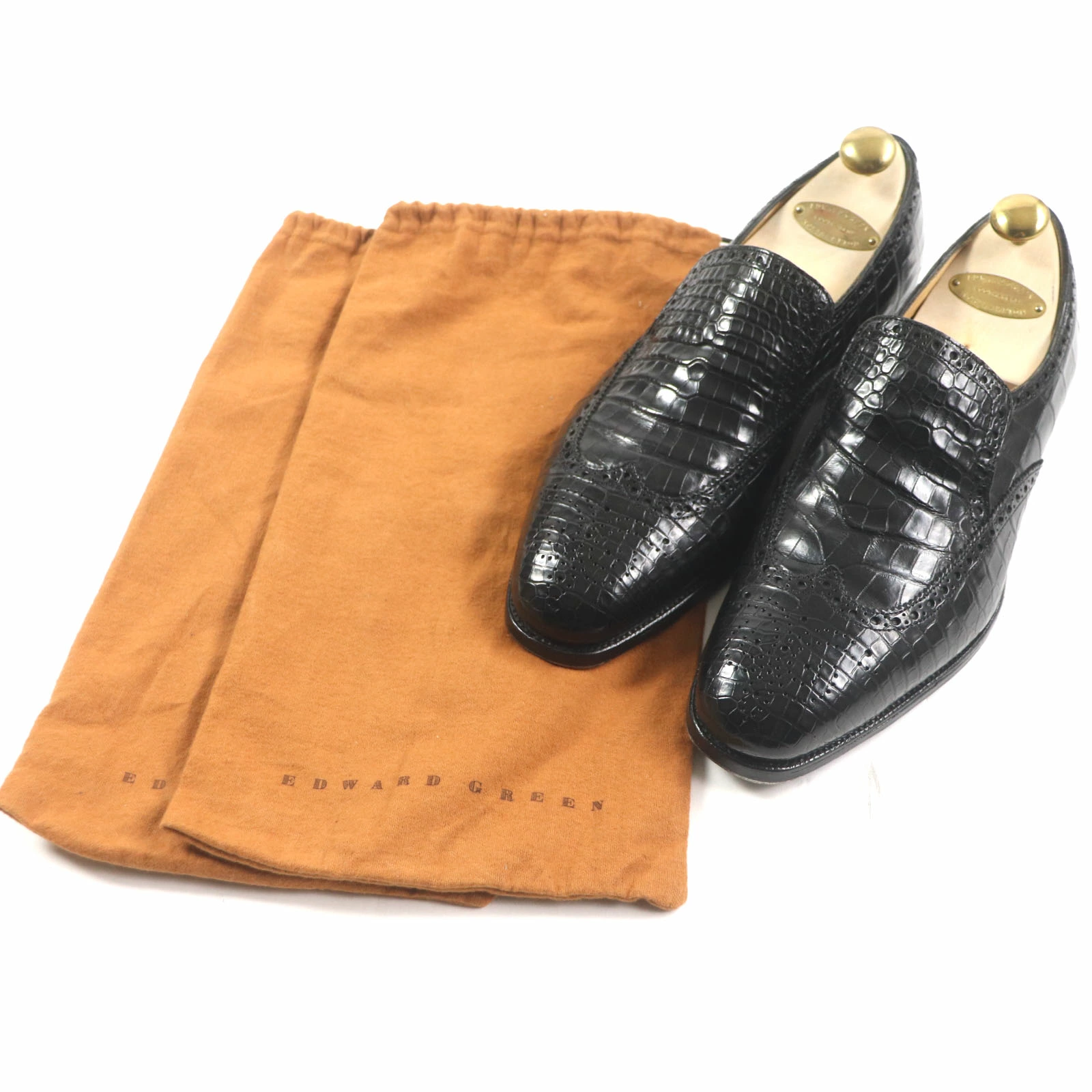 Excellent condition: Edward Green Wigmore wingtip medallion loafers in crocodile leather, black, size 7.5, with dust bag. Made in England. Pre-owned.