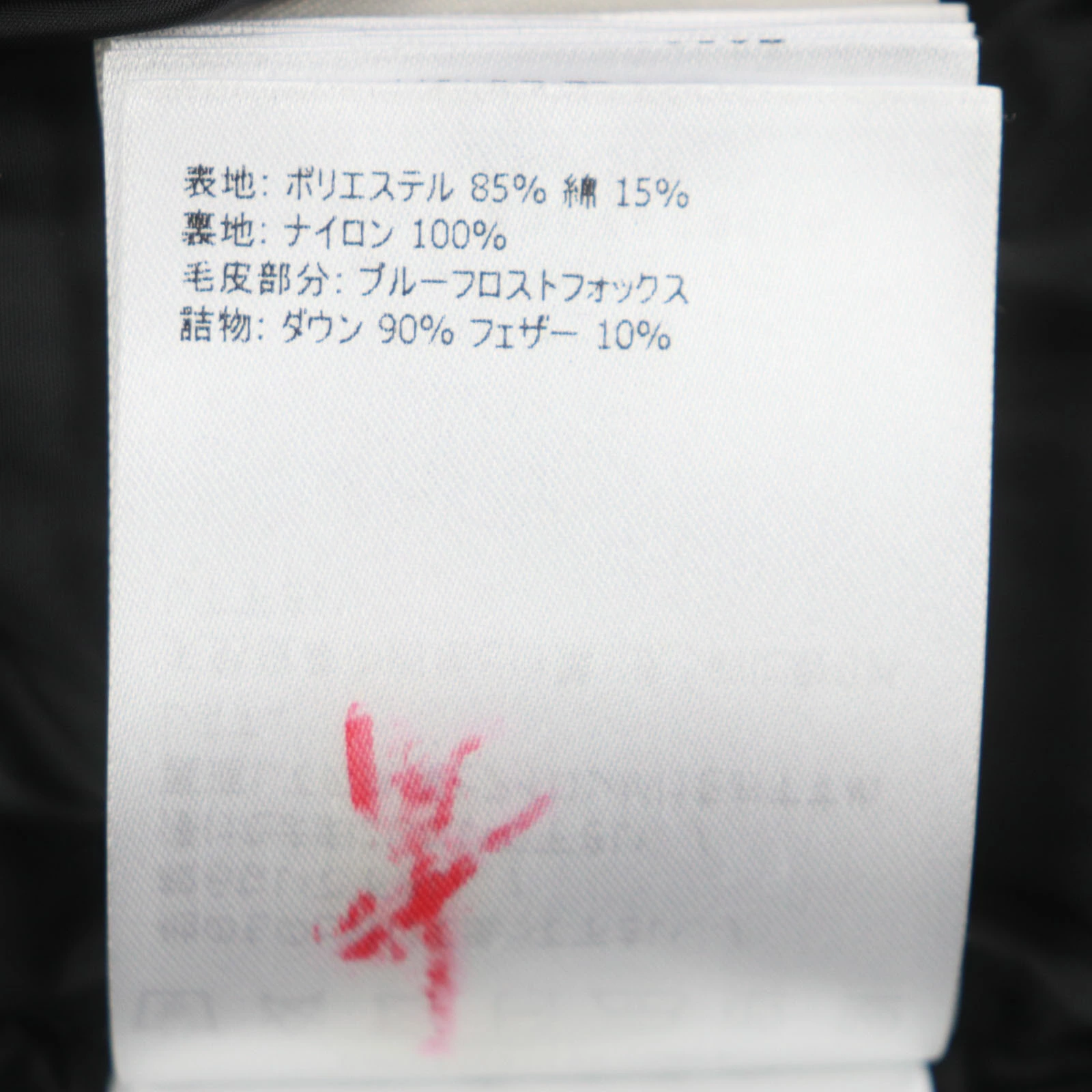 | 素材 (material) | 表地:ポリエステル85% :コットン15% 裏地:ナイロン100% ファー:ブルーフロストフォックス 詰物:ダウン90% :フェザー10% | ||||||||||||||||