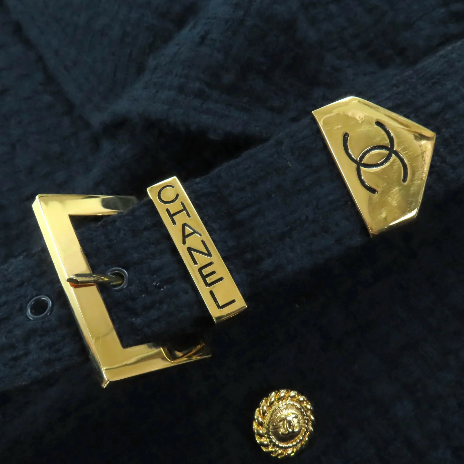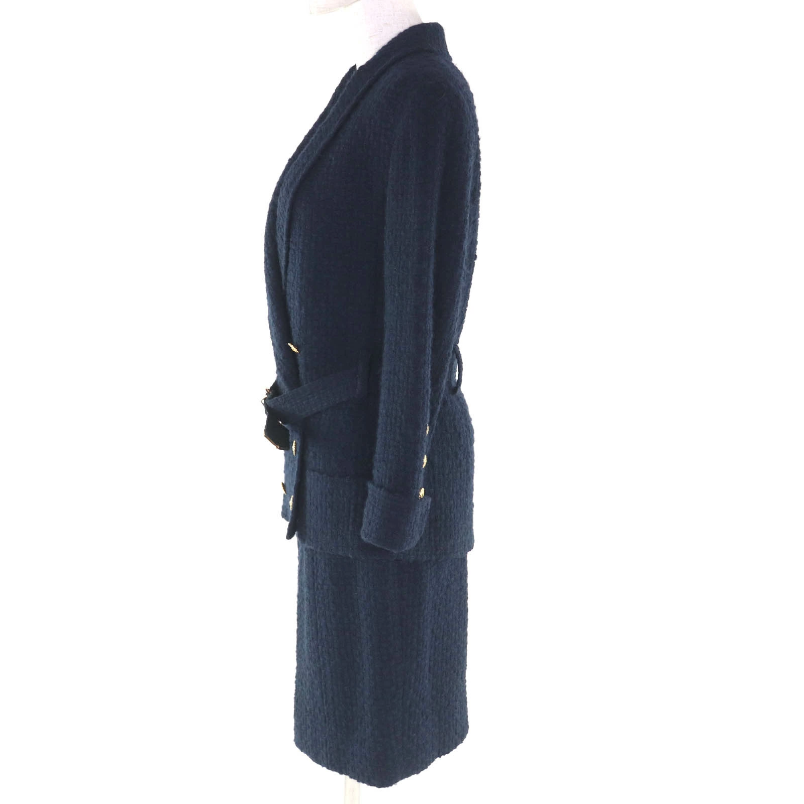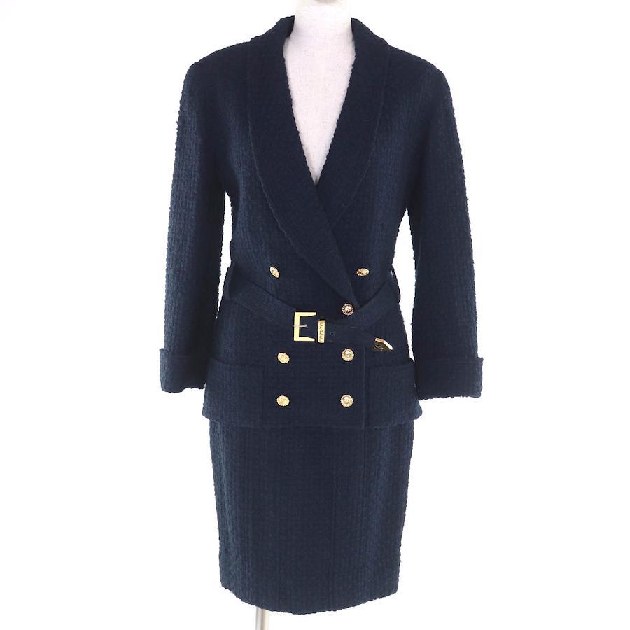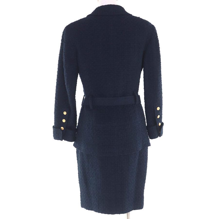 Excellent condition: CHANEL BOUTIQUE vintage 90s wool tweed suit with Coco Mark buttons and logo belt, navy, size 36, made in France. Women's. [Pre-owned]