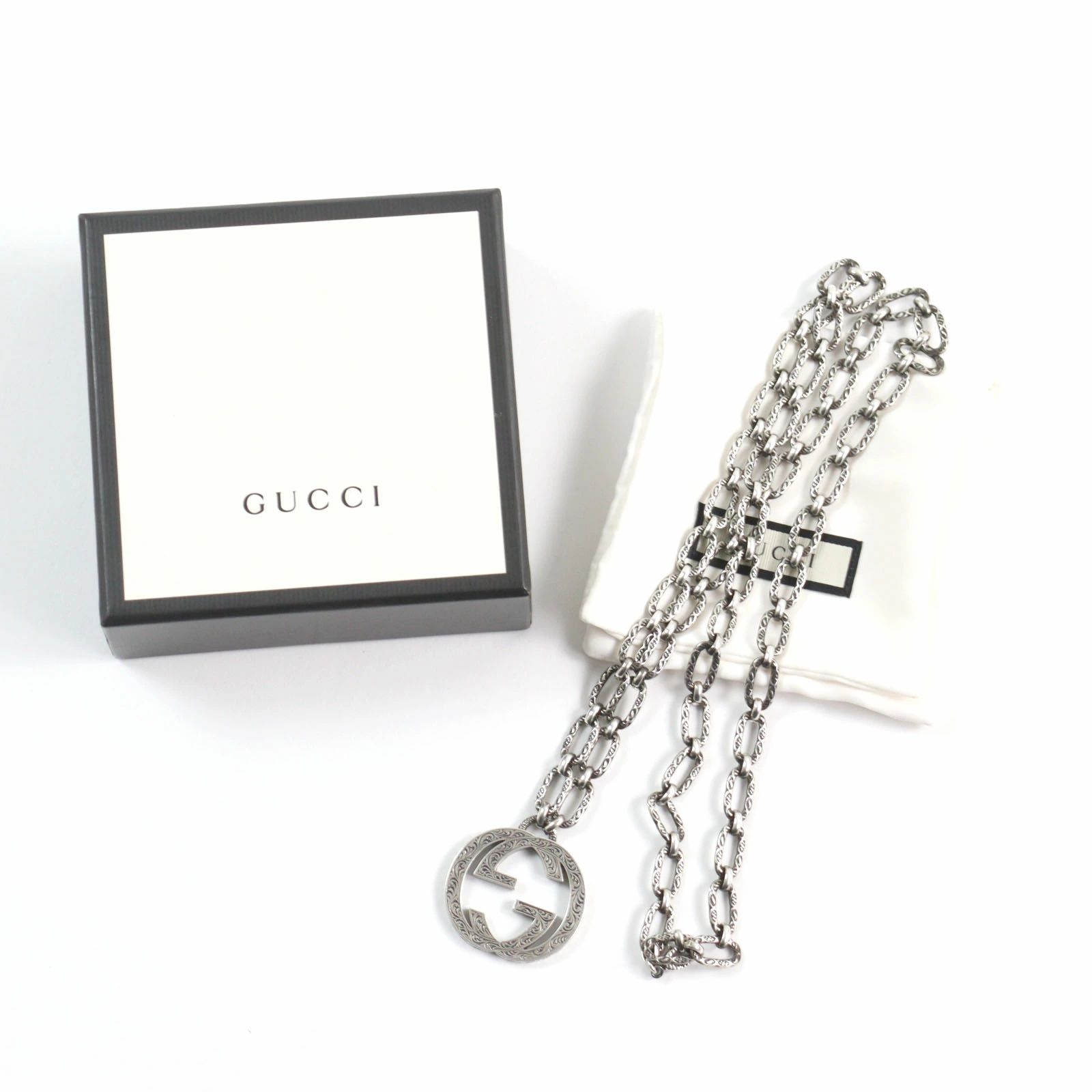 Excellent condition GUCCI 524890 Arabesque Interlocking G Textured Long Chain Necklace, AG925 Silver, with box and dust bag, Made in Italy, Men's [Pre-owned]