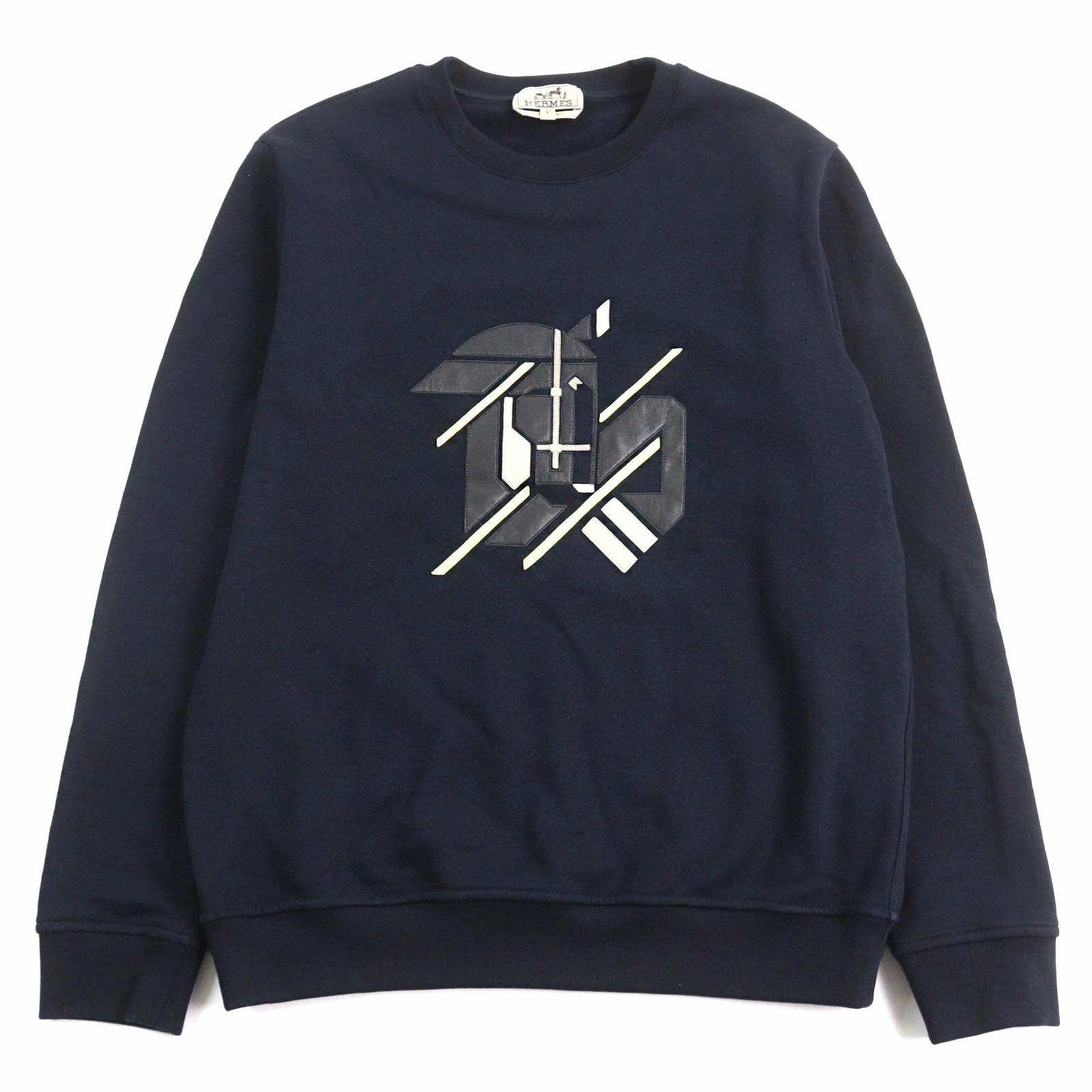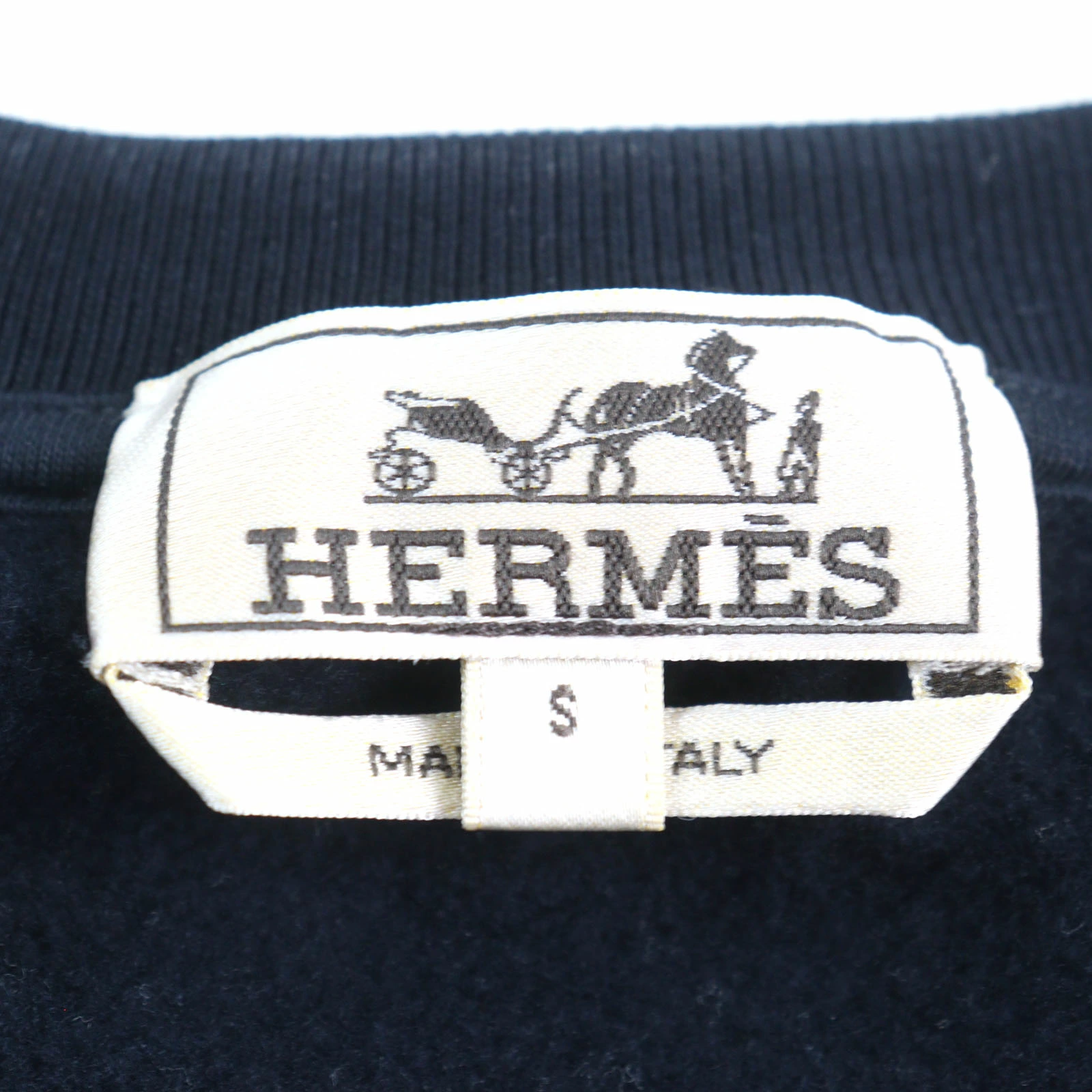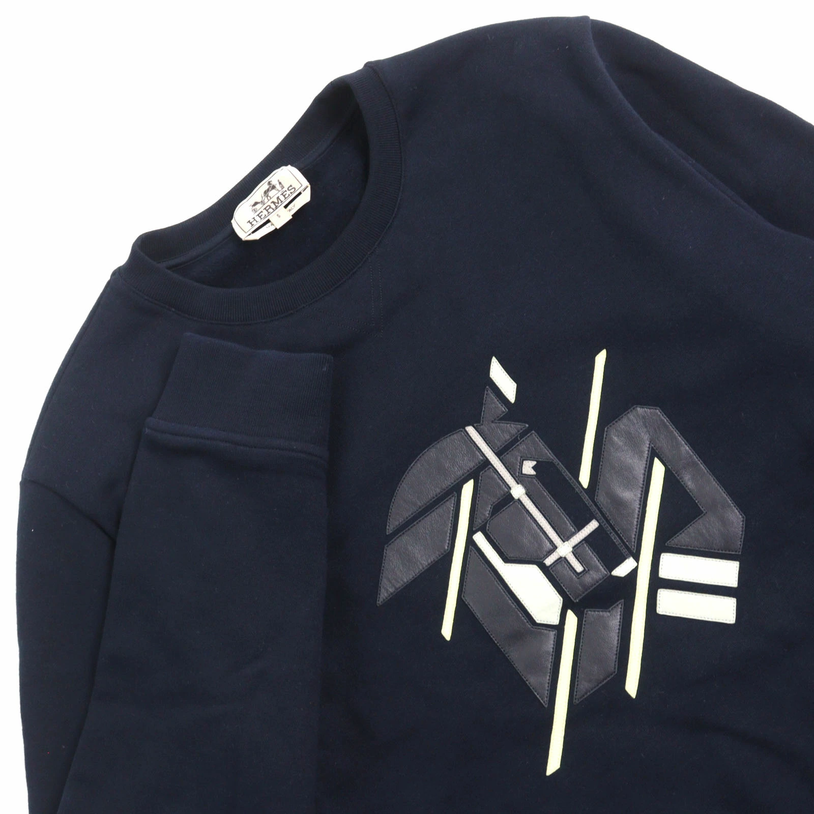 Excellent condition HERMES 23SS Chevaux en Symmetrie crew neck pullover sweatshirt, 100% cotton, sheepskin leather with leather patches and a brushed lining, size S, navy, made in Italy, authentic, pre-owned.