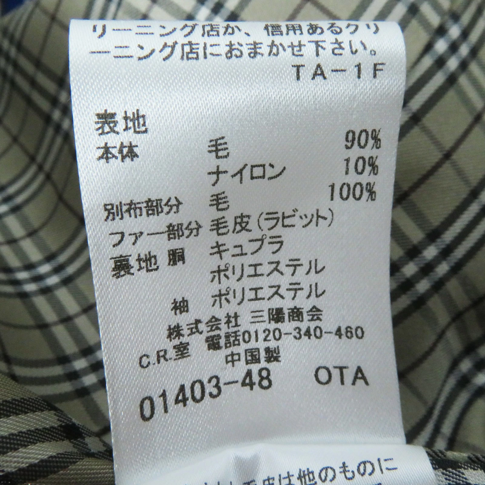 | 素材 (material) | 表地:ウール90% :ナイロン10% 一部:ウール100% ファー:ラビット 裏地:キュプラ :ポリエステル | ||||||||||||||||