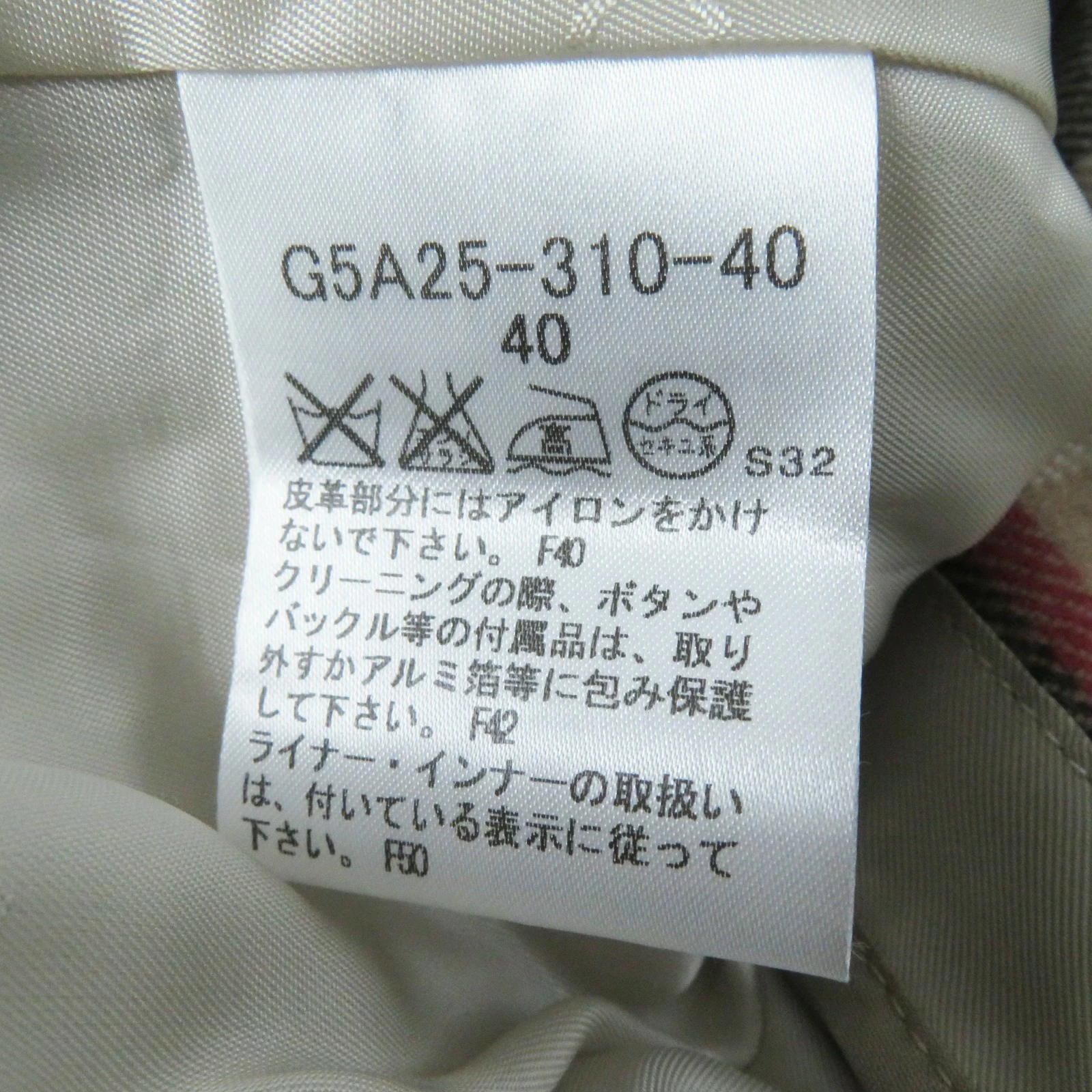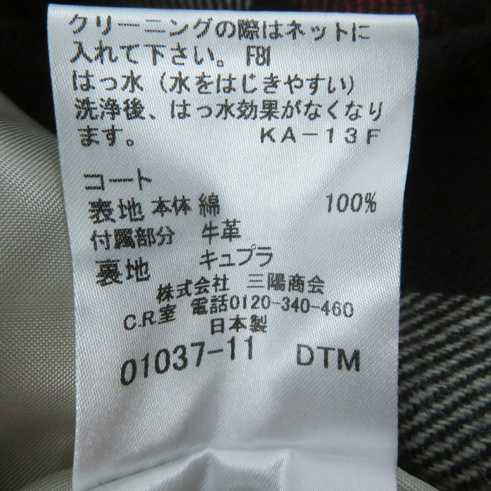 | 素材 (material) | 表地:コットン100% 裏地:キュプラ 一部:牛革 ライナー:ウール90% :ナイロン10% :キュプラ100% | ||||||||||||||||