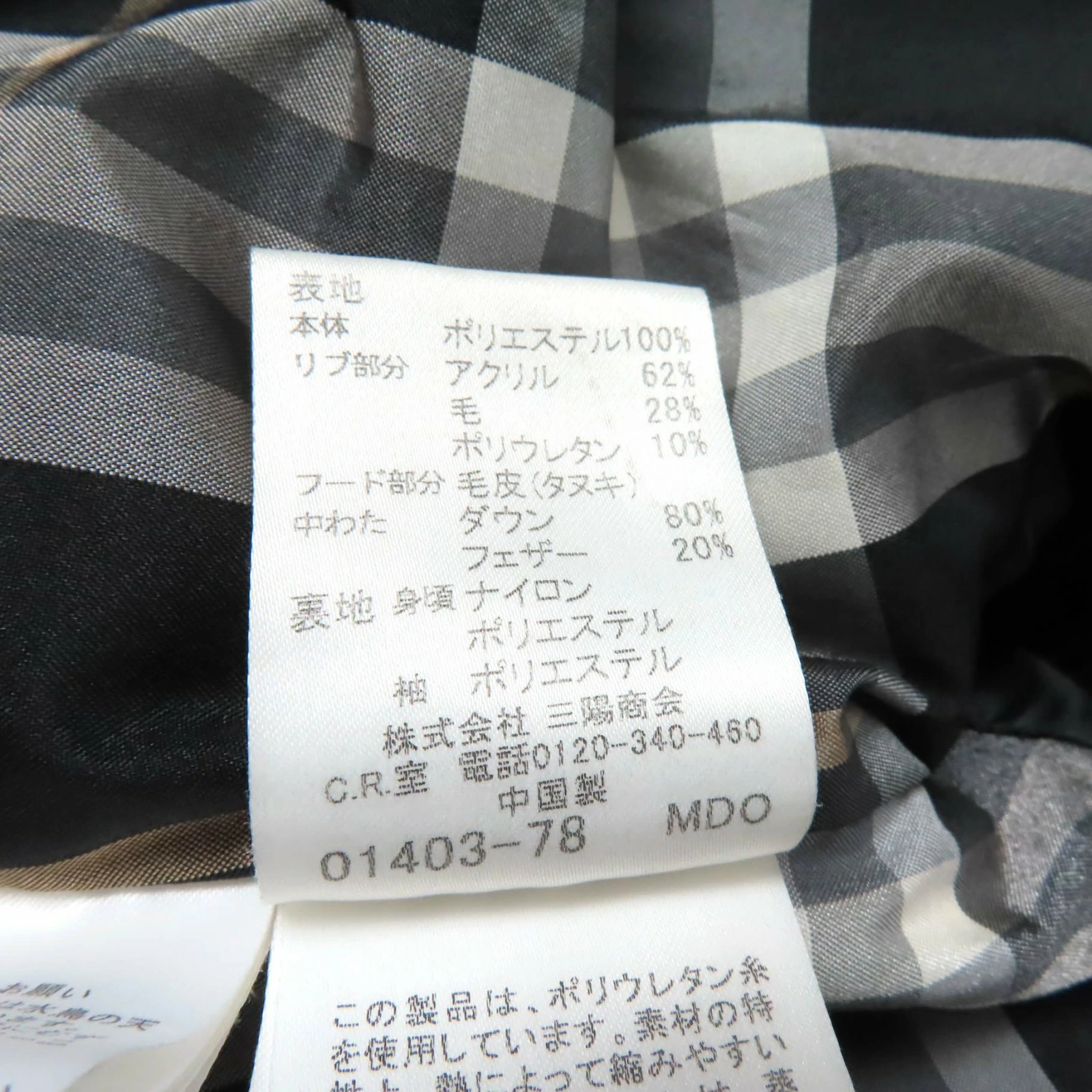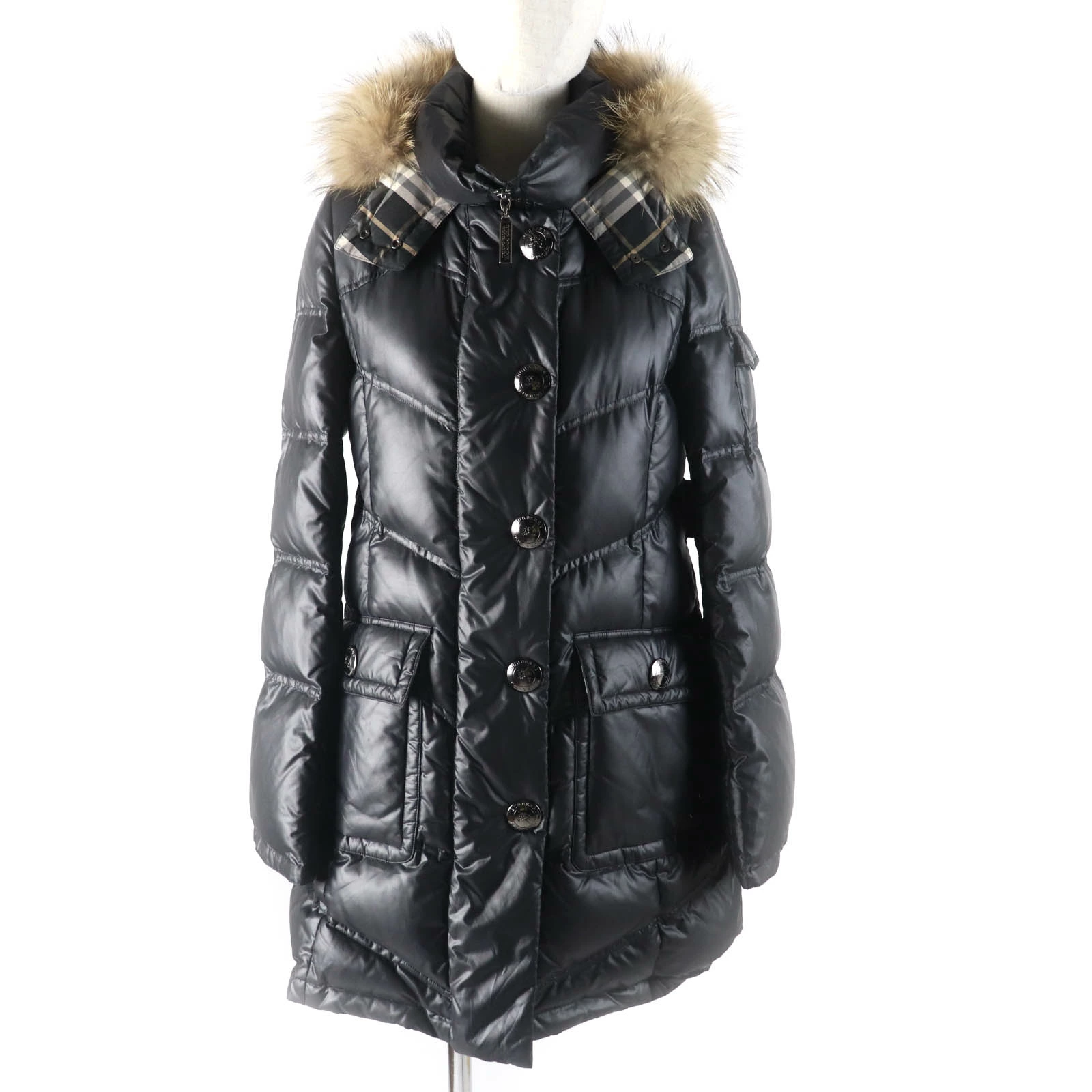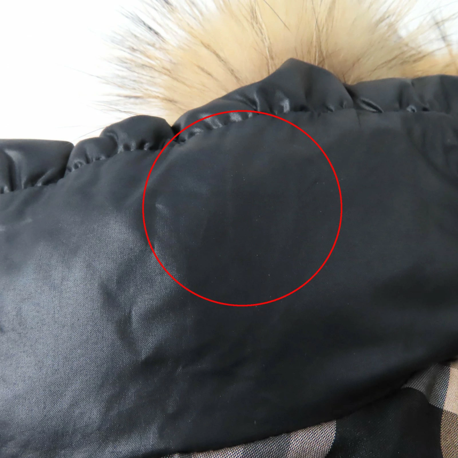 Excellent condition BURBERRY BLUE LABEL FRF09-693-09 raccoon fur down coat with hood and belt, checkered lining, black, size 40, authentic, women's [pre-owned]