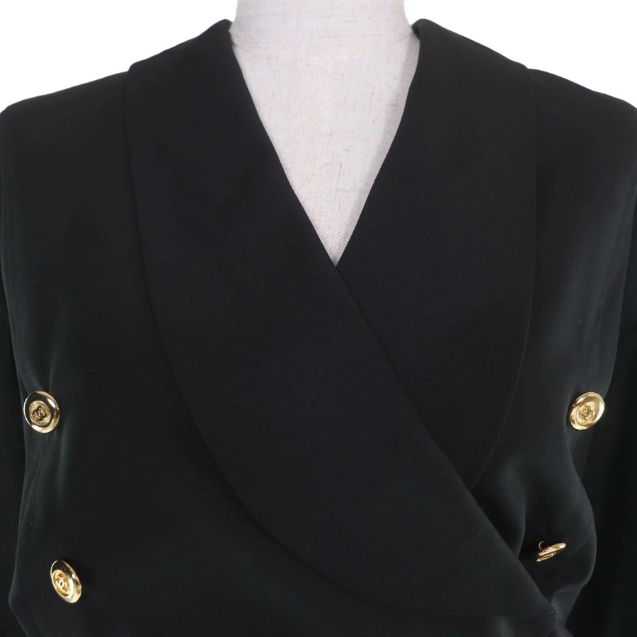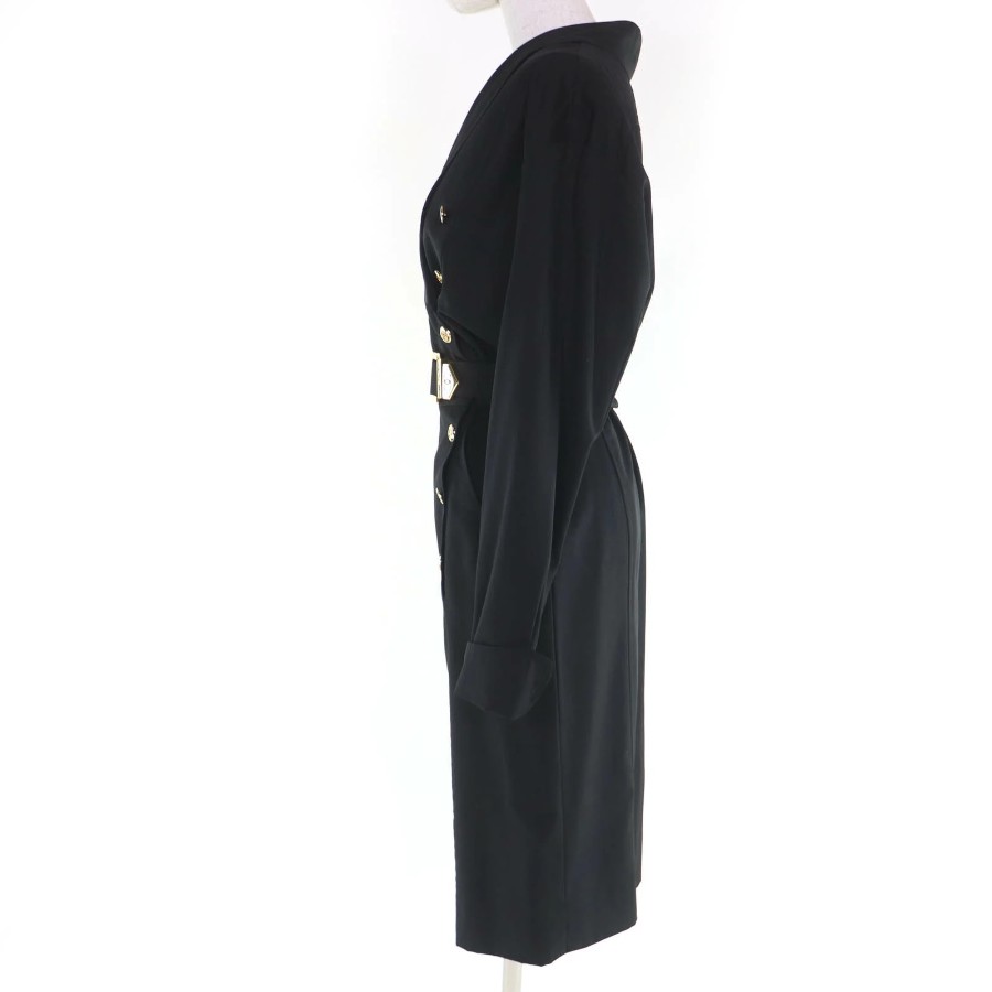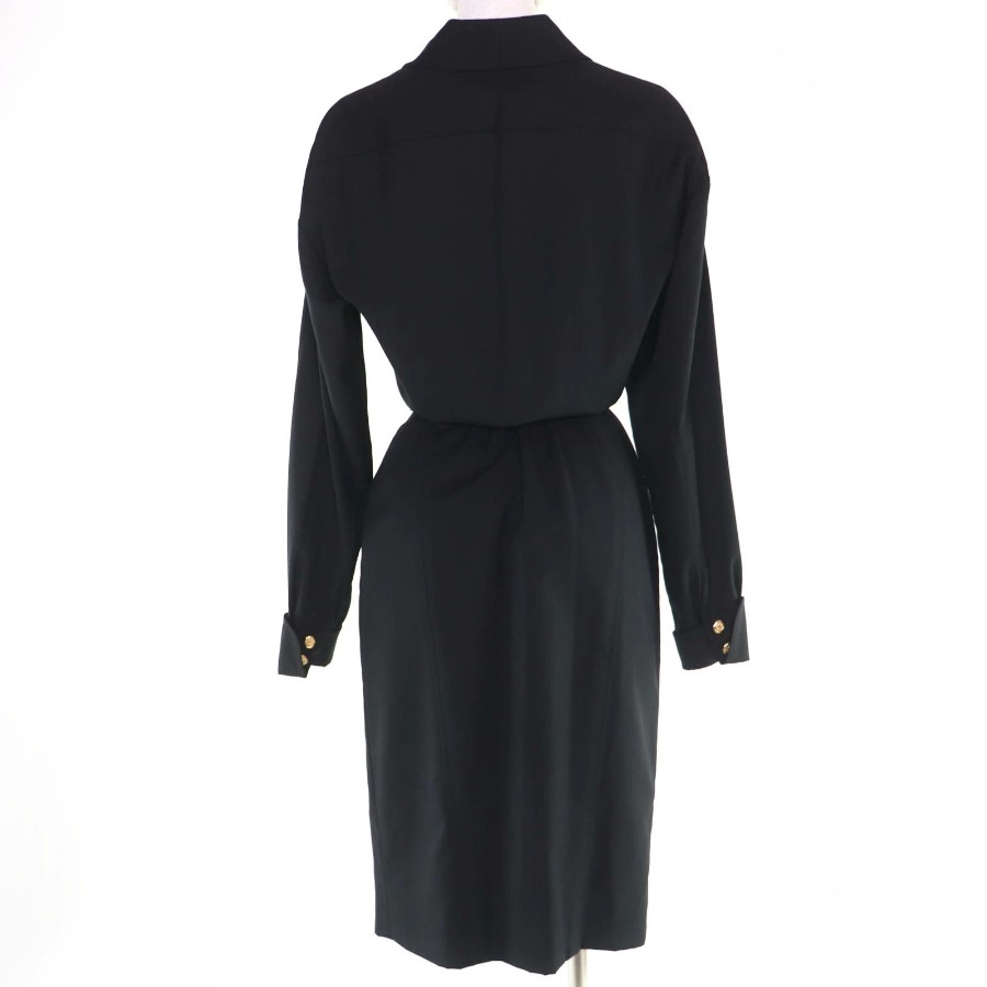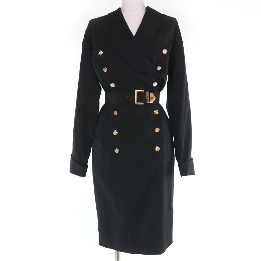 Excellent condition☆CHANEL vintage 23572 100% wool, Coco Mark button, belted, long-sleeved, fitted dress, black, size 34, made in France, women's [used]