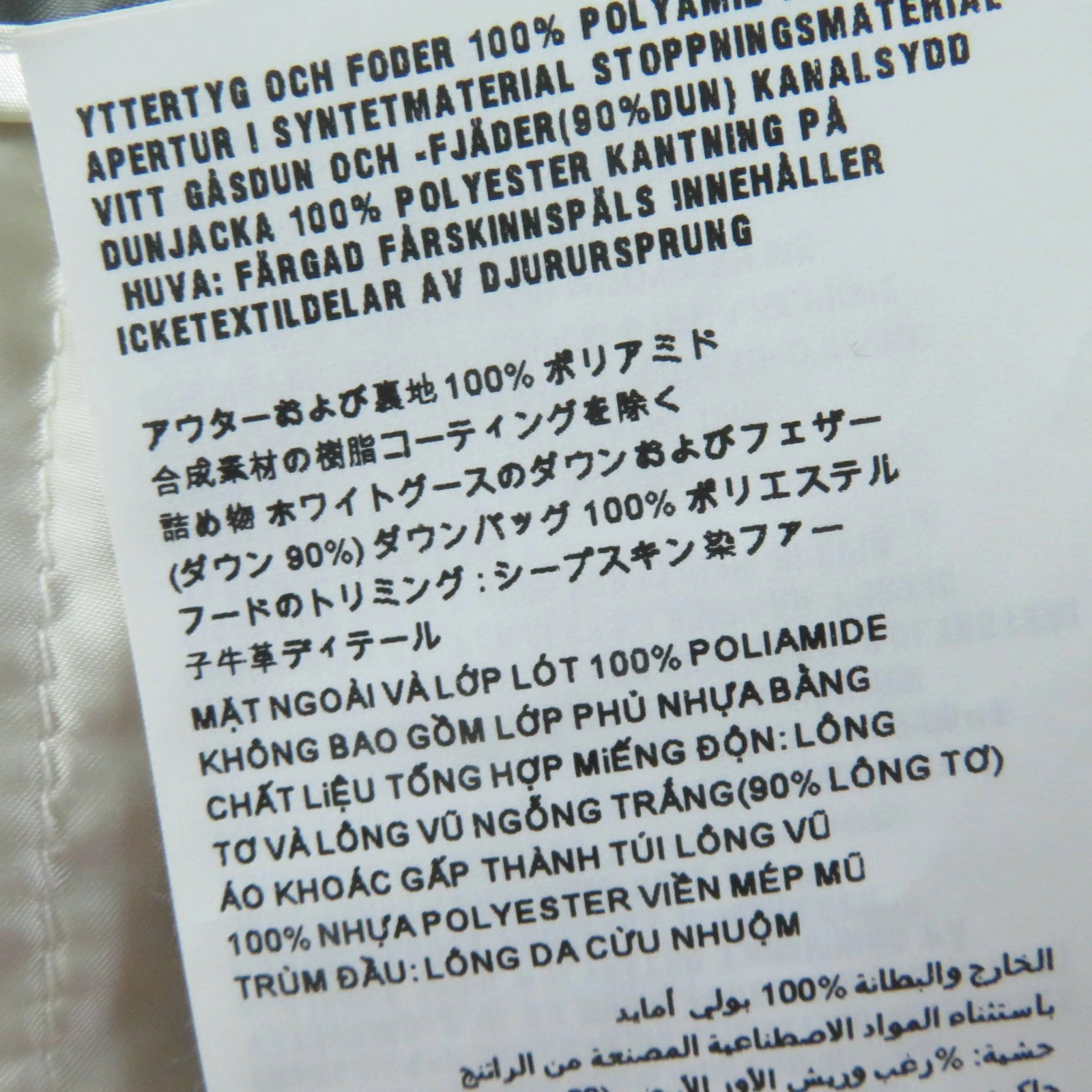 | 素材 (material) | 本体:ポリアミド(ナイロン)100% 裏地:ポリアミド(ナイロン)100% 中綿:ダウン90% :フェザー10% 一部:ポリエステル100% ファー:シープスキン 本体:ポリアミド(ナイロン)100% 裏地:ポリアミド(ナイロン)100% 中綿:ダウン90% :フェザー10% 一部:ポリエステル100% ファー:シープスキン | ||||||||||||||||