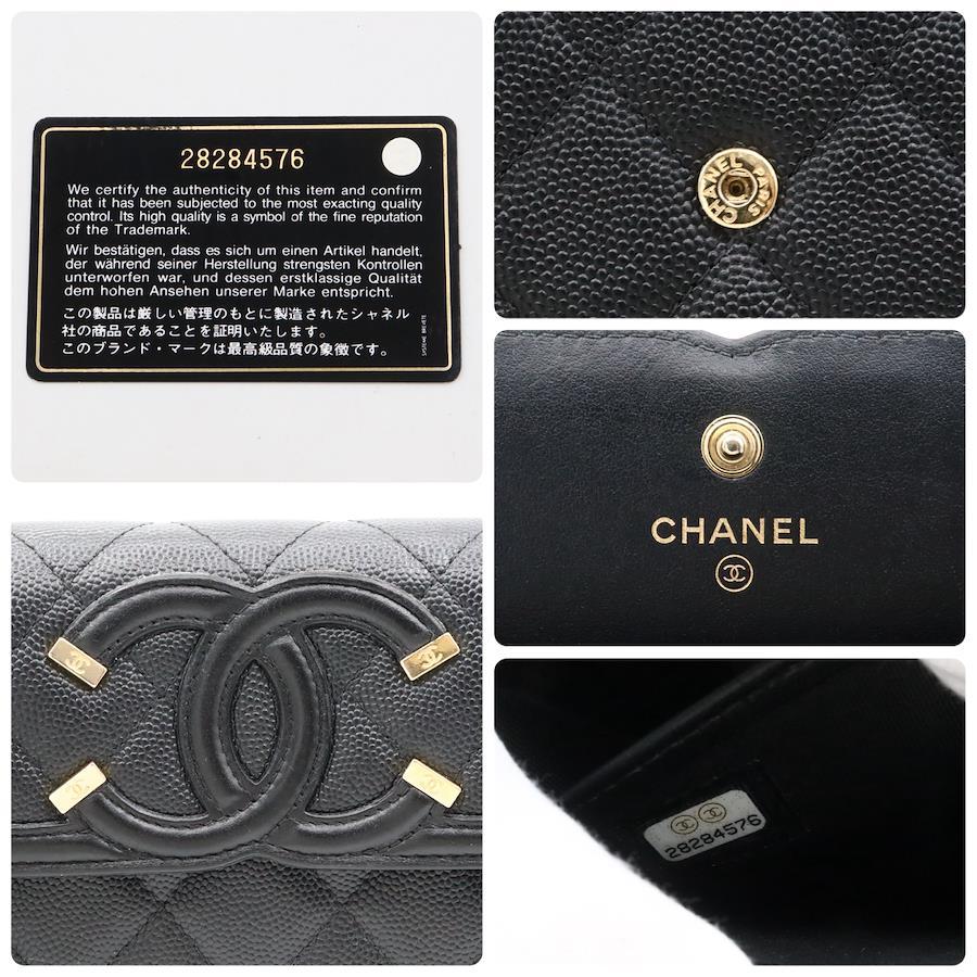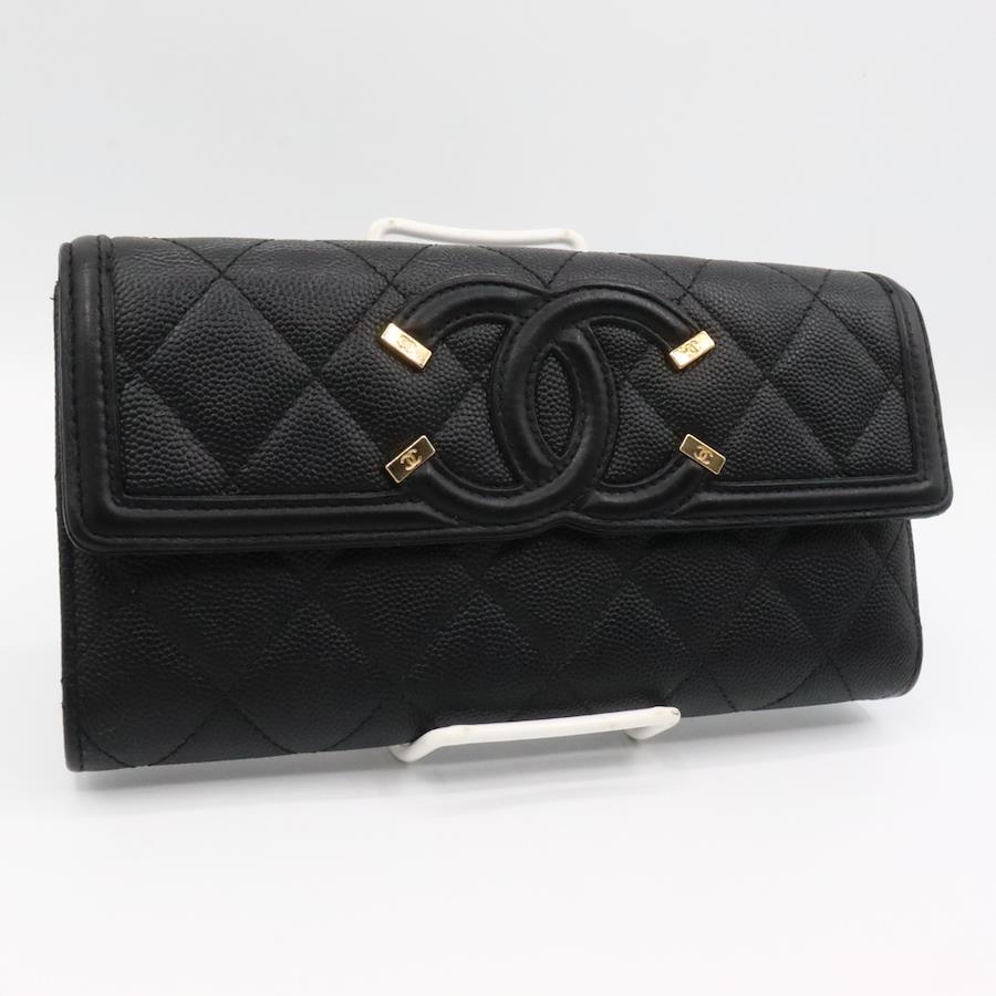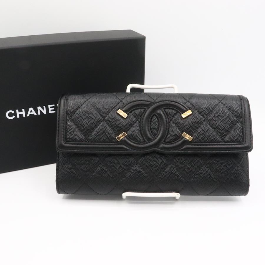 【商品説明】品名 キャビアスキン CCフィリグリー 長財布 ブラック ゴールド金具シリアルナンバー 28284576サイズ 約縦10センチ 横19センチ 厚み4センチ仕様 小銭入れ1 札入れ2 ポケット2 カード入れ12付属品 箱 保存袋 ギャランティカード【商品状態】剥がれ、ベタつきありません。ファスナースムーズです。ボタンしっかりとまります。若干のスレ、ヨレがあります。届いたらすぐに気持ちよくお使いいただけるコンディションです。この機会に是非お買い求めください