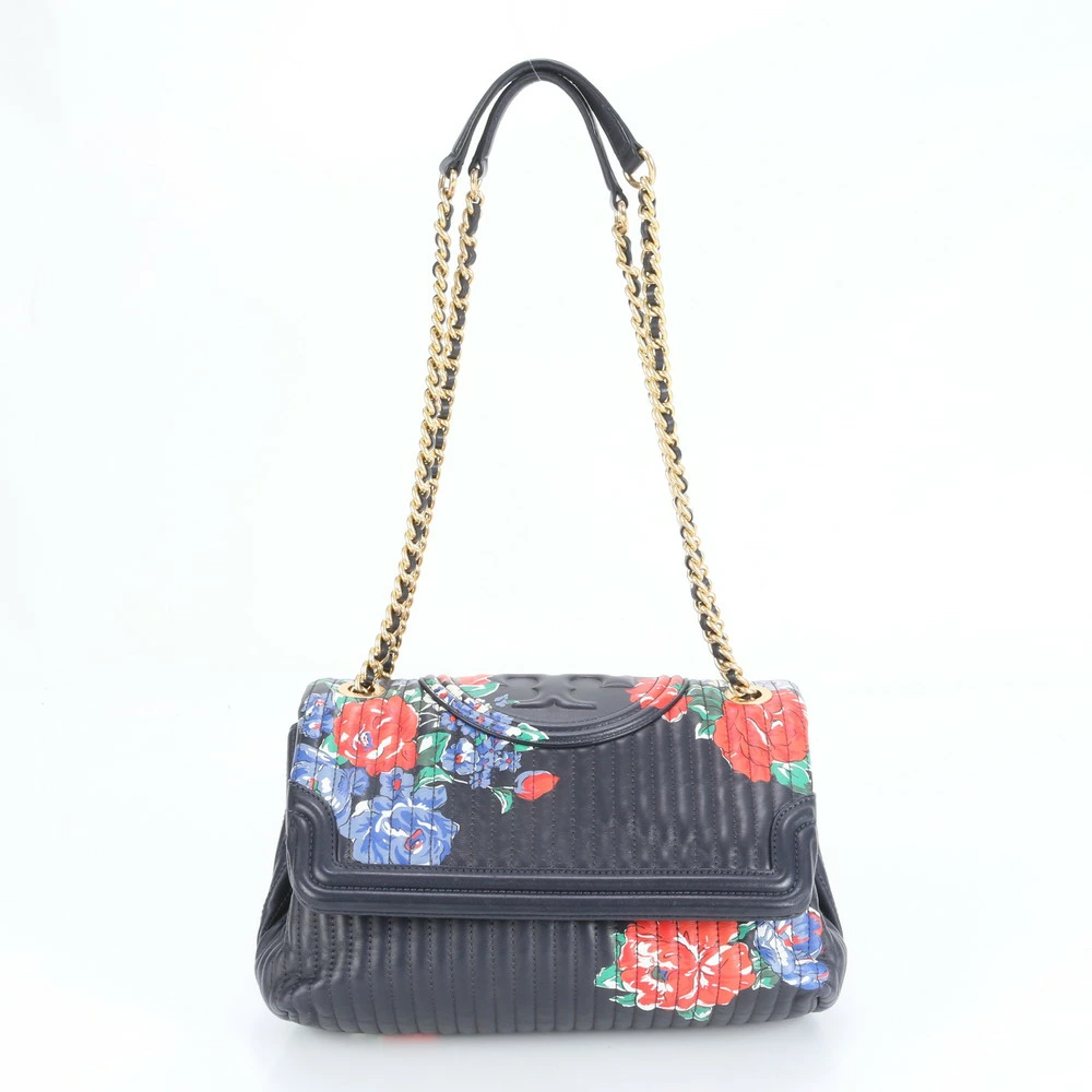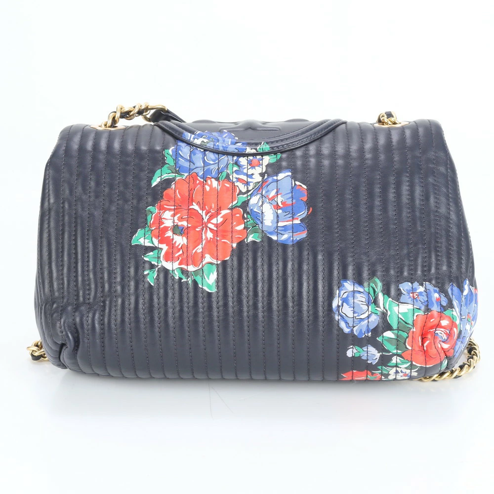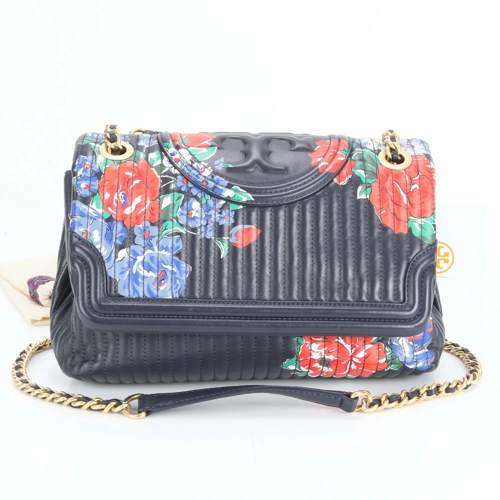 Excellent condition Tory Burch floral leather gold chain shoulder bag in navy blue, stylish for women, RUE CU19-4